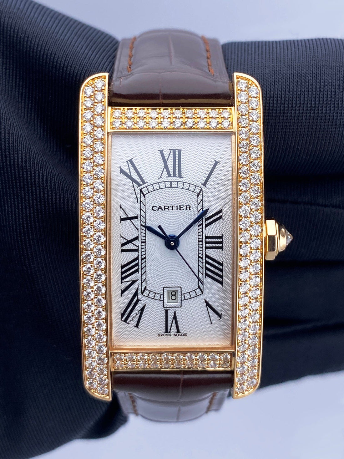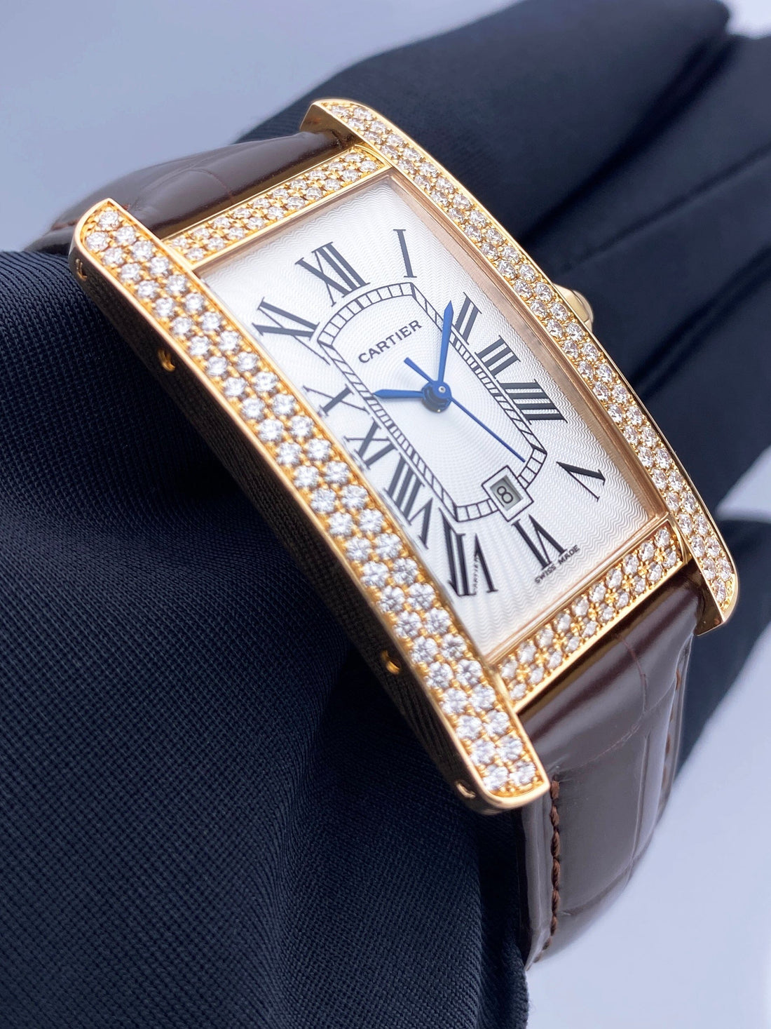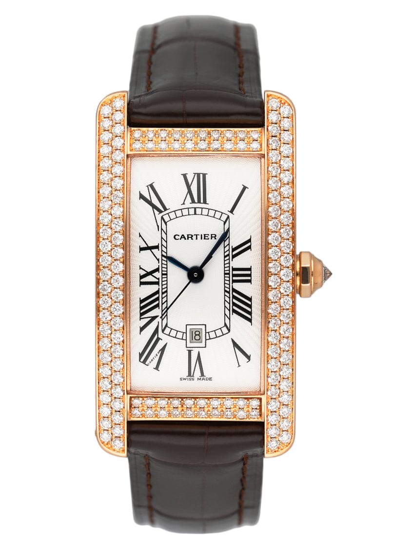 Cartier Tank Americaine WB704751 / 2504 Ladies Watch. 23mm 18K rose gold case with factory diamond. Silver dial with blue hands and black Roman numerals hour marker. Minute marker in the inner dial. Date display at 6 o'clock. Brown leather strap with 18K rose gold deployment buckle. Will fit up to a 6-inch wrist. Sapphire crystal. 18K rose gold case back. Automatic self-winding movement.