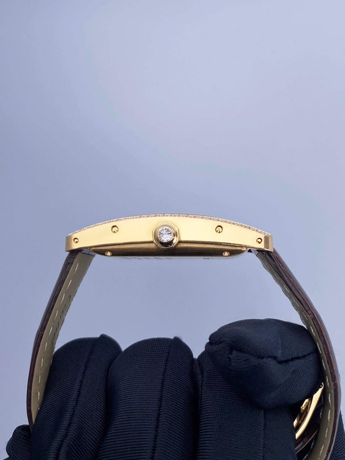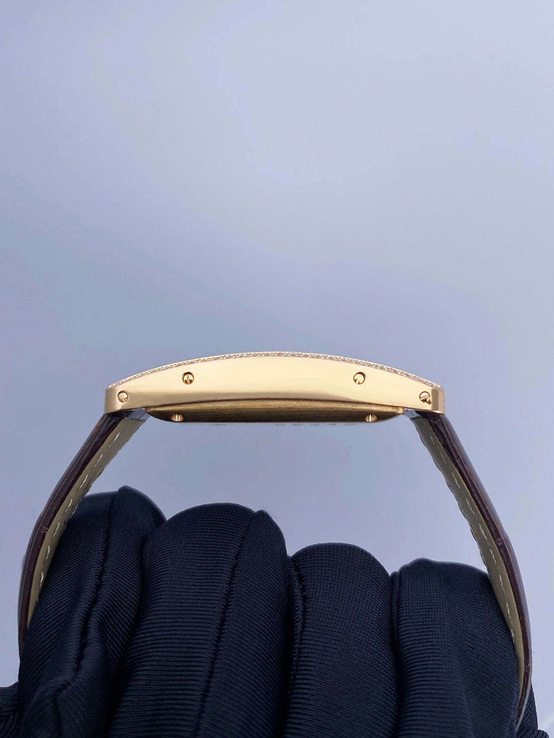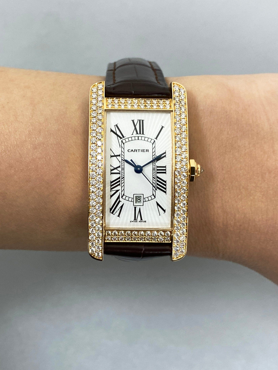 Cartier Tank Americaine WB704751 / 2504 Ladies Watch. 23mm 18K rose gold case with factory diamond. Silver dial with blue hands and black Roman numerals hour marker. Minute marker in the inner dial. Date display at 6 o'clock. Brown leather strap with 18K rose gold deployment buckle. Will fit up to a 6-inch wrist. Sapphire crystal. 18K rose gold case back. Automatic self-winding movement.