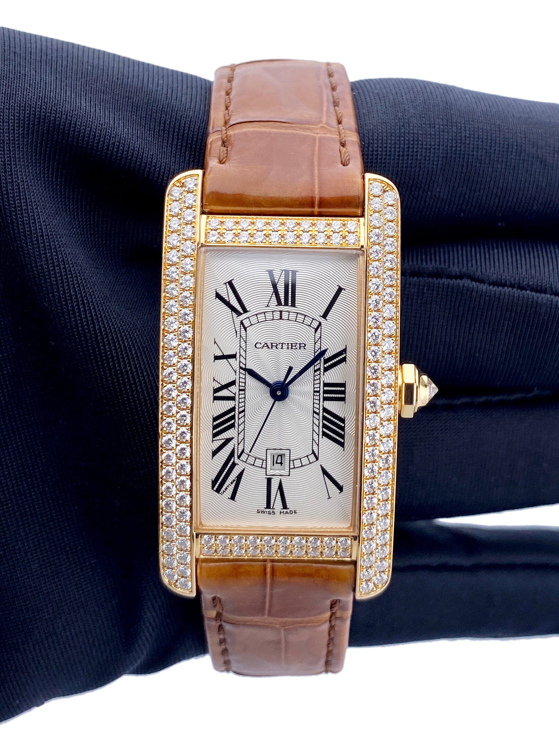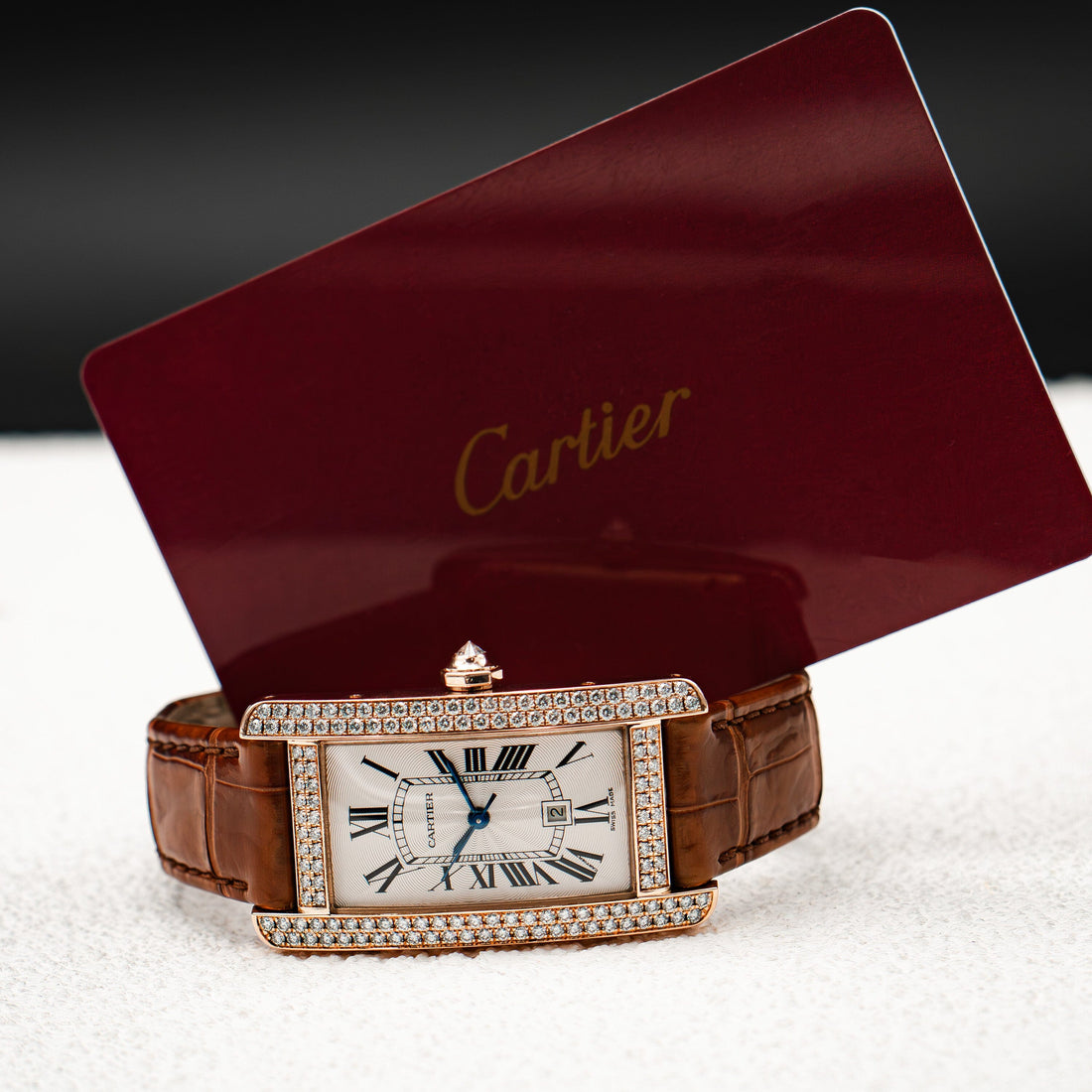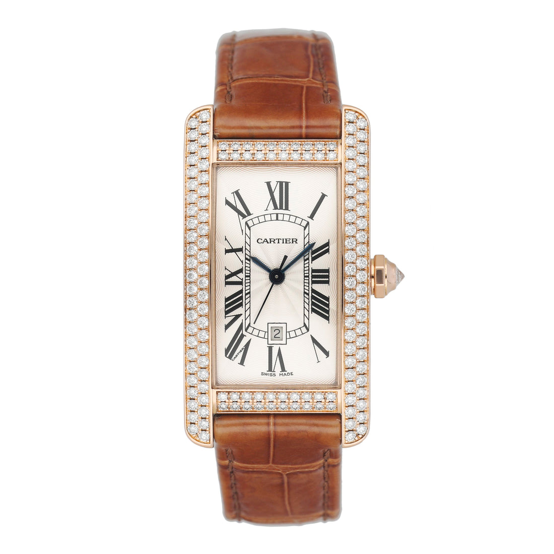 Cartier Tank Americaine WB704751 / 2504 Ladies Watch. 23mm 18K rose gold case with factory diamond. Silver dial with blue hands and black Roman numerals hour marker. Minute marker in the inner dial. Date display at 6 o'clock. Brown leather strap with 18K rose gold deployment buckle. Will fit up to a 6-inch wrist. Sapphire crystal. 18K rose gold case back. Automatic self-winding movement. This watch comes with original Box and Papers.