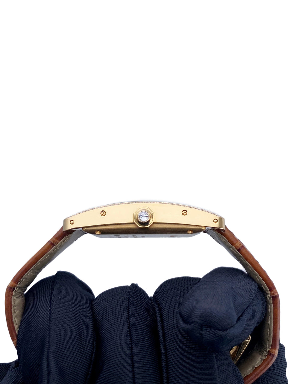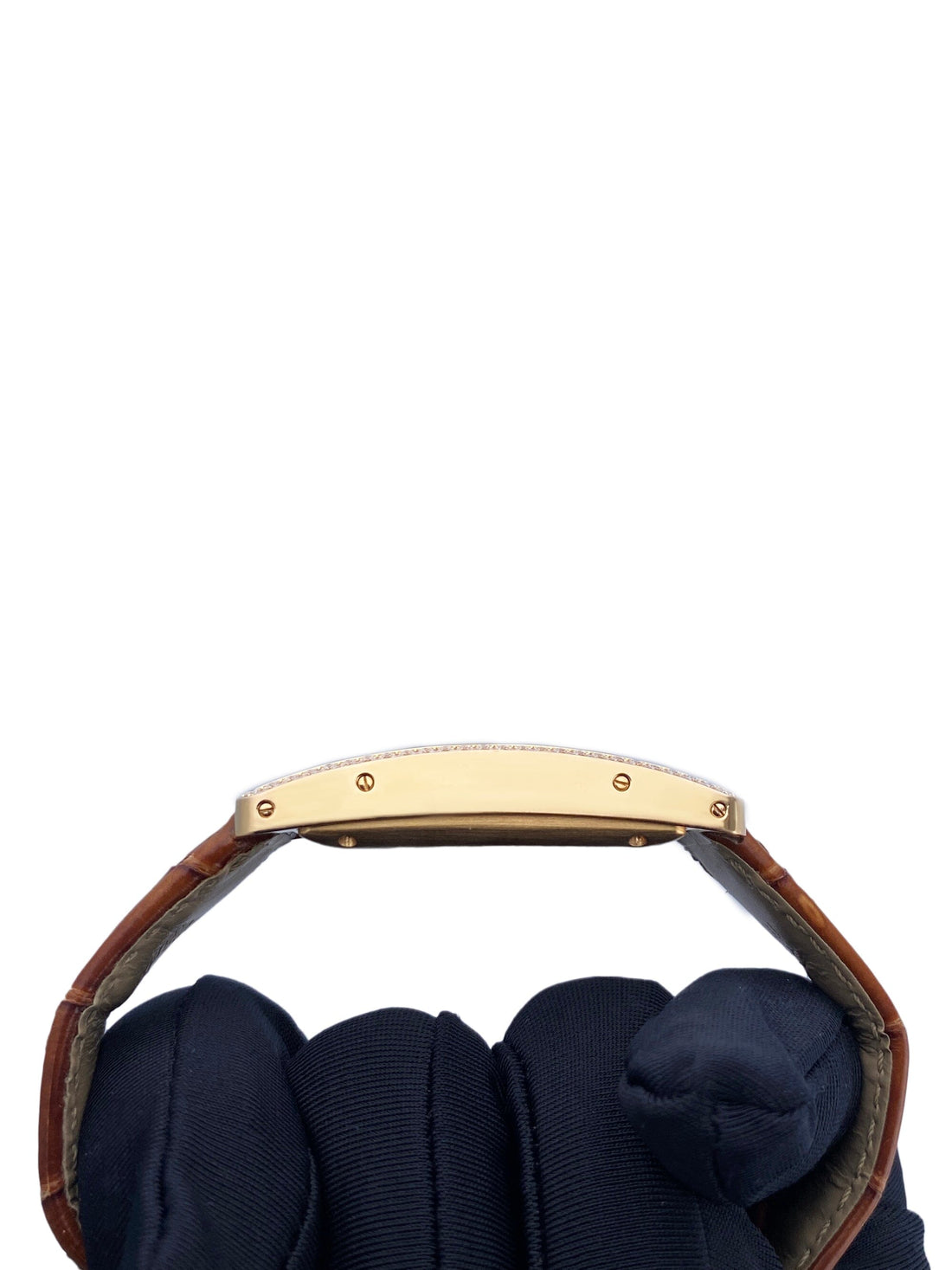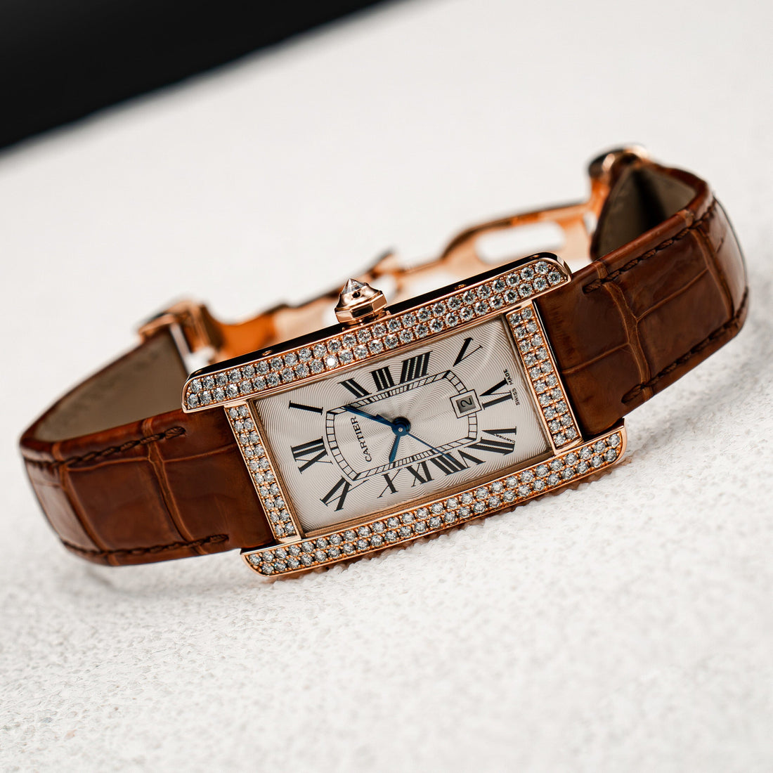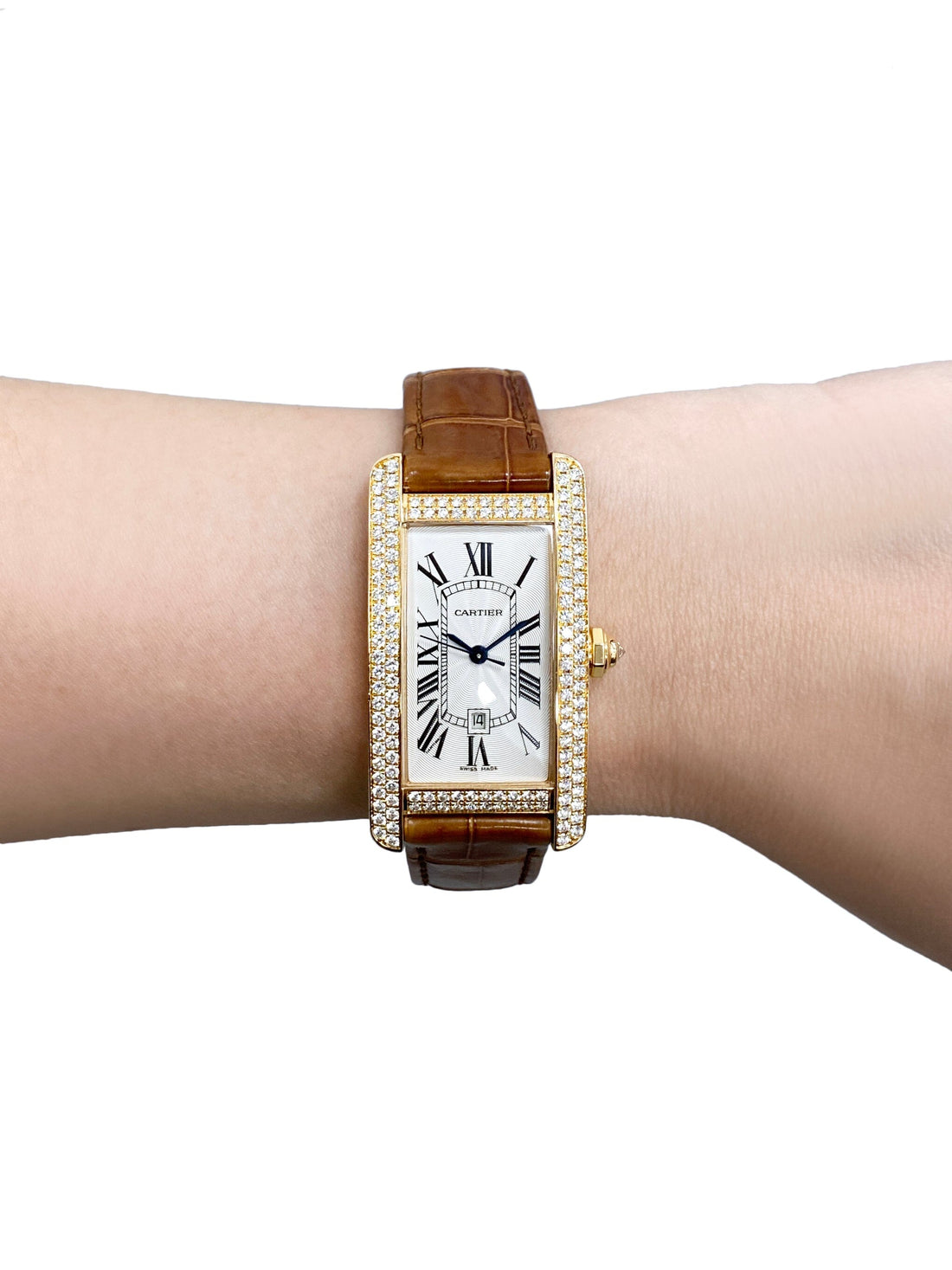 Cartier Tank Americaine WB704751 / 2504 Ladies Watch. 23mm 18K rose gold case with factory diamond. Silver dial with blue hands and black Roman numerals hour marker. Minute marker in the inner dial. Date display at 6 o'clock. Brown leather strap with 18K rose gold deployment buckle. Will fit up to a 6-inch wrist. Sapphire crystal. 18K rose gold case back. Automatic self-winding movement. This watch comes with original Box and Papers.