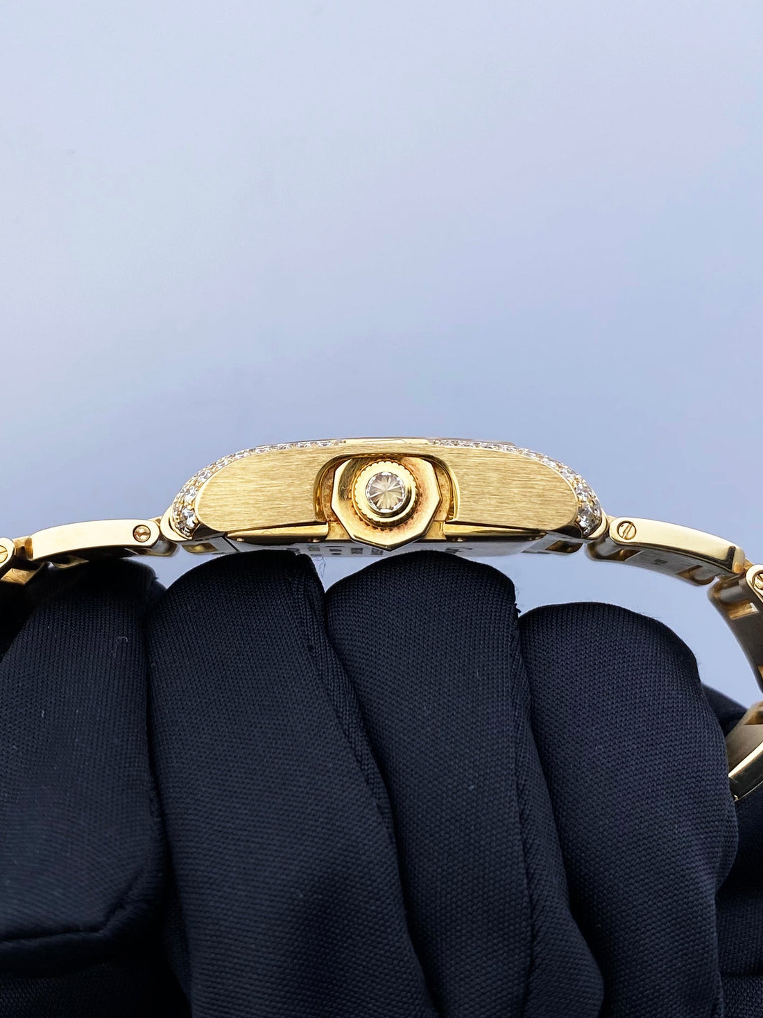 Cartier Tank Anglaise 3509 Ladies Midsize Watch. 30MM 18K yellow gold case. 18K yellow gold bezel with factory diamond set. Silver dial with blue hands and black Roman numeral hour marker. Date display at 3 o'clock position. 18K Yellow gold bracelet with hidden butterfly clasp. Will fit up to 6.5-Inch wrist. Sapphire crystal and 18K yellow gold case back . Automatic movement. This come with Box and Papers.