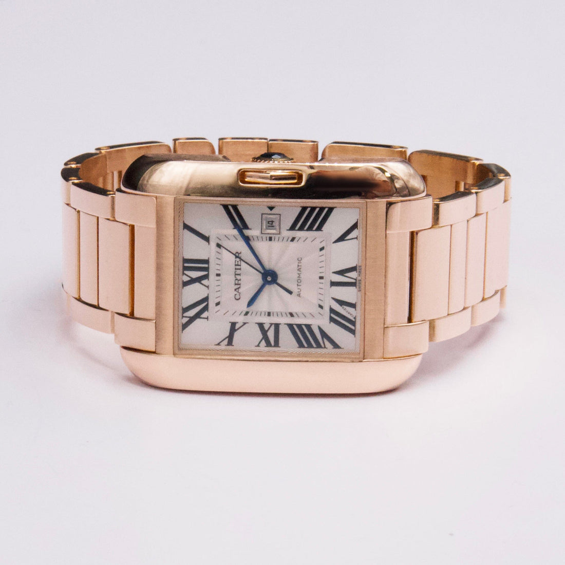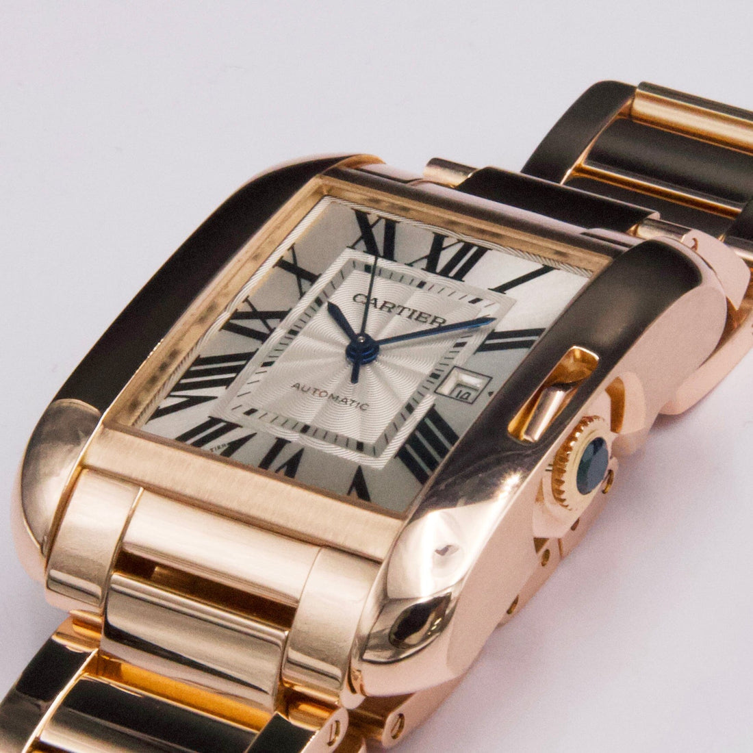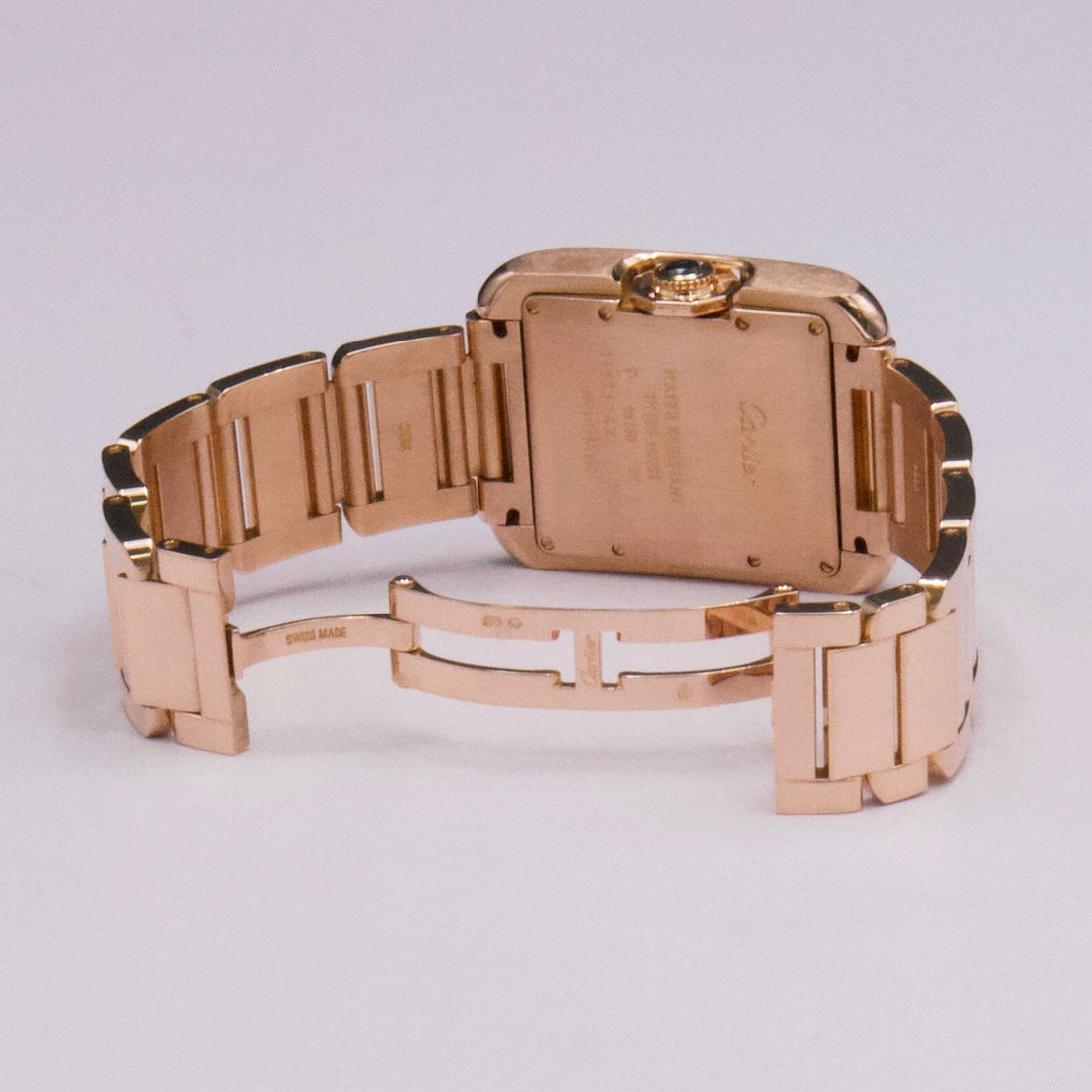 Cartier Tank Anglaise W5310003 / 3508 Ladies Watch. 30mm 18K rose gold case. 18K rose gold smooth bezel. Silver dial with blue steel hands and Roman numeral hour markers. Minute markers on the inner dial. Date is displayed at 3 o'clock position. 18K rose gold bracelet with hidden butterfly clasp. Will fit up to a 6.75-inch wrist. Sapphire crystal. 18K rose gold case back. Automatic self-winding movement.