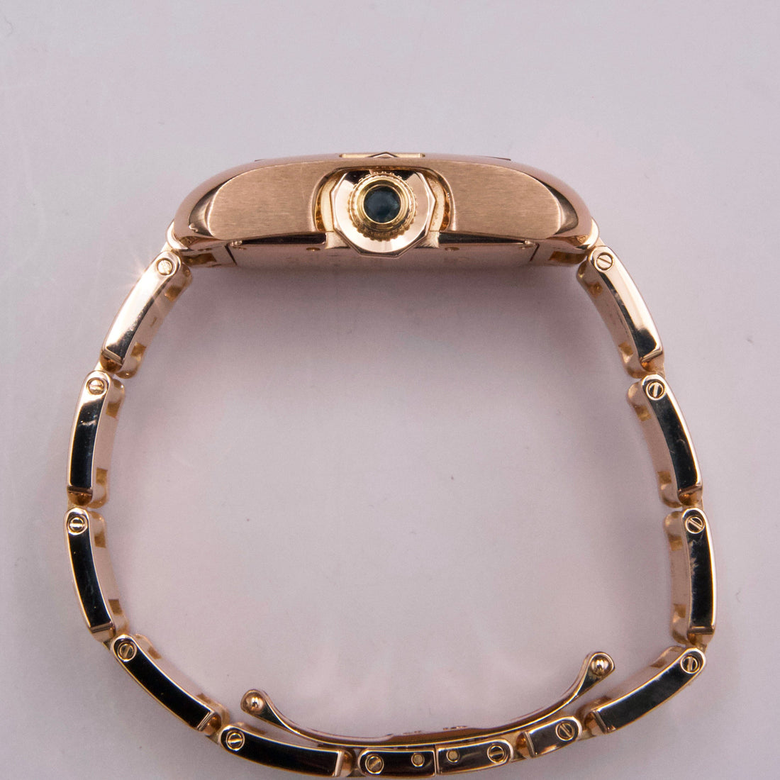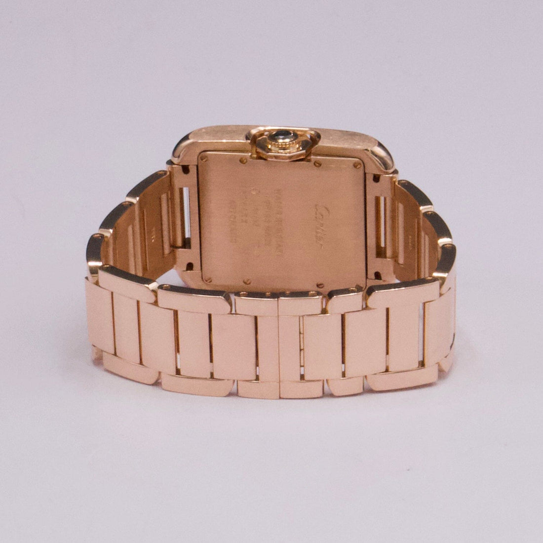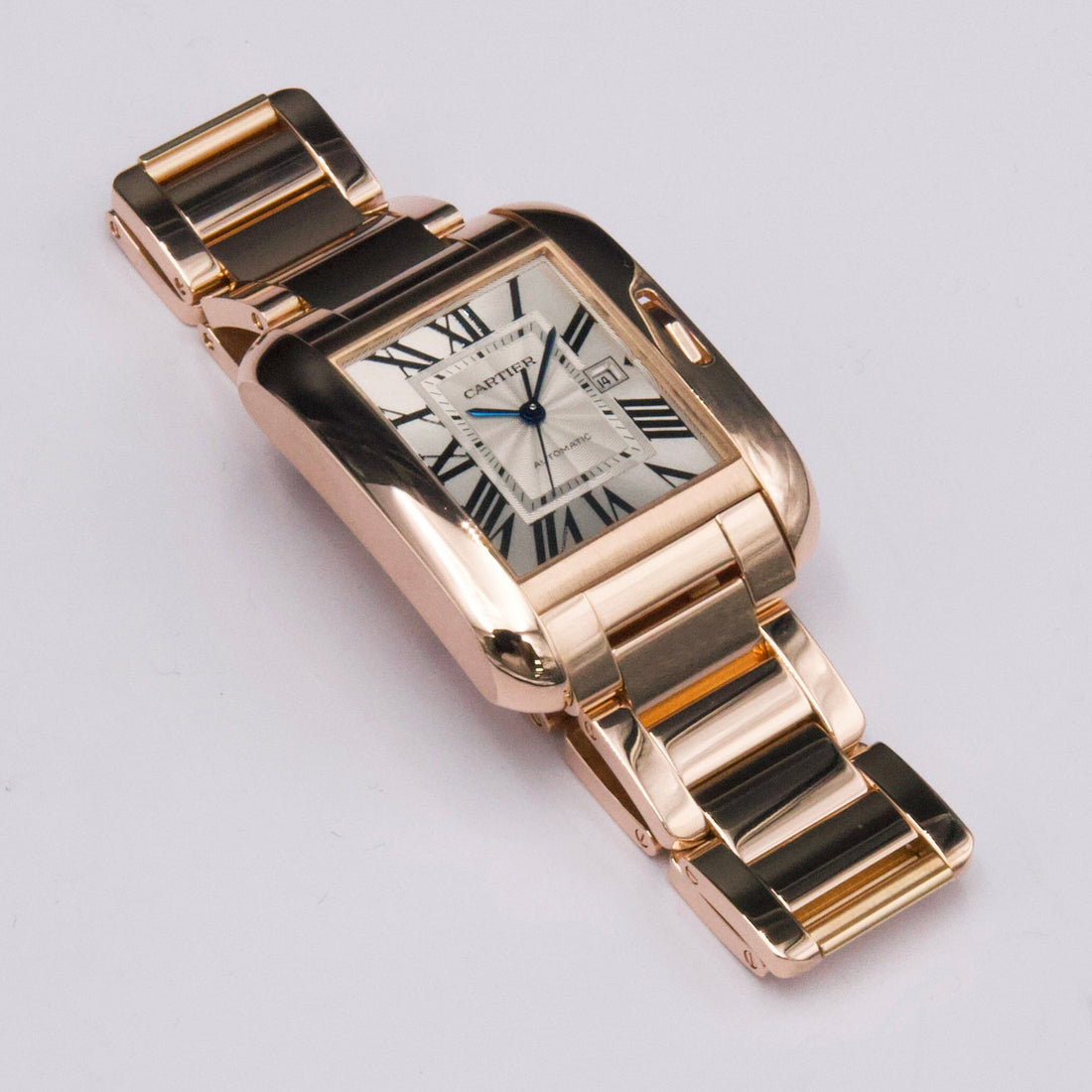 Cartier Tank Anglaise W5310003 / 3508 Ladies Watch. 30mm 18K rose gold case. 18K rose gold smooth bezel. Silver dial with blue steel hands and Roman numeral hour markers. Minute markers on the inner dial. Date is displayed at 3 o'clock position. 18K rose gold bracelet with hidden butterfly clasp. Will fit up to a 6.75-inch wrist. Sapphire crystal. 18K rose gold case back. Automatic self-winding movement.