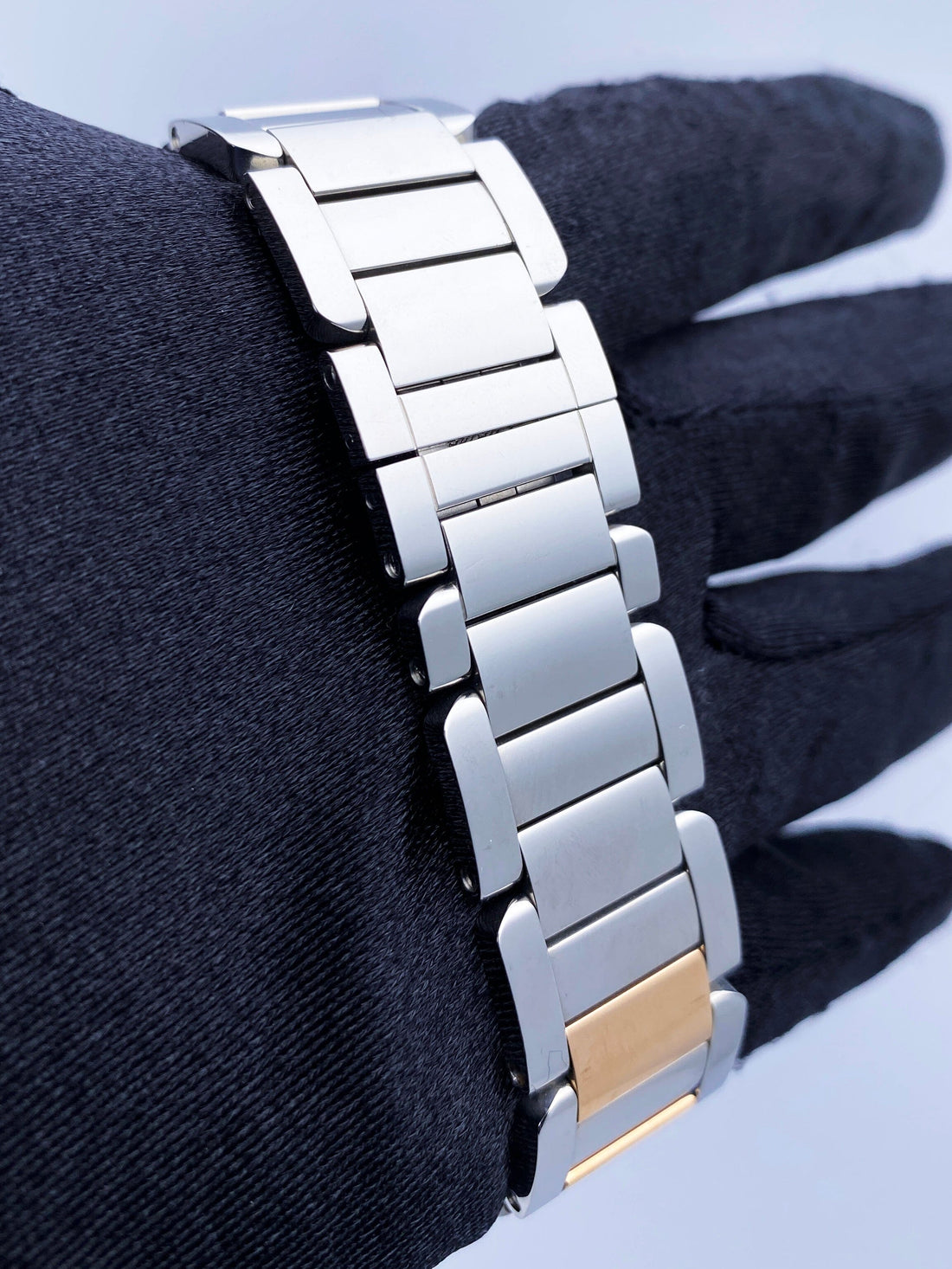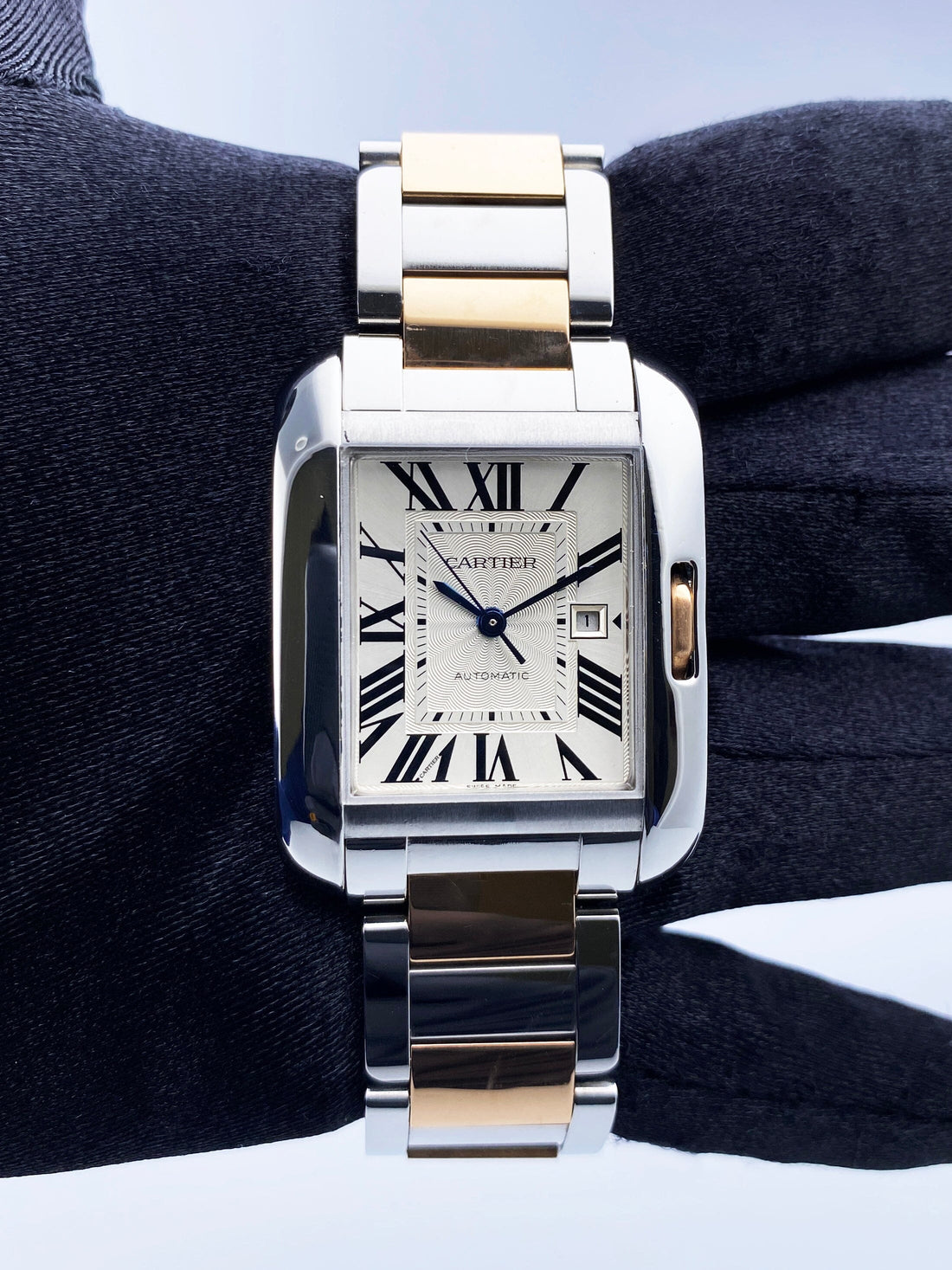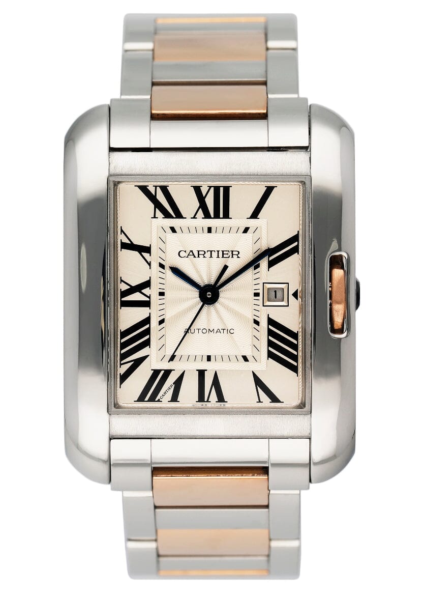 Cartier Tank Anglaise W5310007 / 3511 Ladies Watch. 30mm stainless steel gold case. Silver dial with blue steel hands and Roman numeral hour markers. The date is displayed at 3 o'clock position. Minute markers on the inner dial. 18K rose gold and stainless steel bracelet with a hidden butterfly clasp. Will fit up to a 6.5-inch wrist. Sapphire crystal. Stainless steel case back. Automatic self-winding movement.