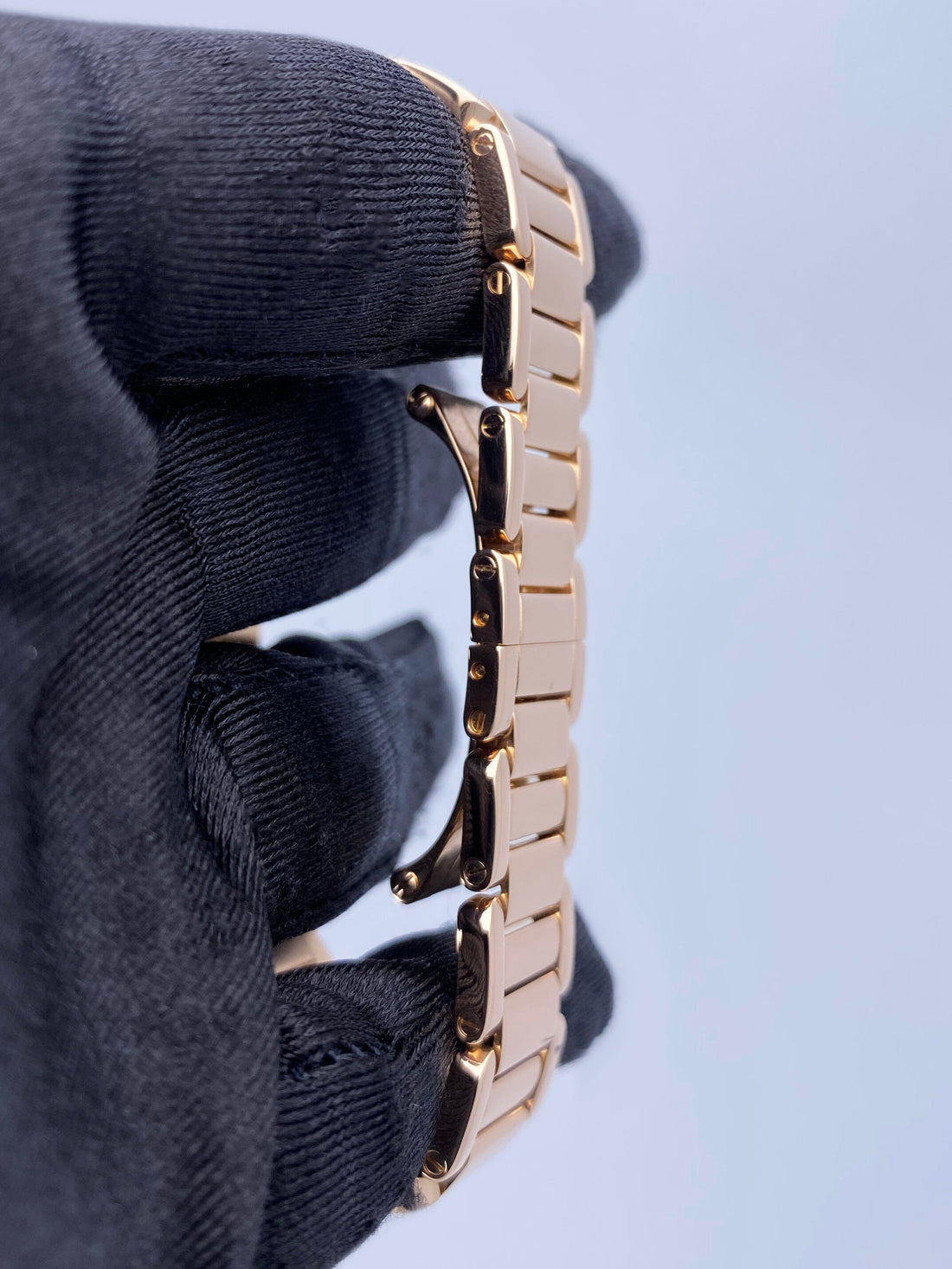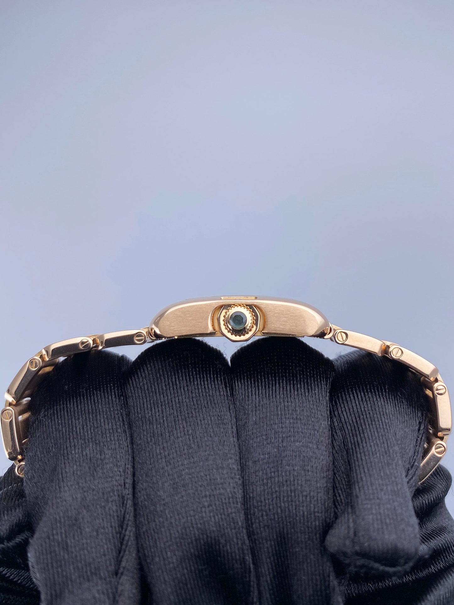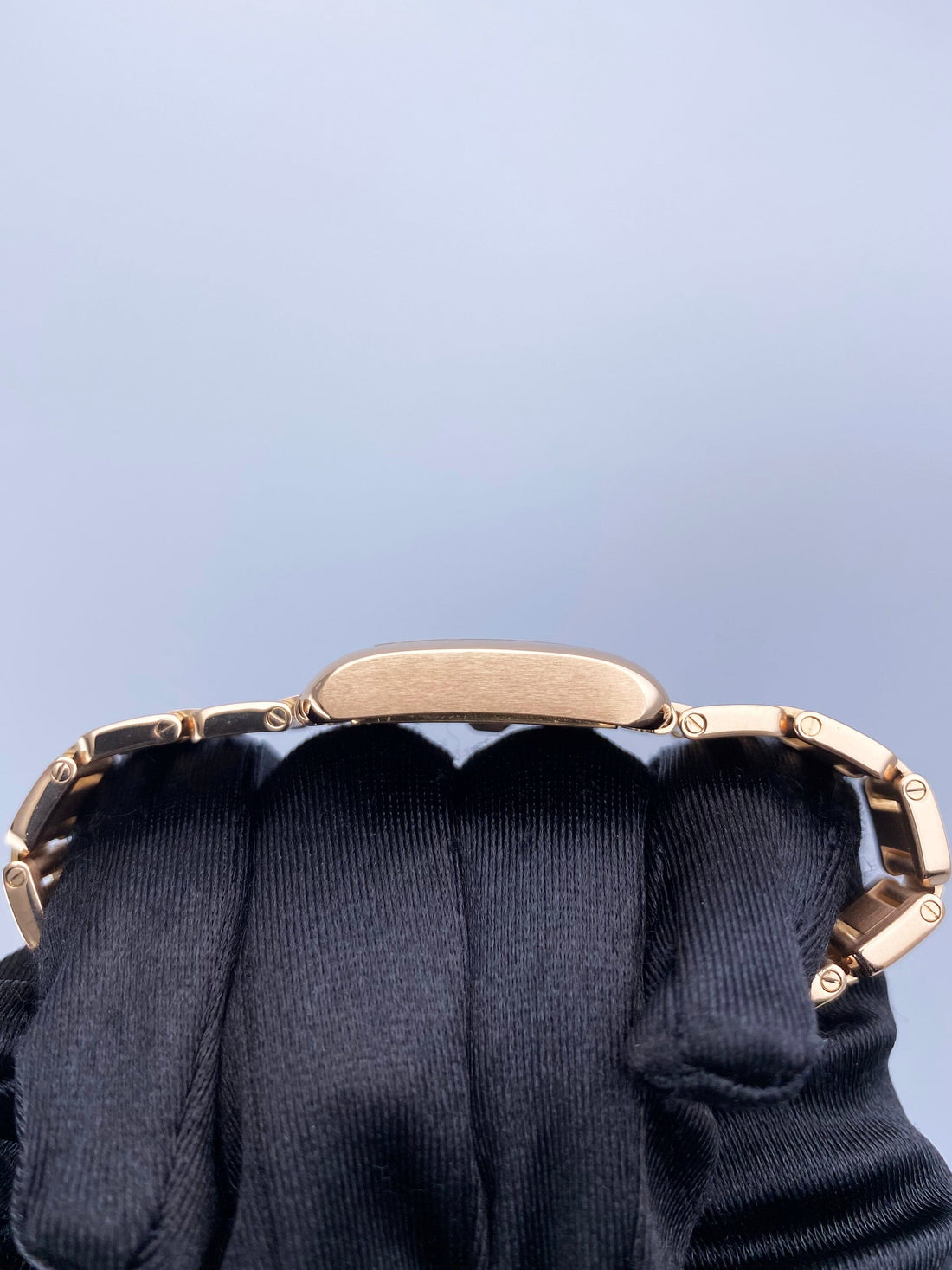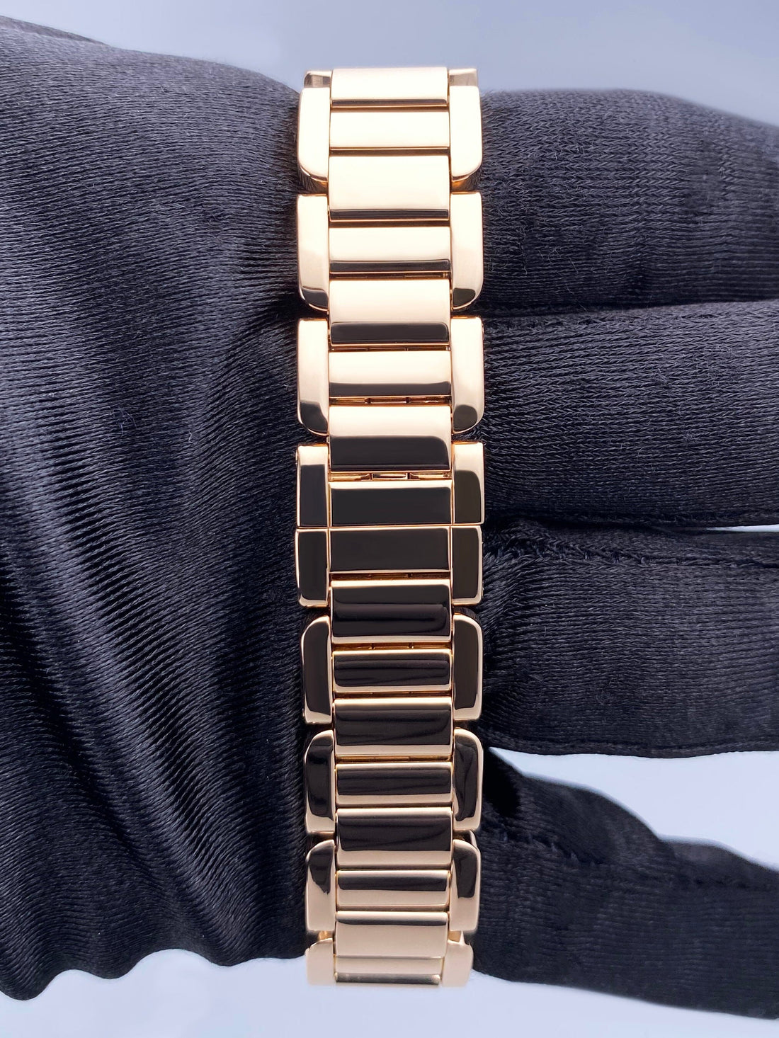 Cartier Tank Anglaise W5310013 / 3580 Ladies Watch. 23mm 18K rose gold case. 18K rose gold smooth bezel. Silver dial with blue steel hands and Roman numeral hour markers. Minute markers on the inner dial. 18K rose gold bracelet with hidden butterfly clasp. Will fit up to a 6-inch wrist. Sapphire crystal. 18K rose gold case back. Quartz: Battery powered movement.