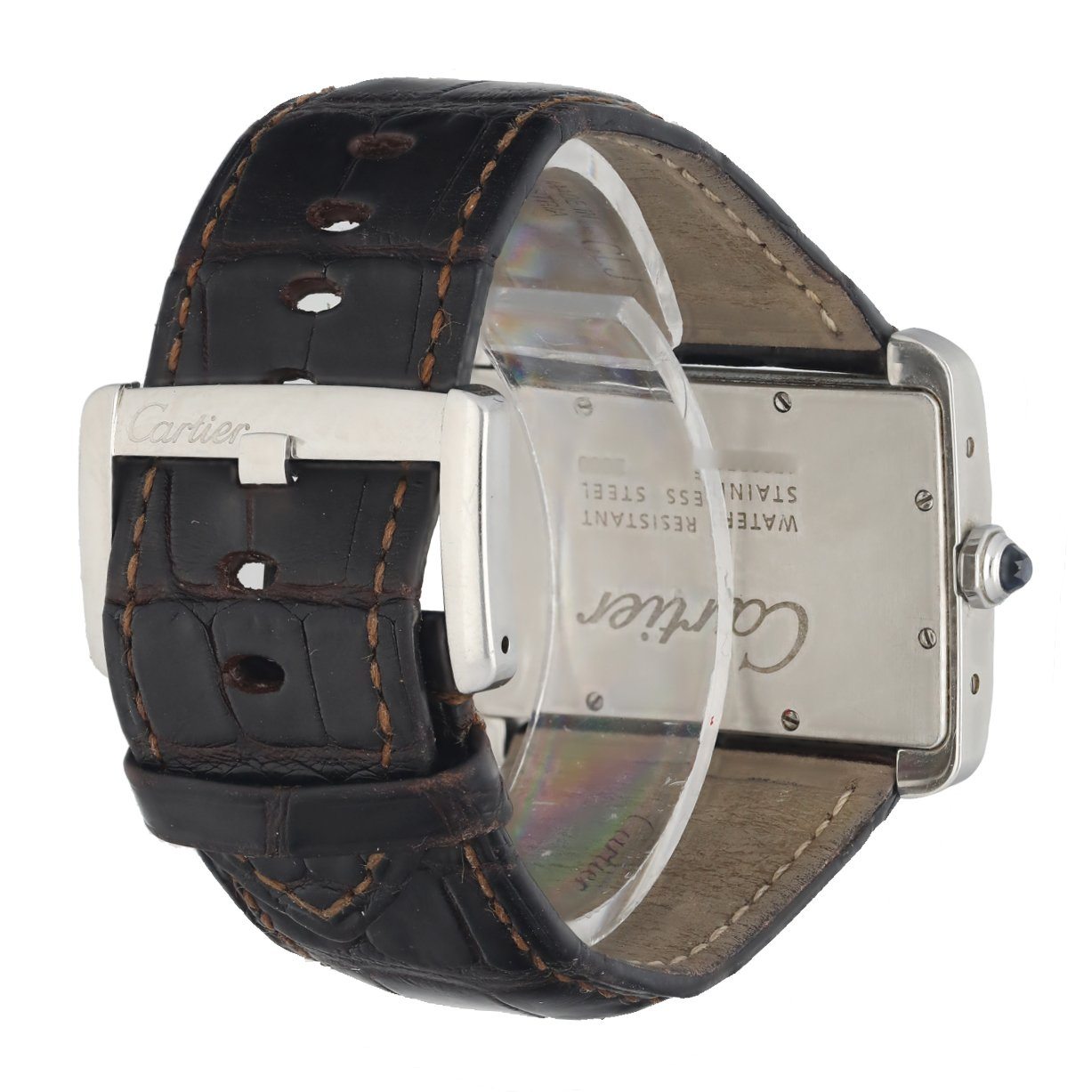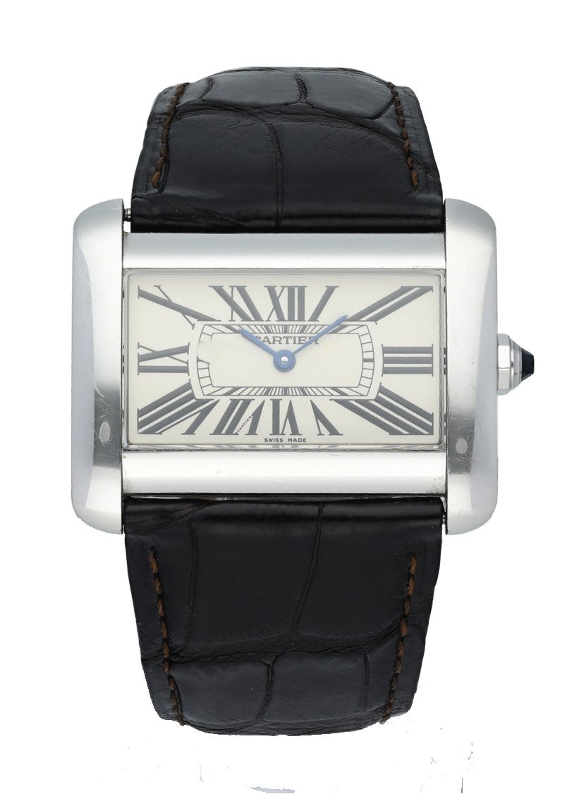 Cartier Tank Divan 2600 stainless steel Ladies Watch. 39 x 31 mm Stainless steel case. Off-White dial with blue steel hands and black Roman numerals hour markers. Adjustable Black leather band with a stainless steel buckle. Automatic self-wind movement. Sapphire crystal and stainless steel case back