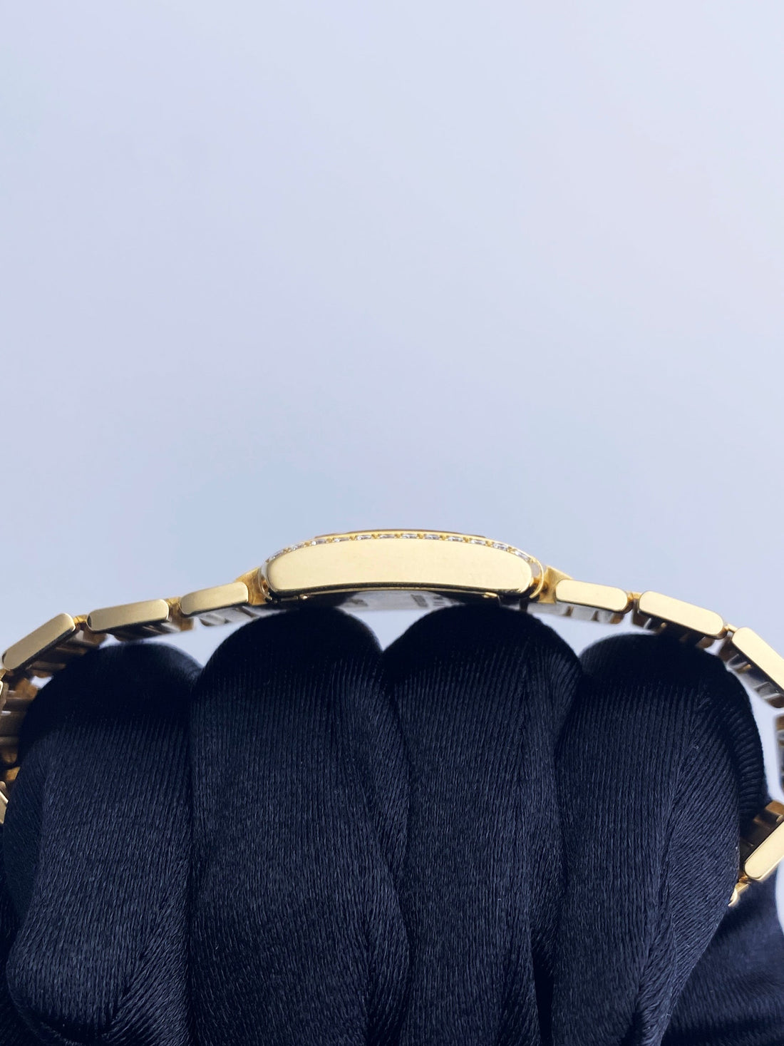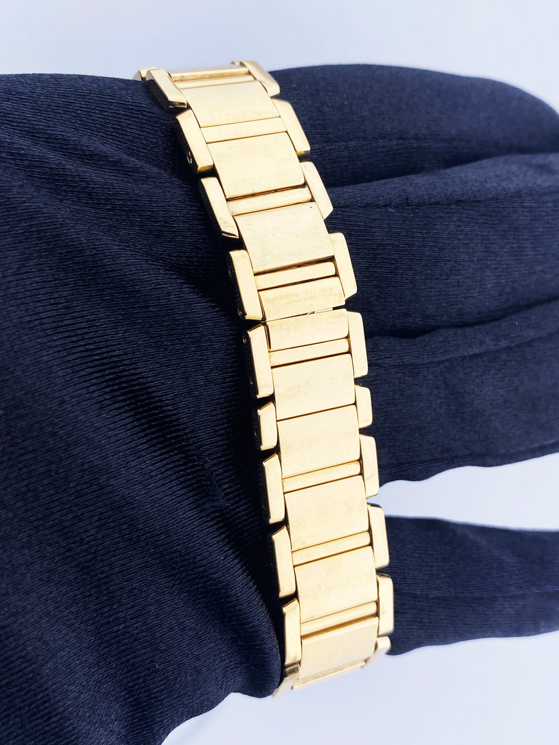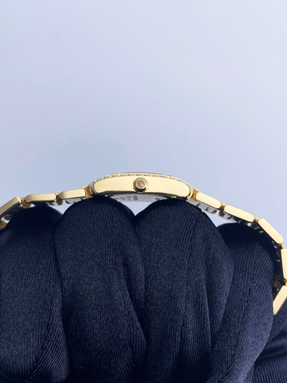 Cartier Tank Francaise 2385 Ladies Watch. 20mm 18k yellow gold case. 18K yellow gold bezel with original factory diamond set insert. Off-White dial with Blue steel hands and Roman numeral hour markers. Minute markers on the inner dial. 18K yellow gold bracelet with hidden butterfly. Will fit up to a 6-inch wrist. Sapphire crystal. 18K yellow gold case back. Quartz: Battery powered movement.