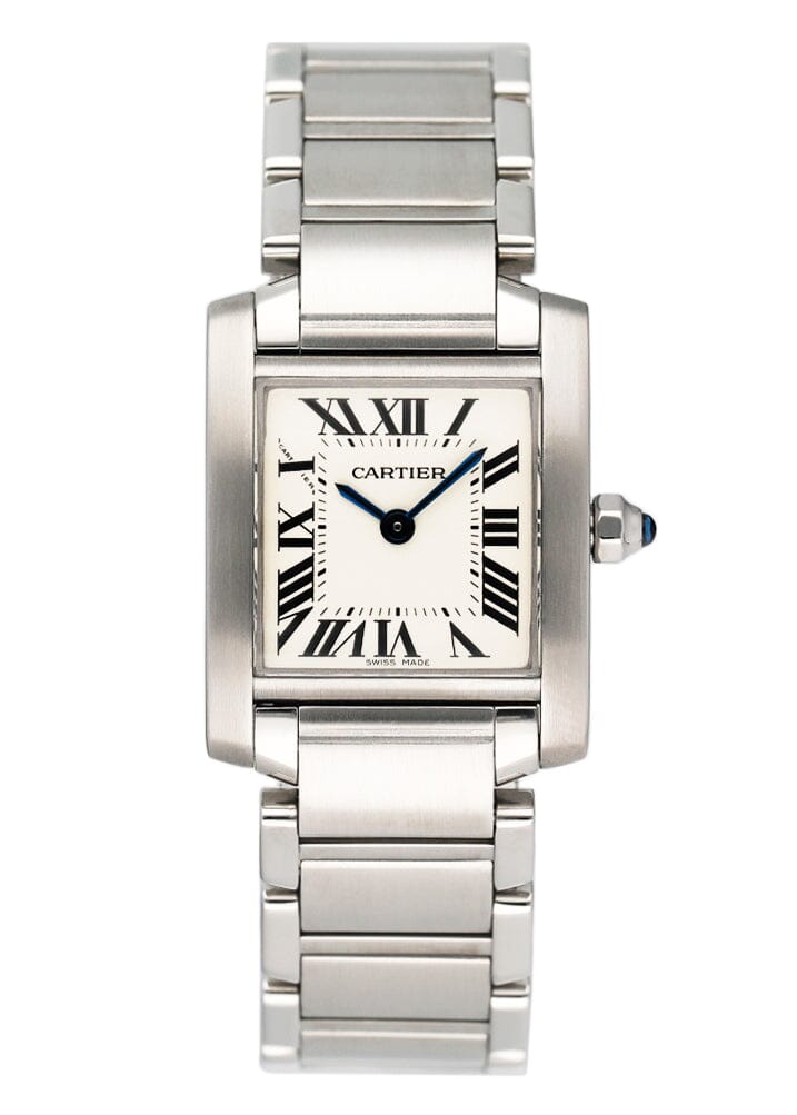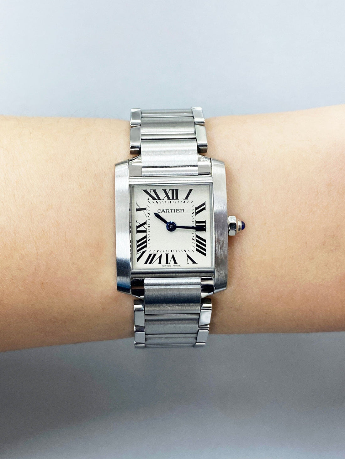 Cartier Tank Francaise W51008Q3 / 2384 Watch. 20mm stainless steel case with stainless steel bezel. Off-White dial with blue steel hands and Roman numeral hour markers. Minute markers on the inner dial. Stainless steel bracelet with hidden butterfly clasp. Will fit up to a 6-inch wrist. Sapphire crystal. Stainless steel case back. Quartz: Battery powered movement.