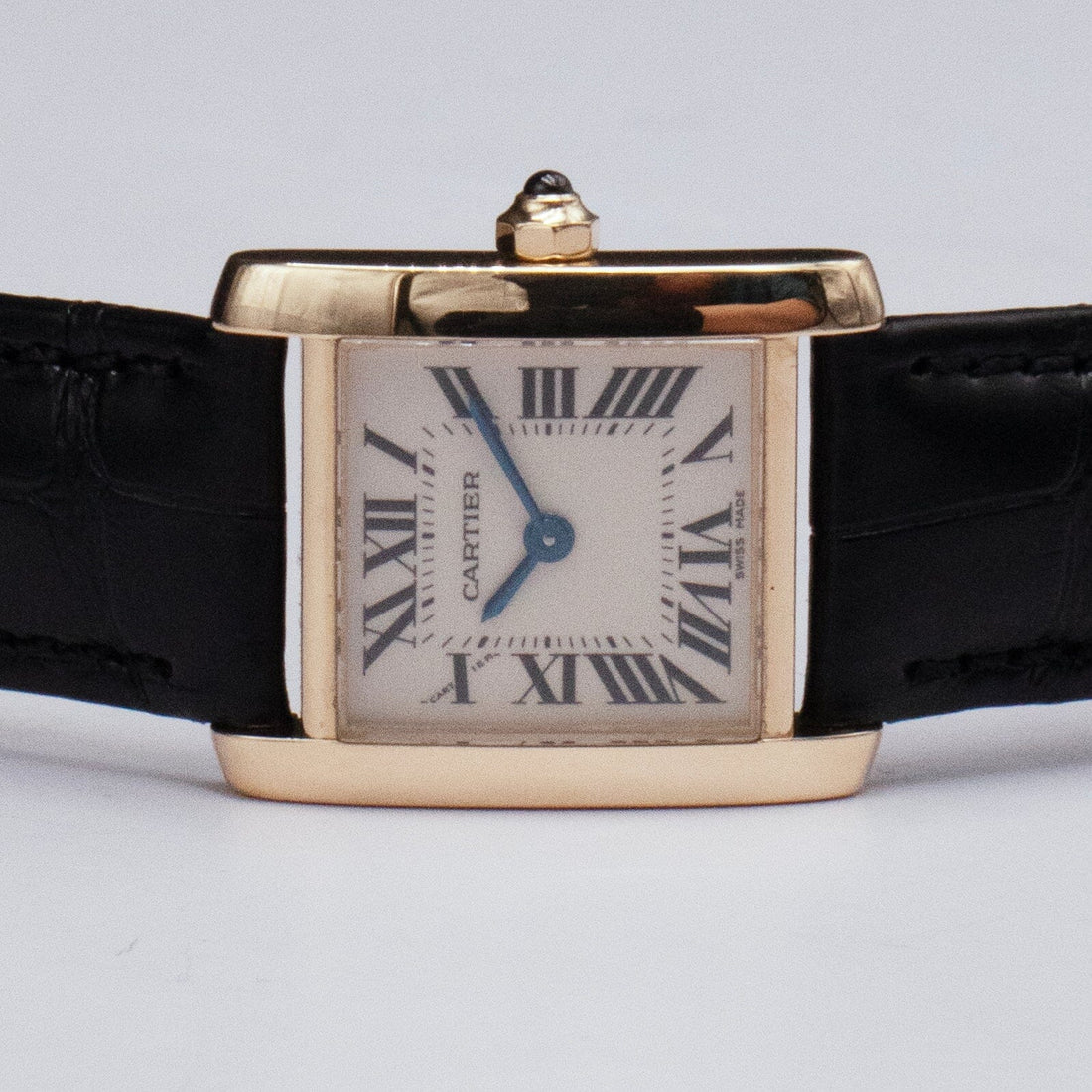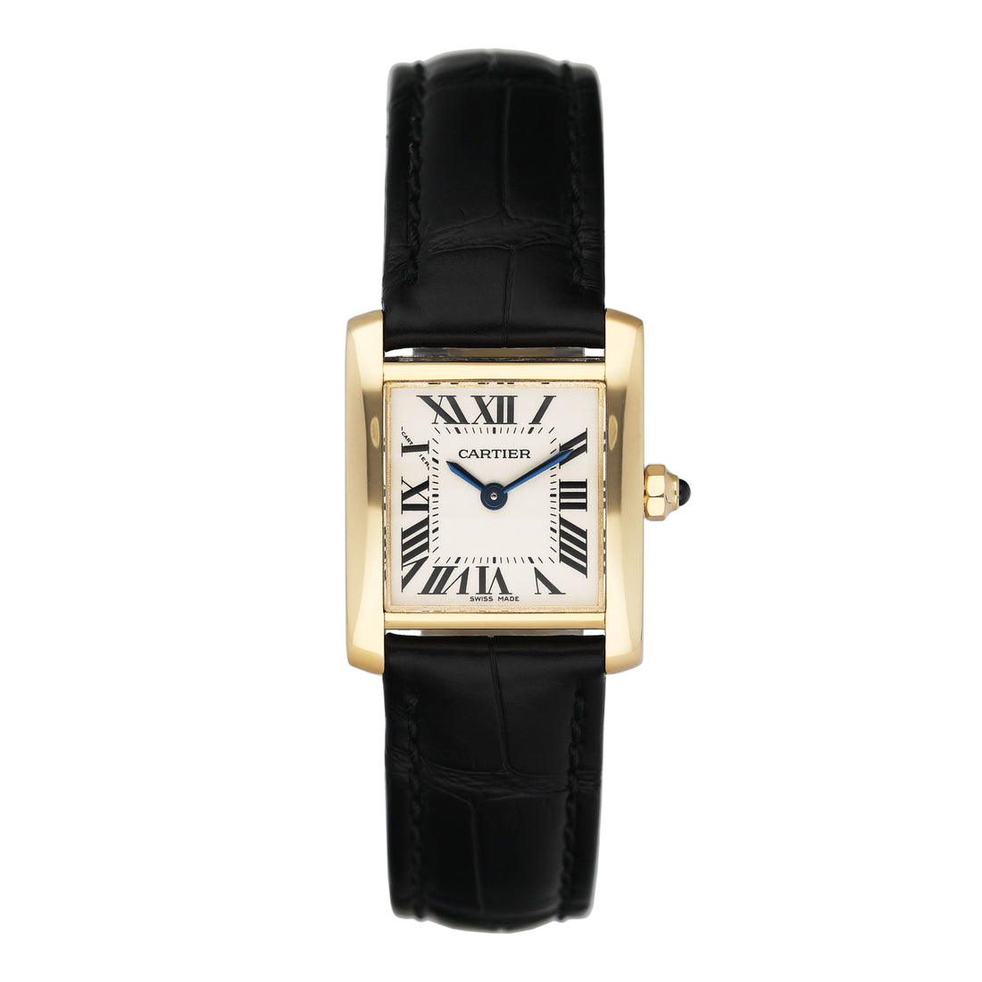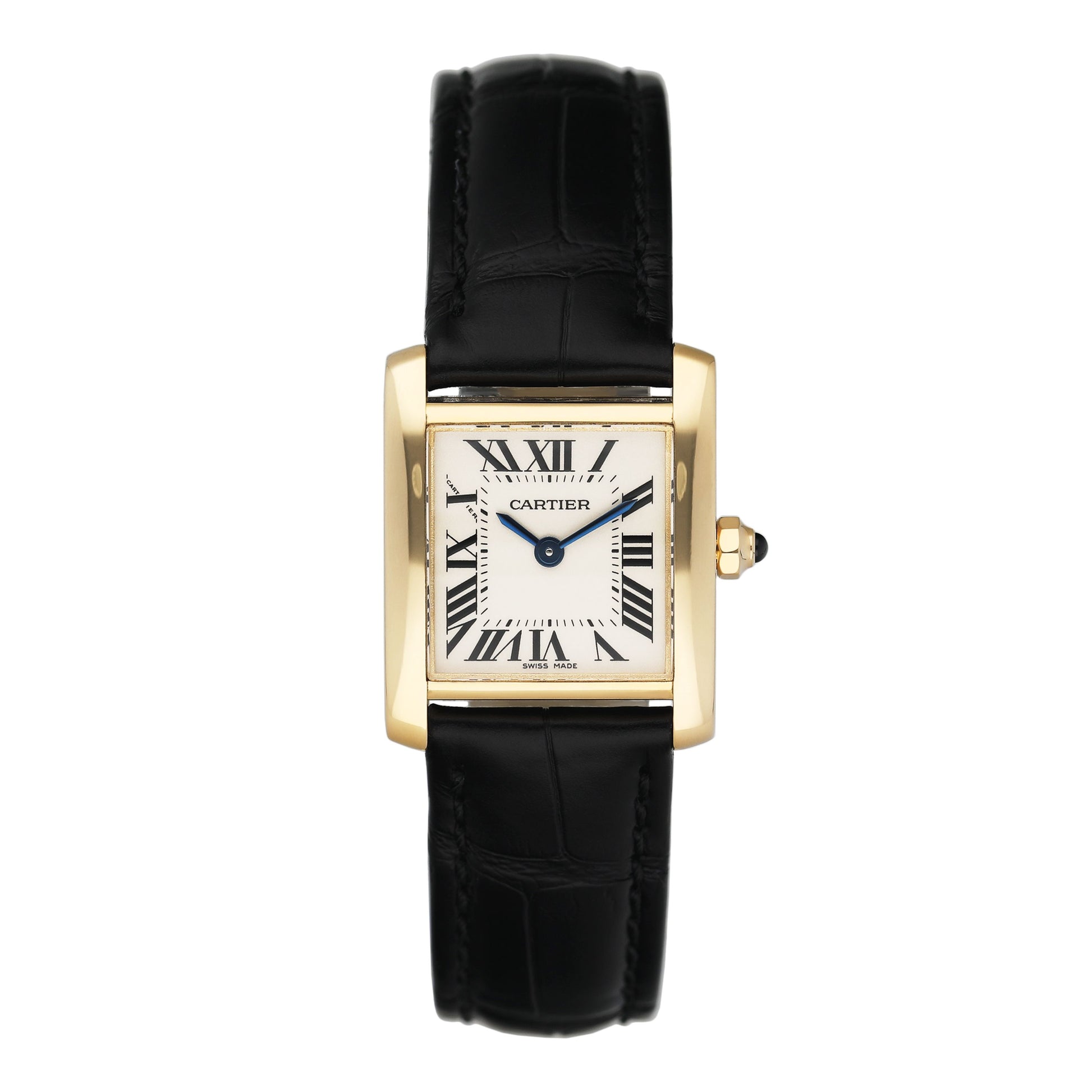 Cartier Tank Francaise W5000256 / 2385 Ladies Watch. 20mm 18K yellow gold case. Off-White dial with blue steel hands and Roman numeral hour markers. Minute markers on the inner dial. Black leather strap with buckle. Will fit up to a 6-inch wrist. Sapphire crystal. 18K yellow gold case back. Quartz: Battery powered movement.
