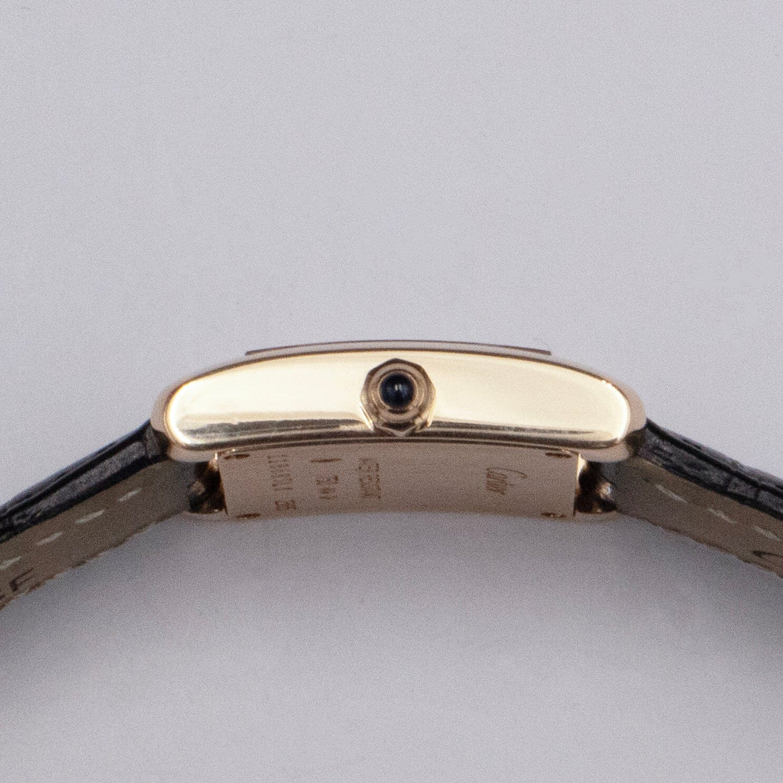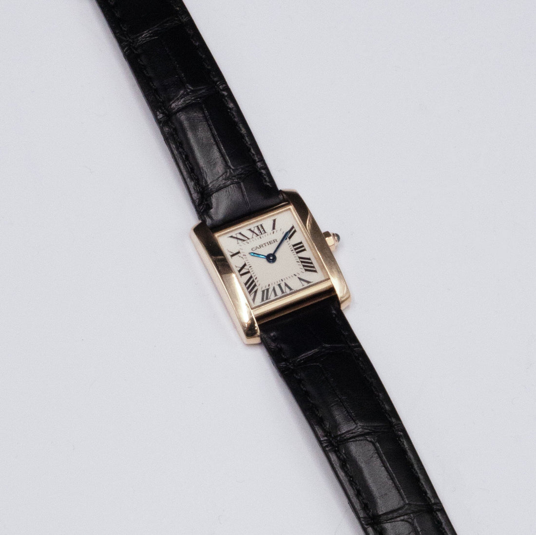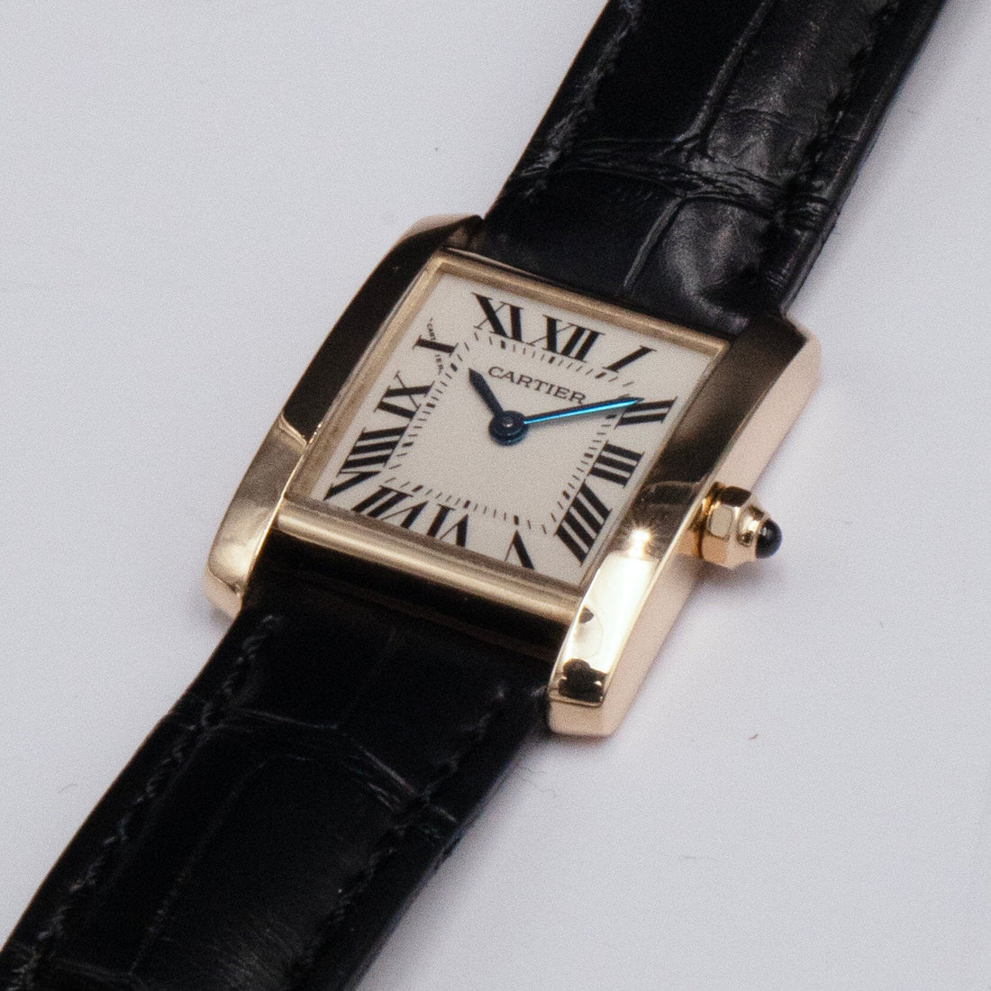 Cartier Tank Francaise W5000256 / 2385 Ladies Watch. 20mm 18K yellow gold case. Off-White dial with blue steel hands and Roman numeral hour markers. Minute markers on the inner dial. Black leather strap with buckle. Will fit up to a 6-inch wrist. Sapphire crystal. 18K yellow gold case back. Quartz: Battery powered movement.