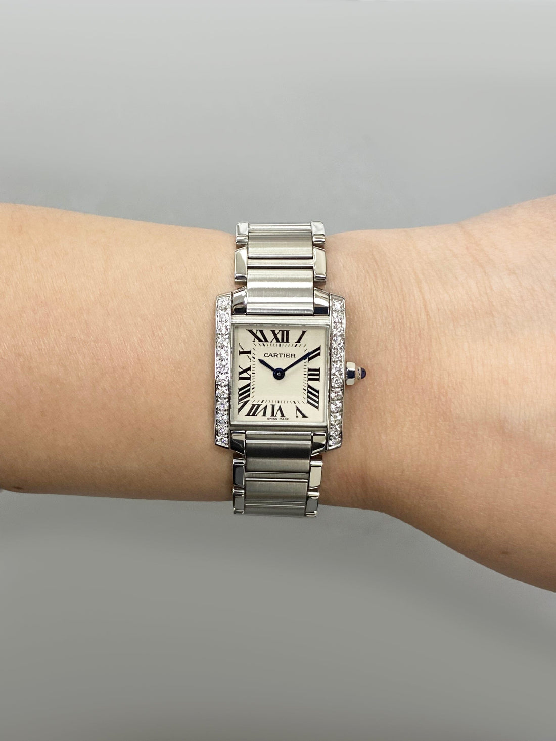 Cartier Tank Francaise W4TA0008 / 3217 Watch. 20mm stainless steel case with factory diamond. Stainless steel bezel. Off-White dial with blue steel hands and Roman numeral hour markers. Minute markers on the inner dial. Stainless steel bracelet with hidden butterfly clasp. Will fit up to a 5.5-inch wrist. Sapphire crystal. Stainless steel case back. Quartz: Battery powered movement. This watch comes with original Box and Papers.