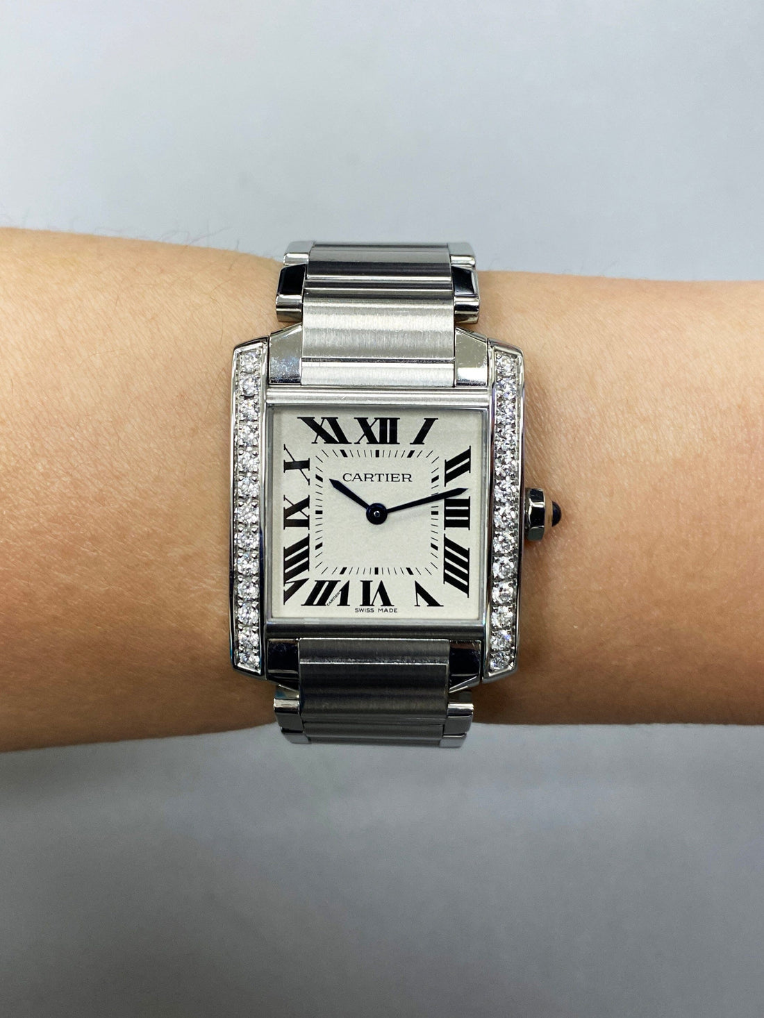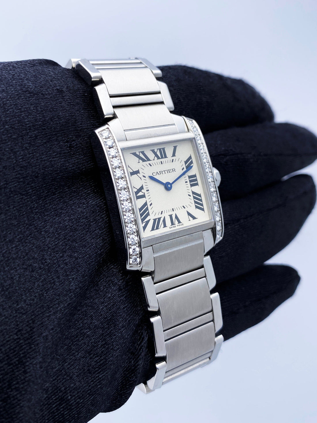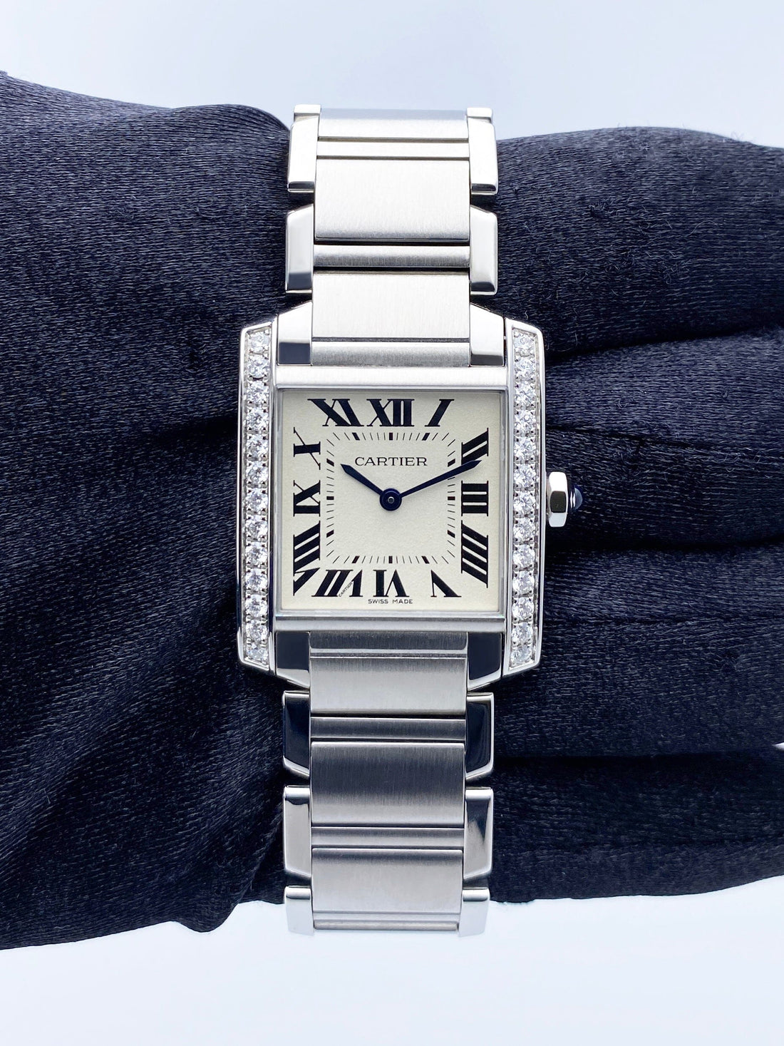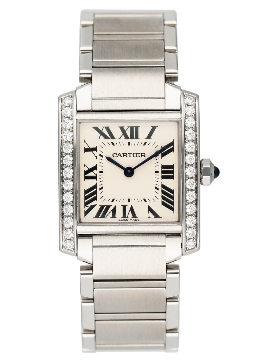 Cartier Tank Francaise W4TA0009 Ladies Watch. 25mm stainless steel case. Stainless steel bezel with original factory diamond set. Silver dial with blue steel hands and black Roman numeral hour markers. Minute markers on the inner dial. Stainless steel bracelet with hidden butterfly clasp. Will fit up to a 6-inch wrist. Sapphire crystal. Stainless steel case back. Quartz: Battery powered movement. This watch comes with original Box and Papers.