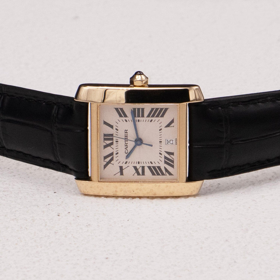 Cartier Tank Francaise W5000156 / 1840 Mens Watch. 28mm 18K yellow gold case. Silver dial with blue steel hands and black Roman numeral hour markers. Date display at the 6 o'clock position. Minute markers on the inner dial. Black leather strap with 18K yellow gold buckle. Will fit up to a 7-inch wrist. Sapphire crystal. Automatic self-winding movement.