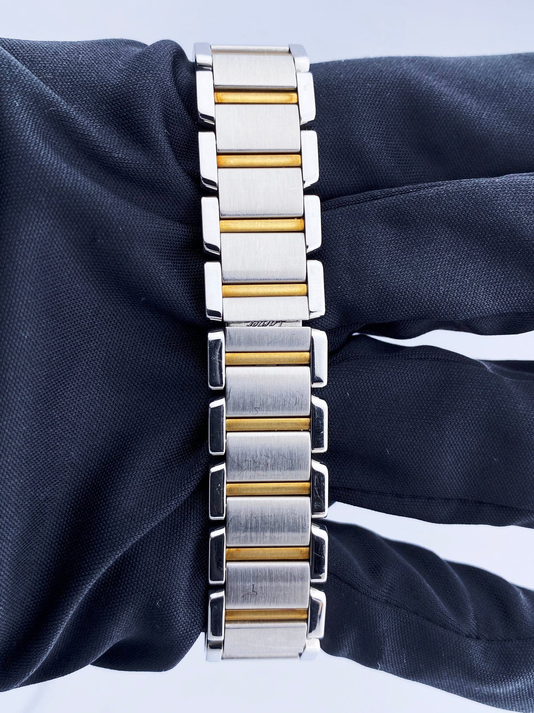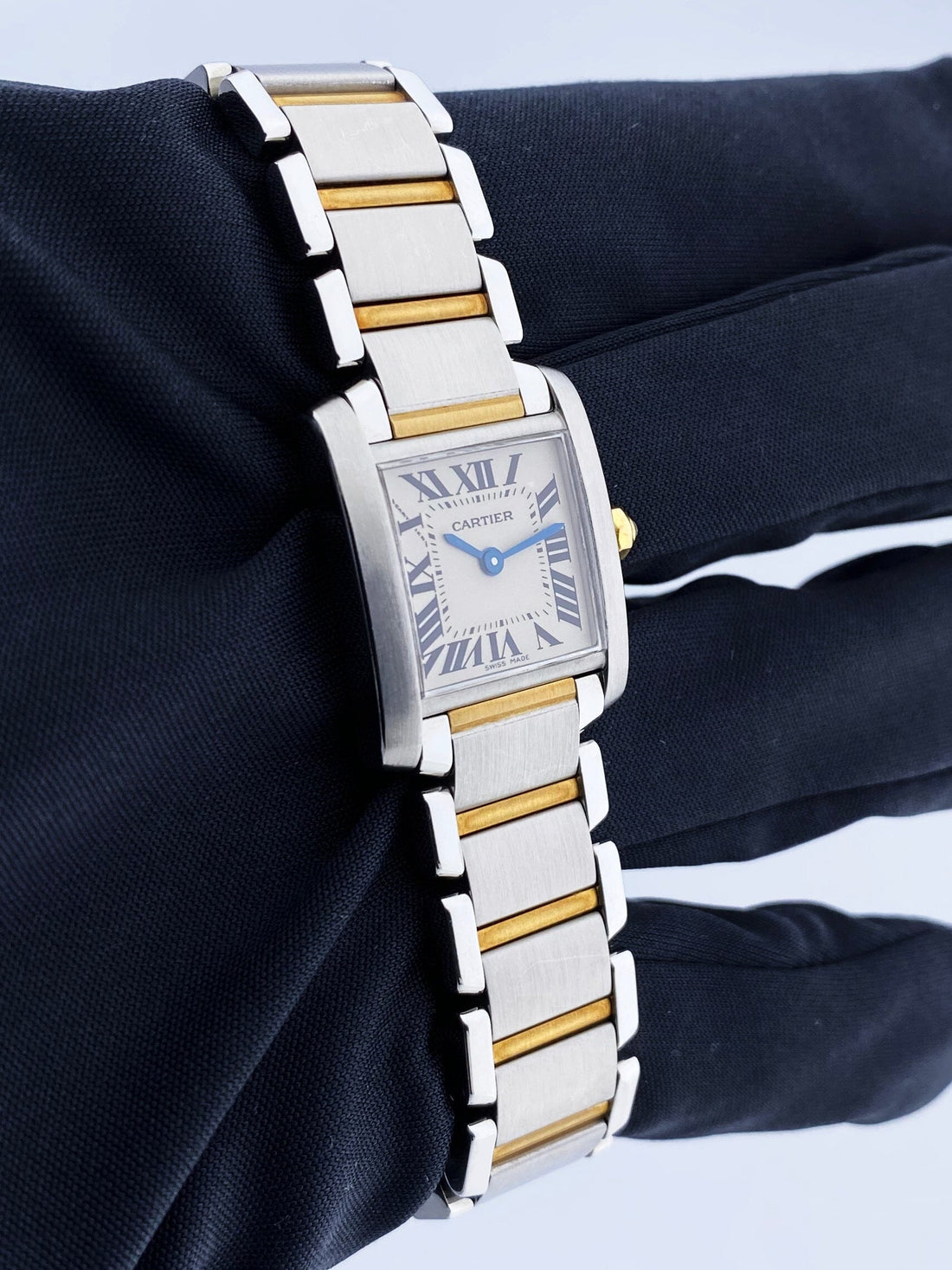 Cartier Tank Francaise W51007Q4 / 2384 Ladies Watch. 20mm Stainless steel case. Stainless steel smooth bezel. Off-White dial with blue steel hands and Roman numeral hour markers. Minute markers on the inner dial. Stainless steel & 18K yellow gold bracelet with hidden butterfly clasp. Will fit up to a 5.75-inch wrist. Sapphire crystal. Stainless steel case back. Quartz: Battery powered movement.