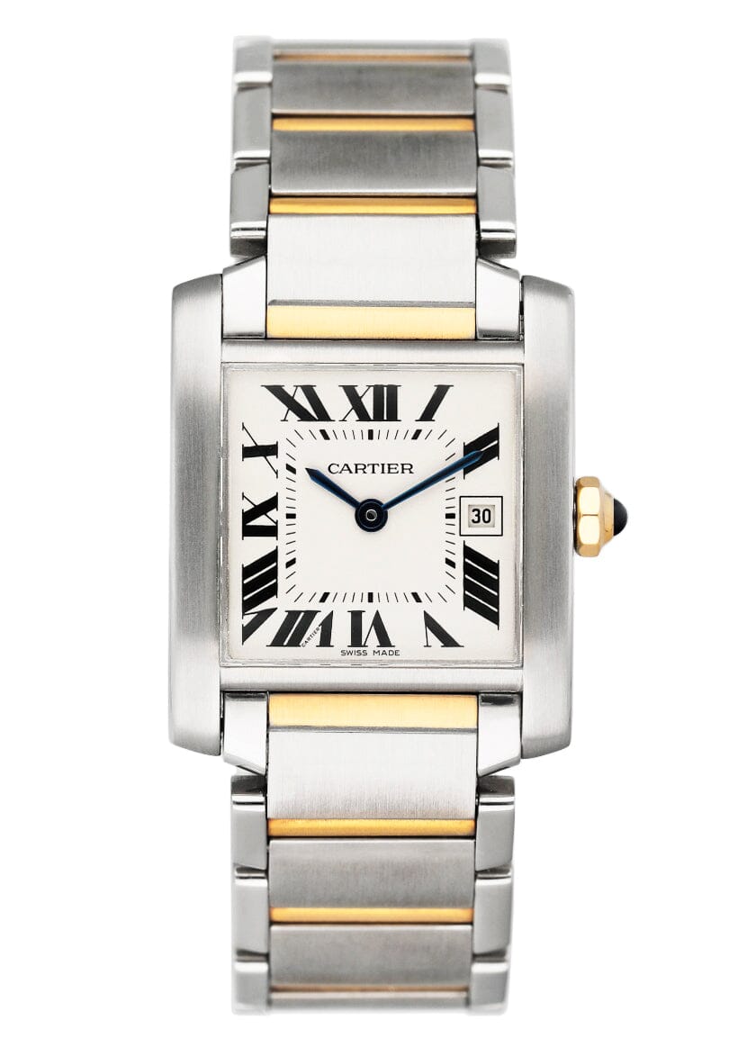 Cartier Tank Francaise W51012Q4 / 2465 Watch. 25mm stainless steel case. Stainless steel bezel. Silver dial with blue steel hands and black Roman numeral hour markers. Minute markers on the inner dial. Date display at the 3 o'clock position. 18K yellow gold & stainless steel bracelet with hidden butterfly clasp. Will fit up to a 5.5-inch wrist. Sapphire crystal. Stainless steel case back. Quartz: Battery powered movement.
