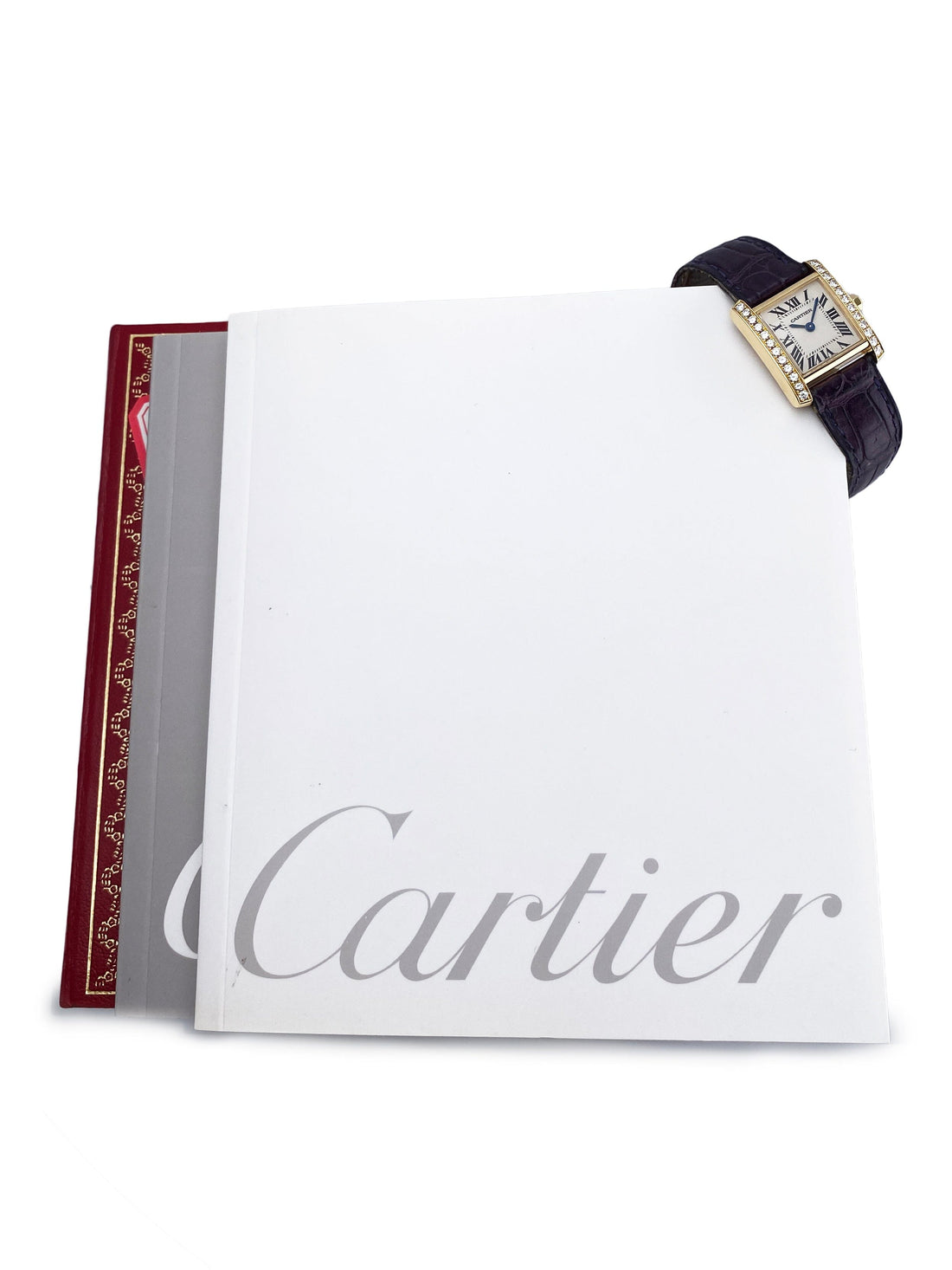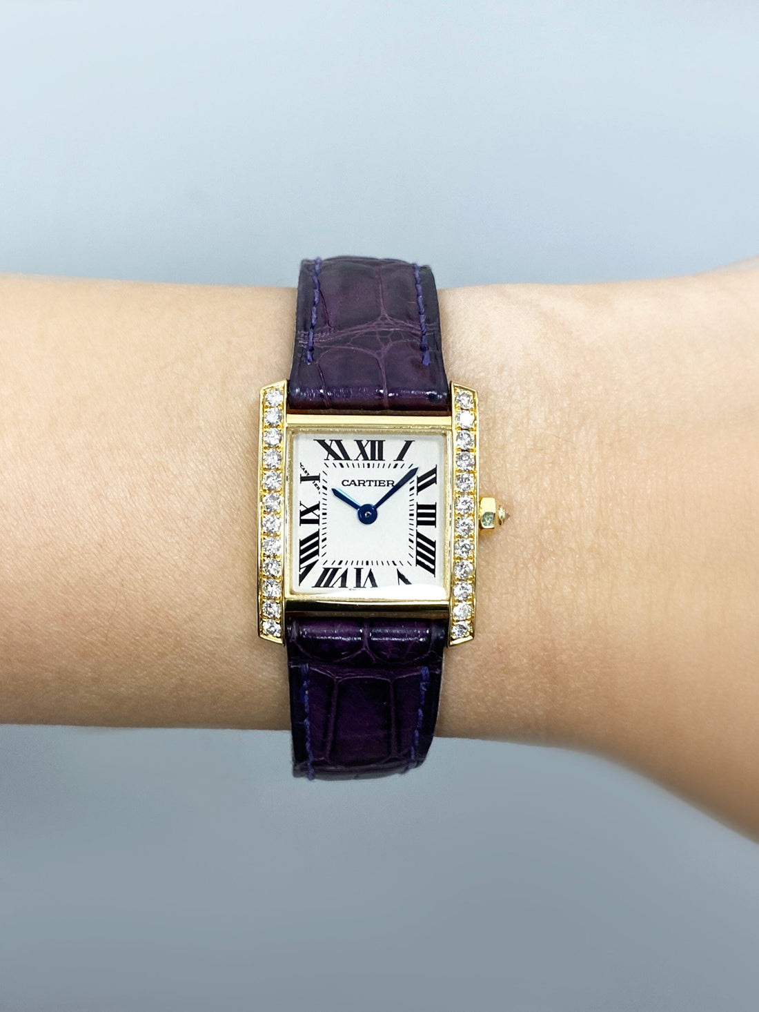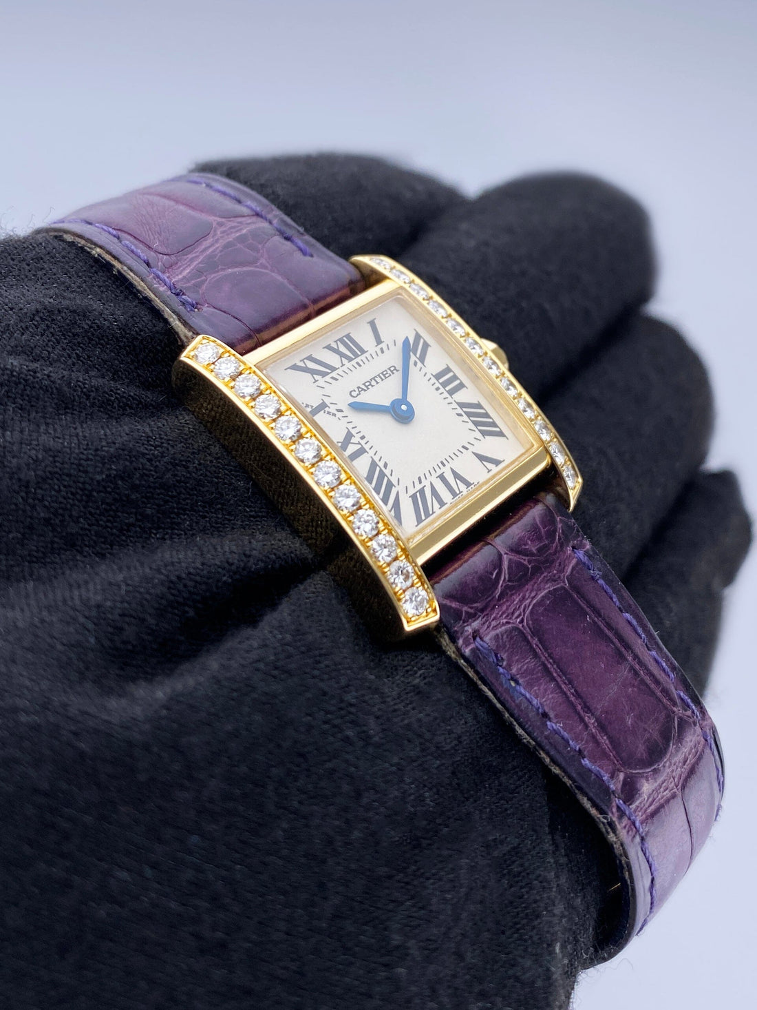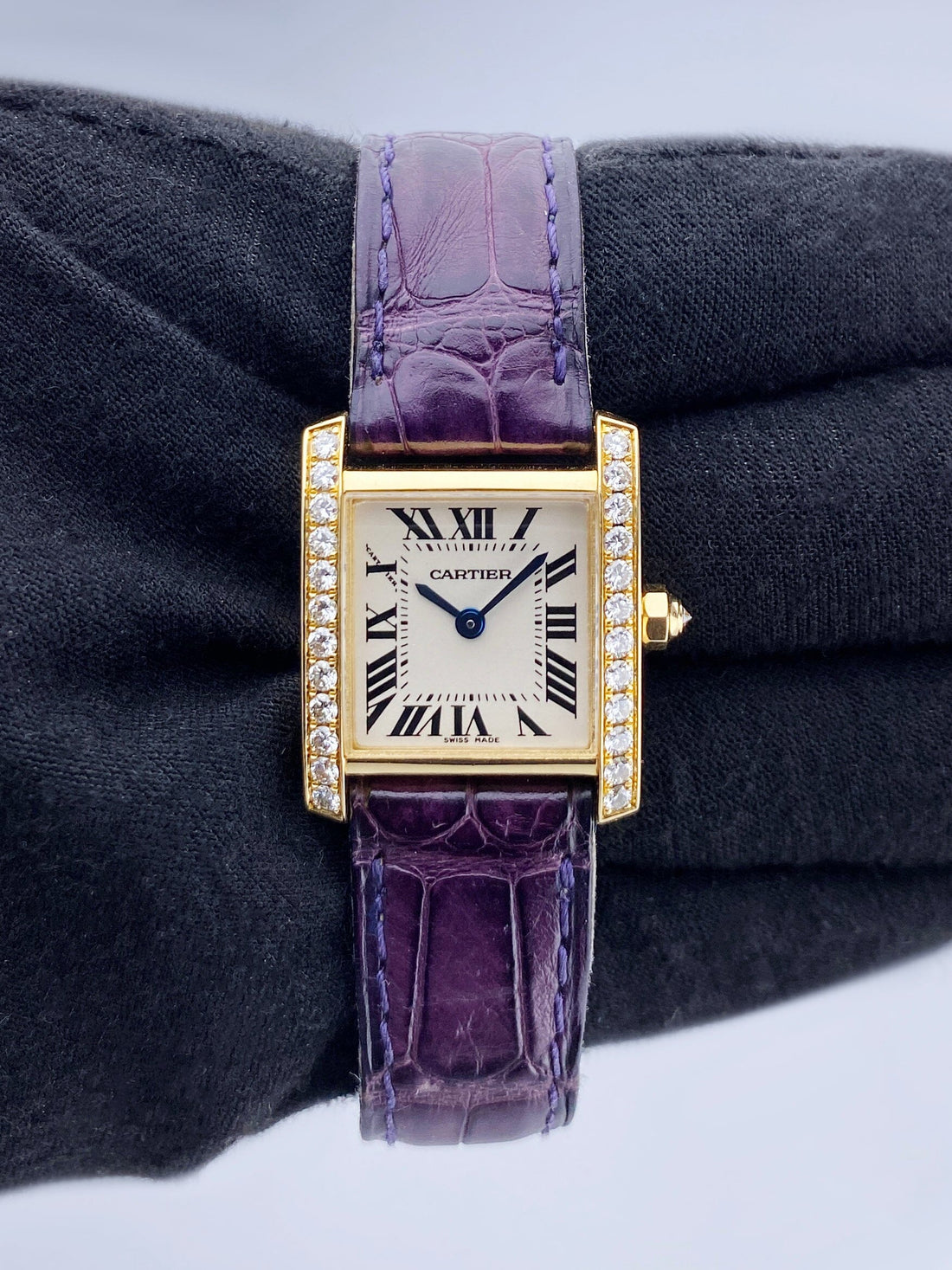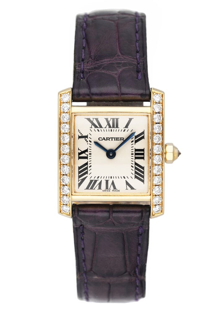 Cartier Tank Francaise Small WE100151 / 2385 Ladies Watch. 20mm 18K yellow gold case with the original factory diamond set. Off-White dial with blue steel hands and Roman numeral hour markers. Minute markers on the inner dial. Purple leather strap with deployment buckle. Will fit up to a 6.5-inch wrist. Sapphire crystal. 18K yellow gold case back. Quartz: Battery powered movement. This watch comes with original Box and Papers.