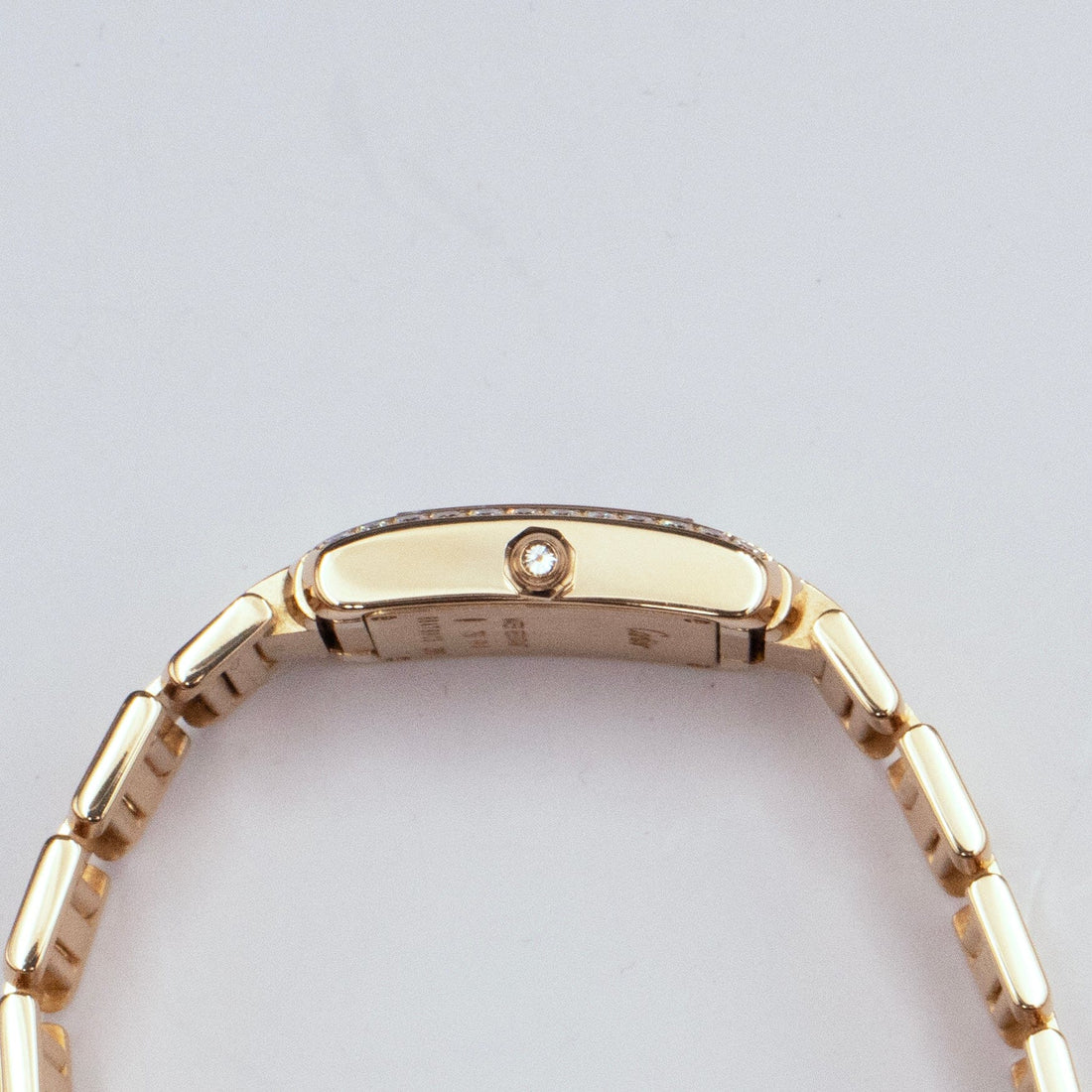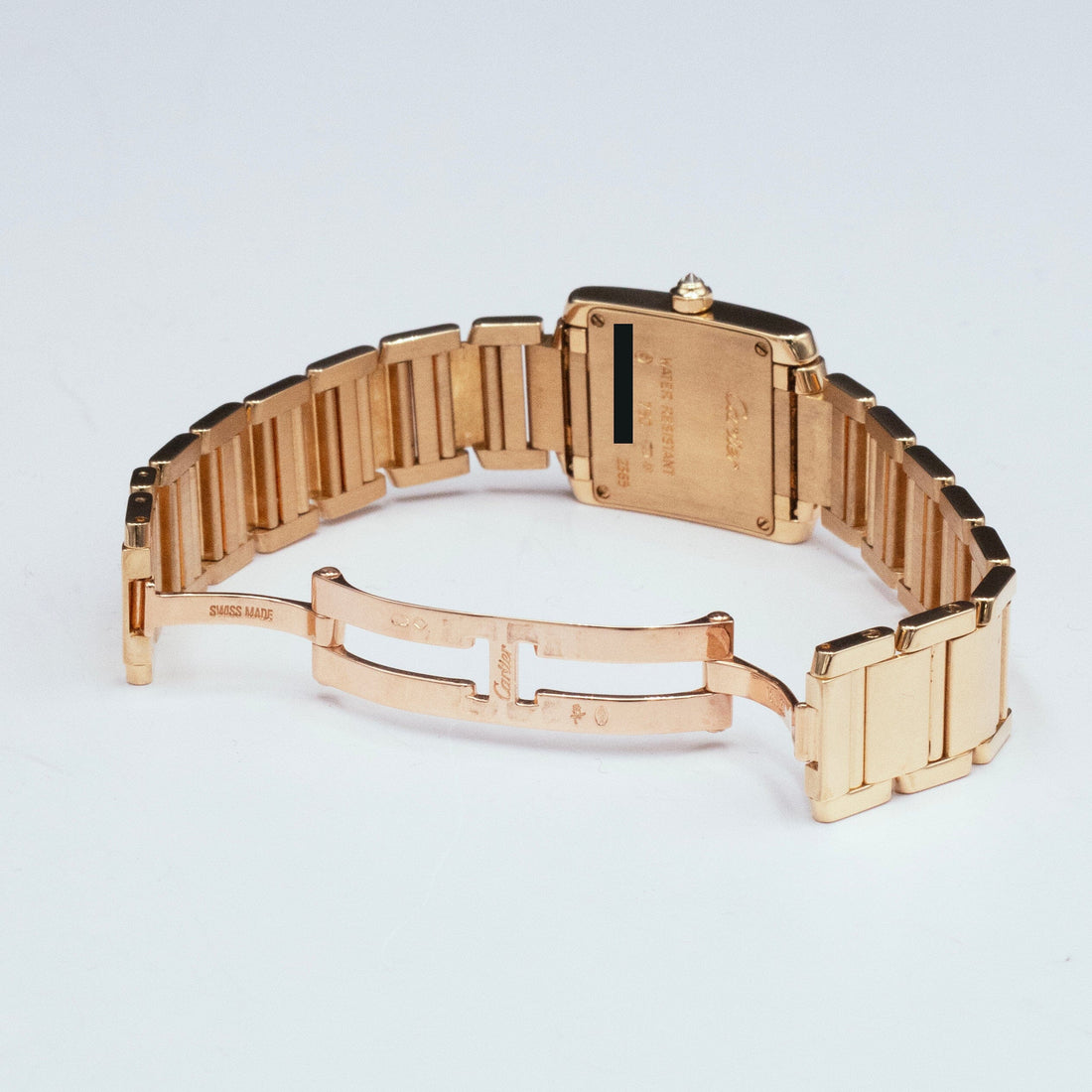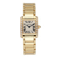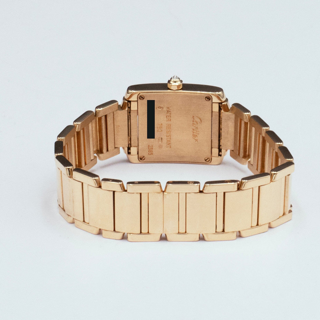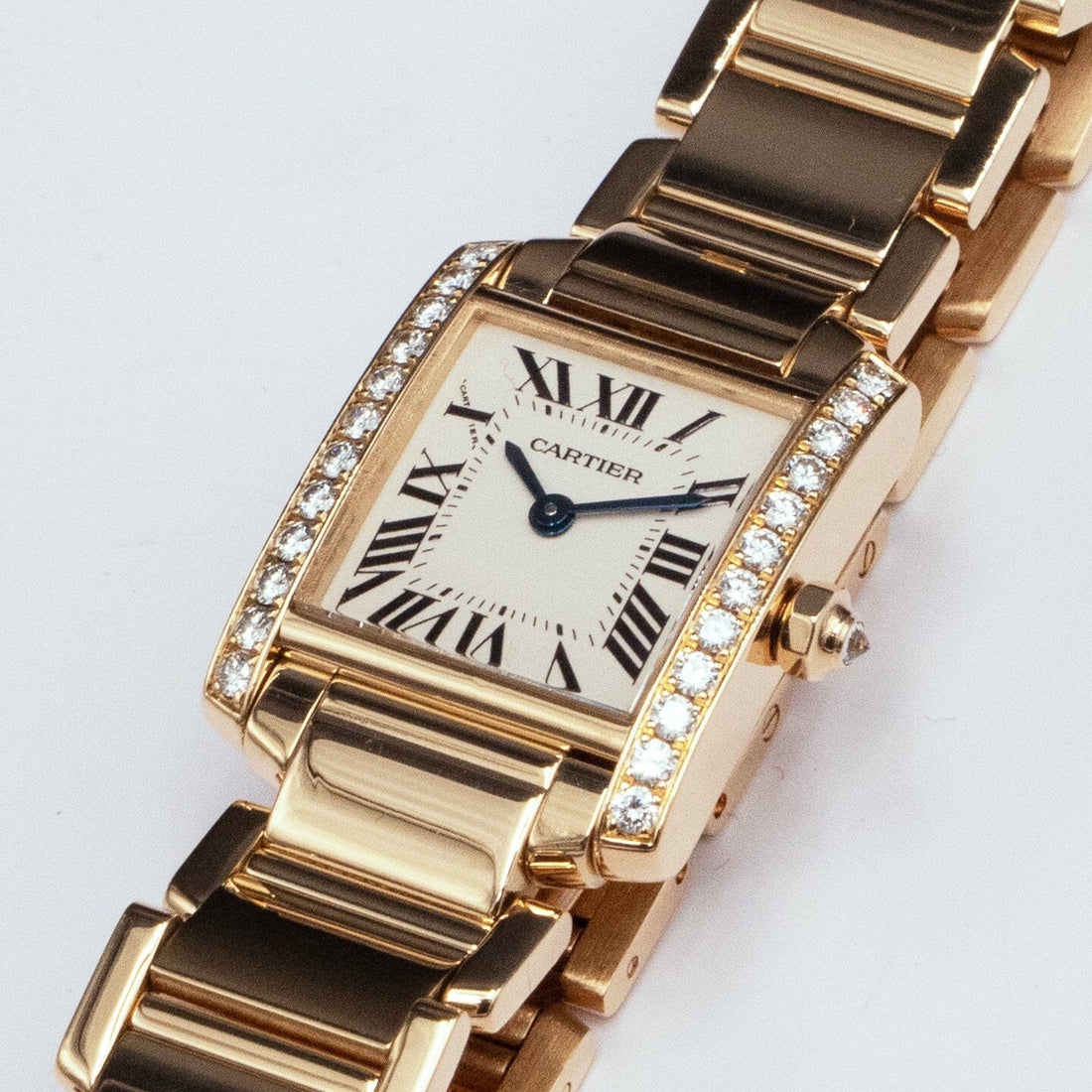 Cartier Tank Francaise WE1001R8 / 2385 Ladies Watch. 20mm 18K yellow gold case with the original factory diamond set. Off-White dial with blue steel hands and Roman numeral hour markers. Minute markers on the inner dial. 18K yellow gold bracelet with hidden butterfly. Will fit up to a 6-inch wrist. Sapphire crystal. 18K yellow gold case back. Quartz: Battery powered movement.