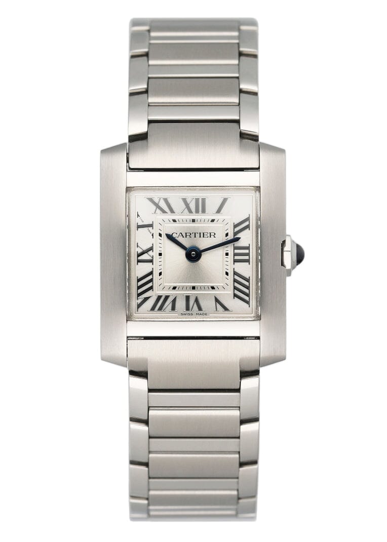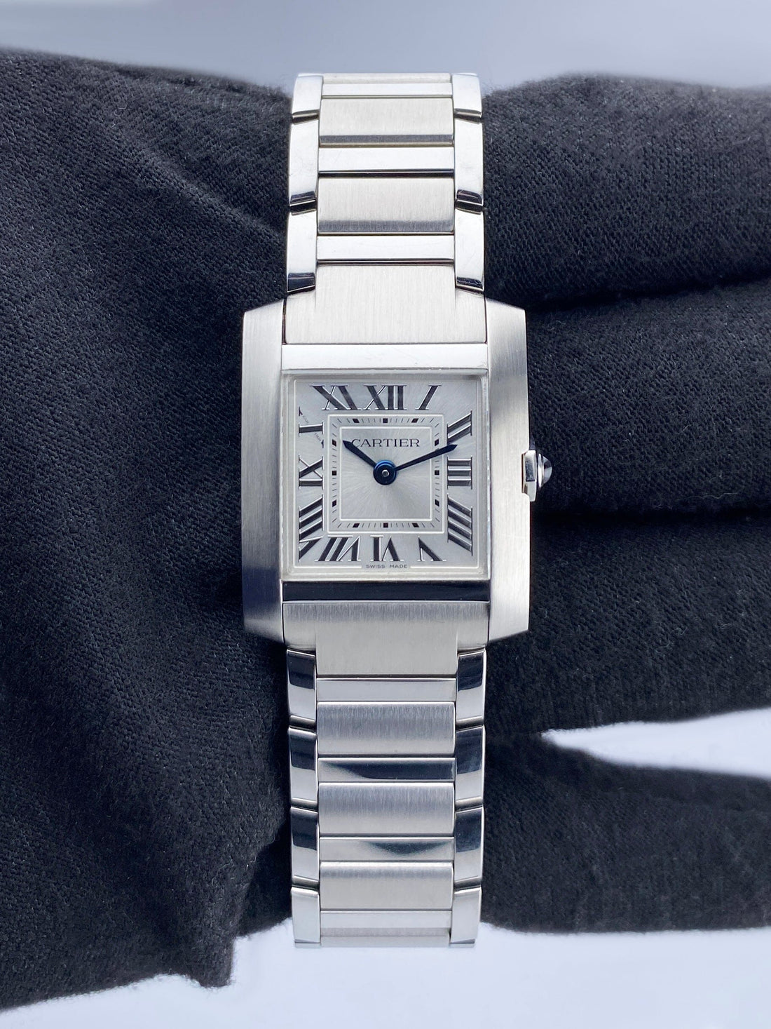 Cartier Tank Francaise WSTA0065 / 4472 Watch. 21.2mm stainless steel case. Silver dial with blue steel hands and Silver Roman numeral hour markers. Minute markers on the inner dial. Stainless steel bracelet with hidden butterfly clasp. Will fit up to a 6.25-inch wrist. Sapphire crystal. Stainless steel case back. Quartz: Battery powered movement.