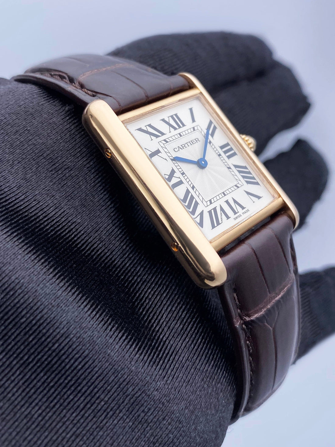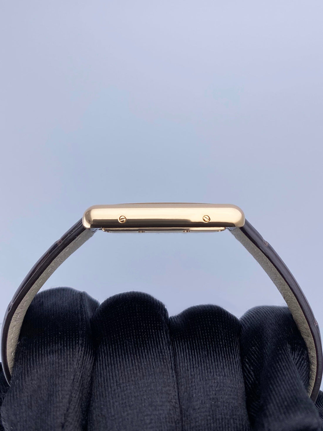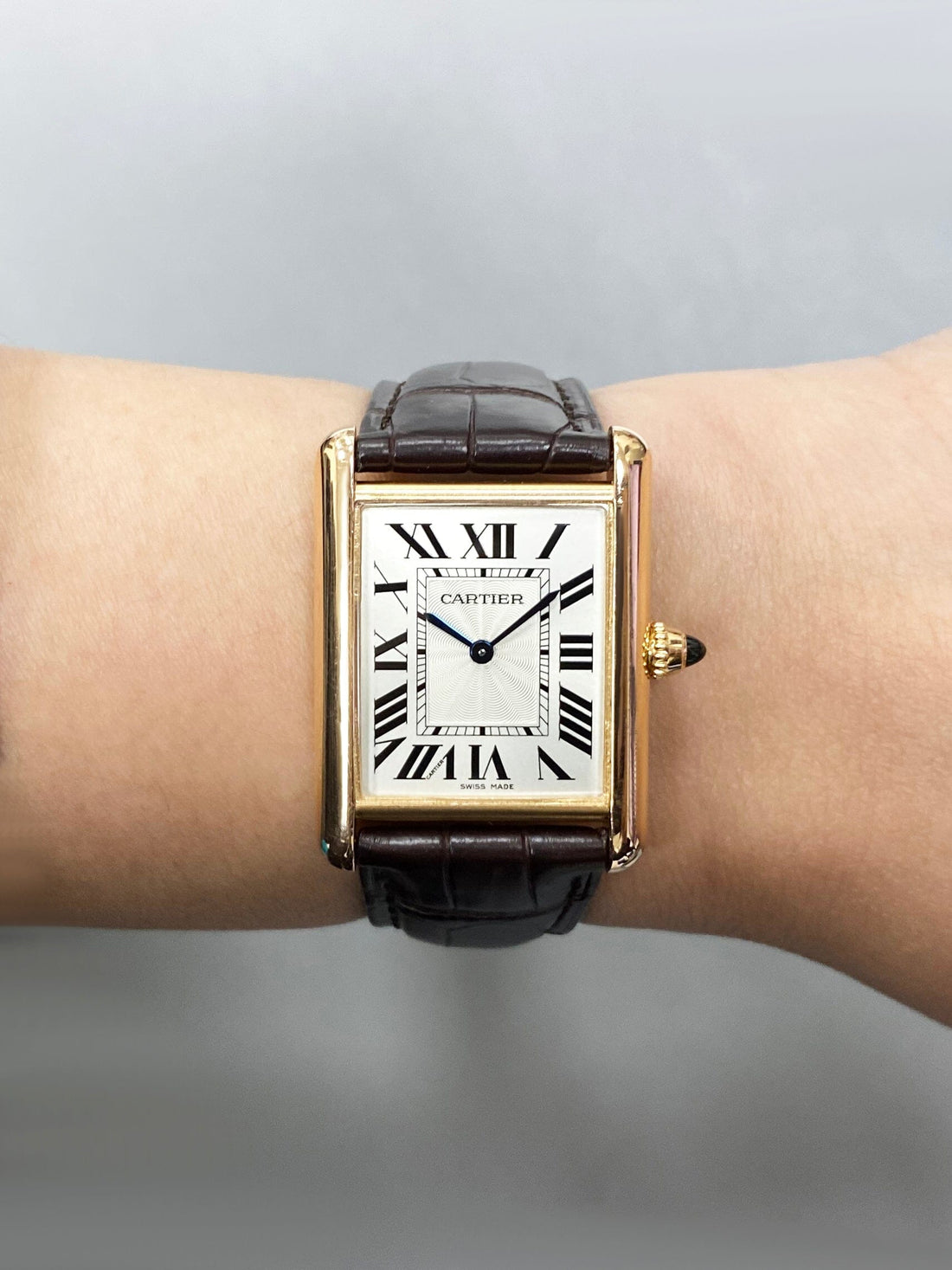 Cartier Tank Louis Large WGTA0011 / 3816 Watch. 25.5mm 18K rose gold case. Silver dial with blue hands and black Roman numeral hour markers. Minute markers on the inner dial. Brown leather strap with 18K rose gold buckle. It will fit up to a 7-Inch wrist. Sapphire crystal. 18K yellow gold case back. Mechanical hand winding movement. This watch comes with original Box and Papers.
