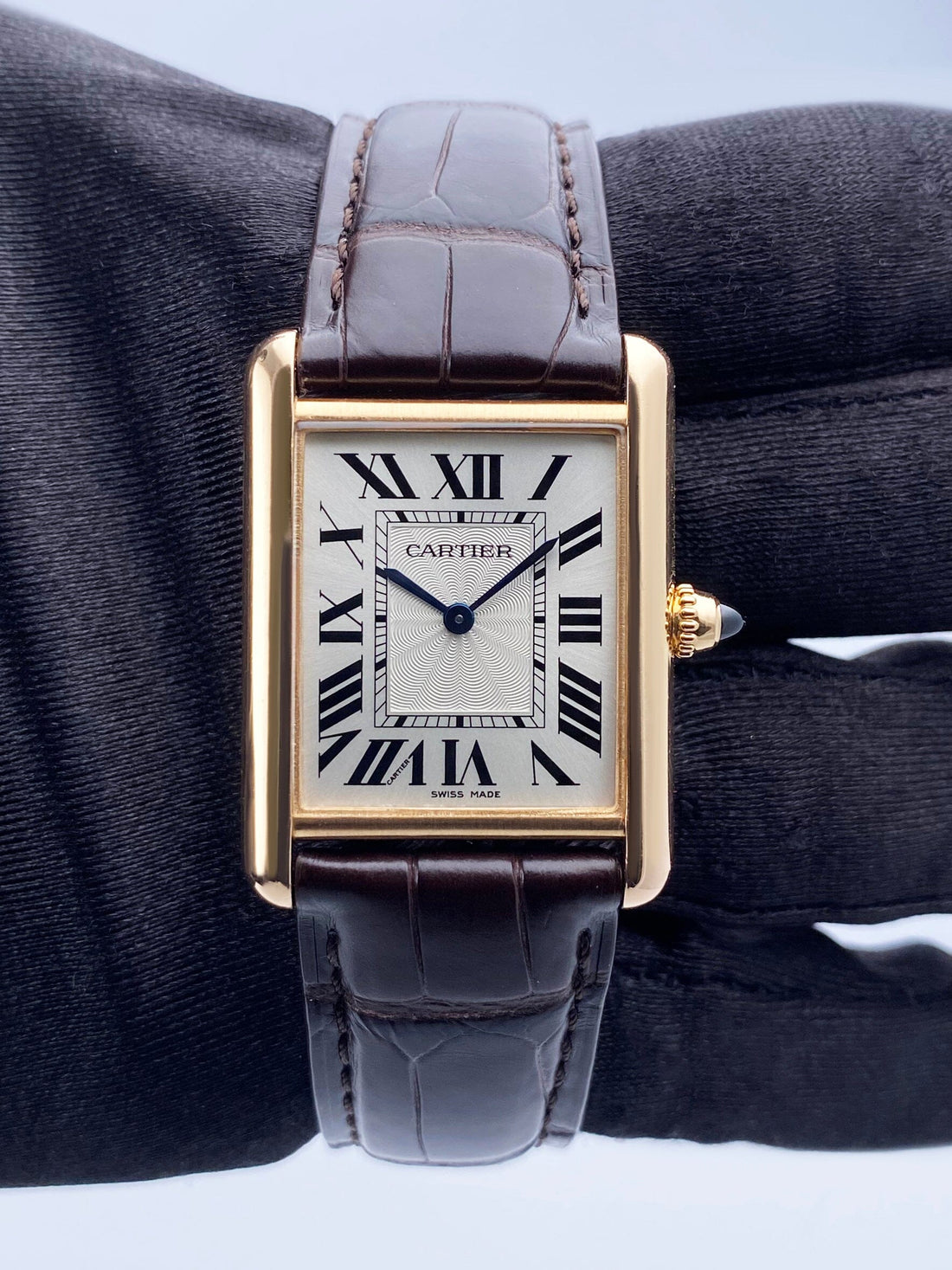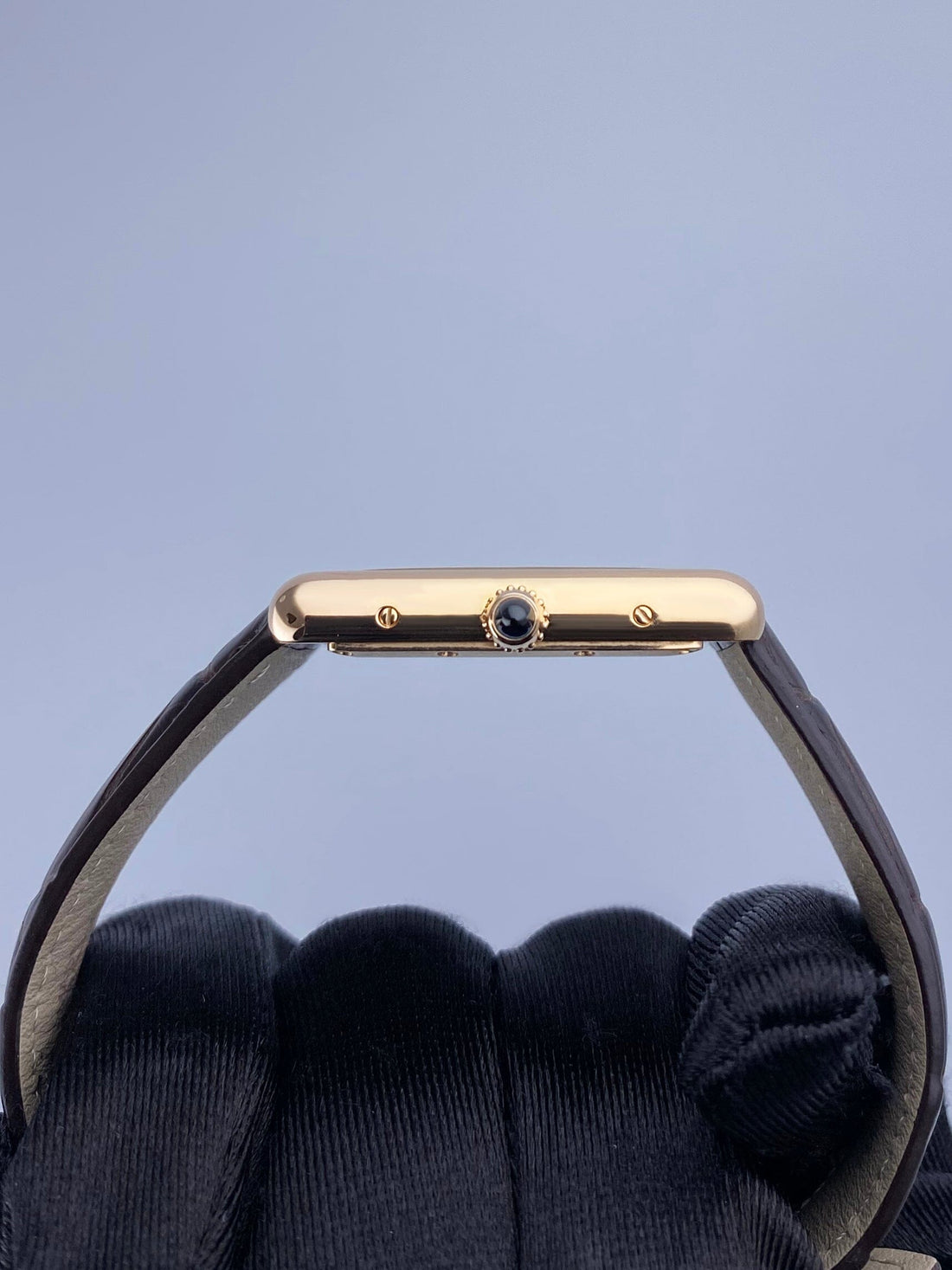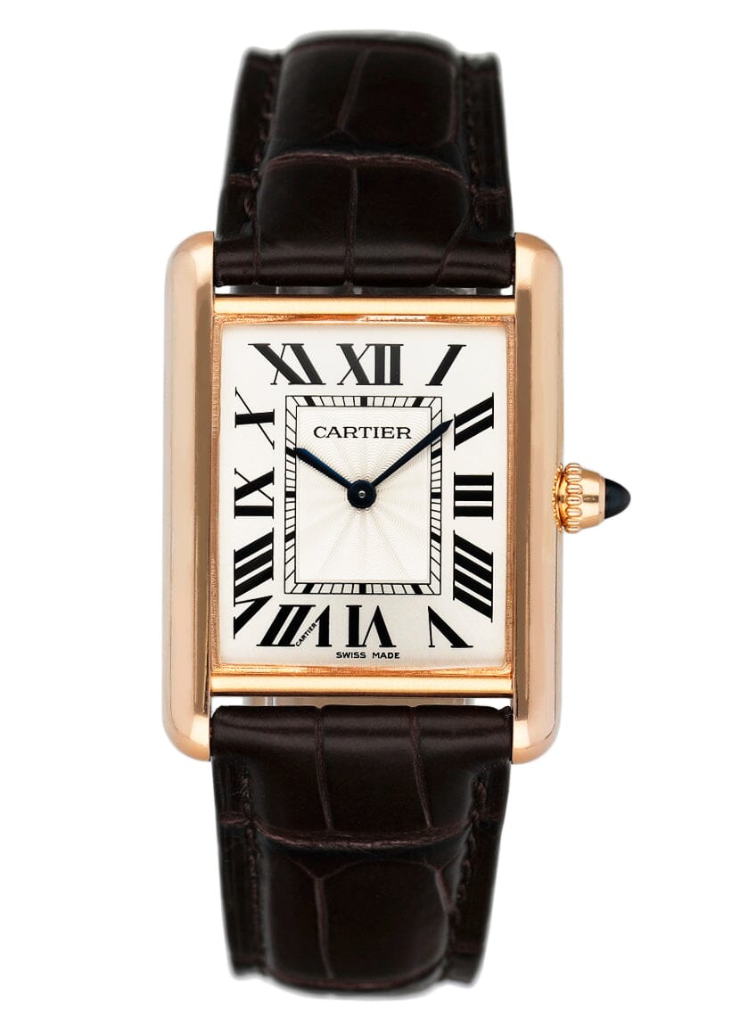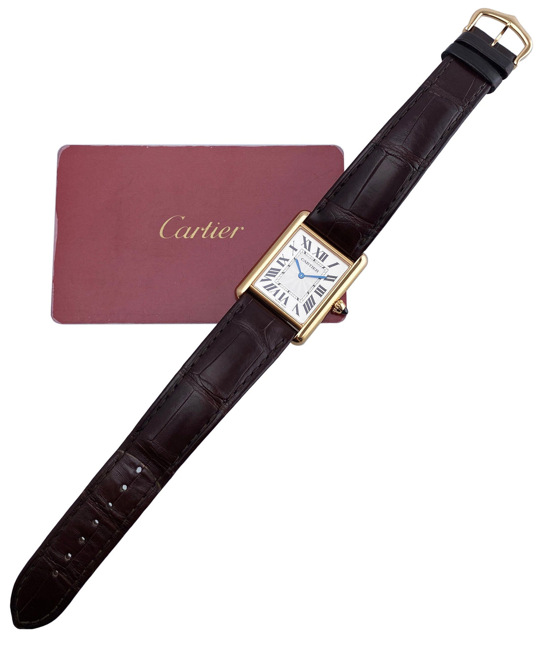 Cartier Tank Louis Large WGTA0011 / 3816 Watch. 25.5mm 18K rose gold case. Silver dial with blue hands and black Roman numeral hour markers. Minute markers on the inner dial. Brown leather strap with 18K rose gold buckle. It will fit up to a 7-Inch wrist. Sapphire crystal. 18K yellow gold case back. Mechanical hand winding movement. This watch comes with original Box and Papers.