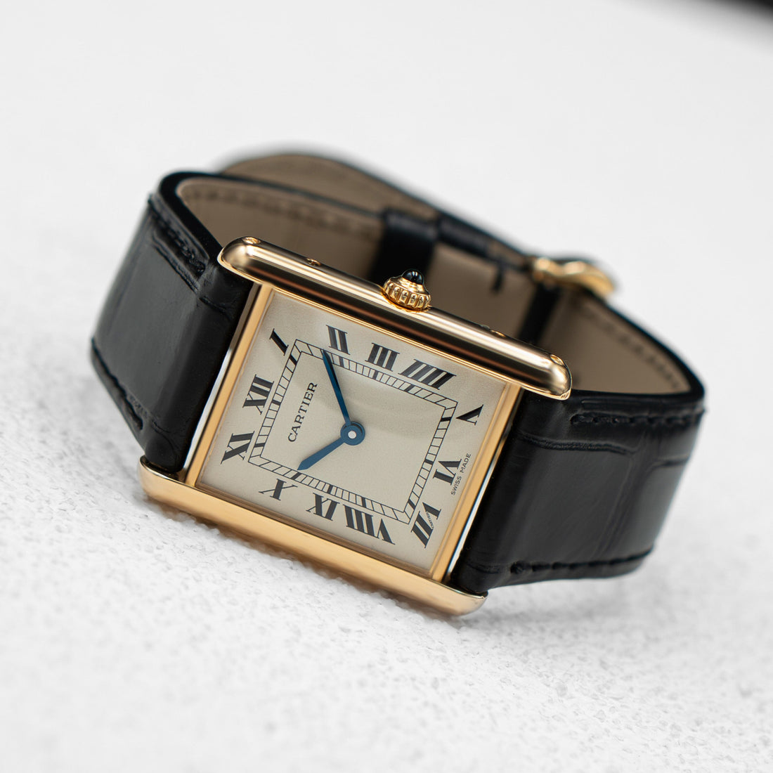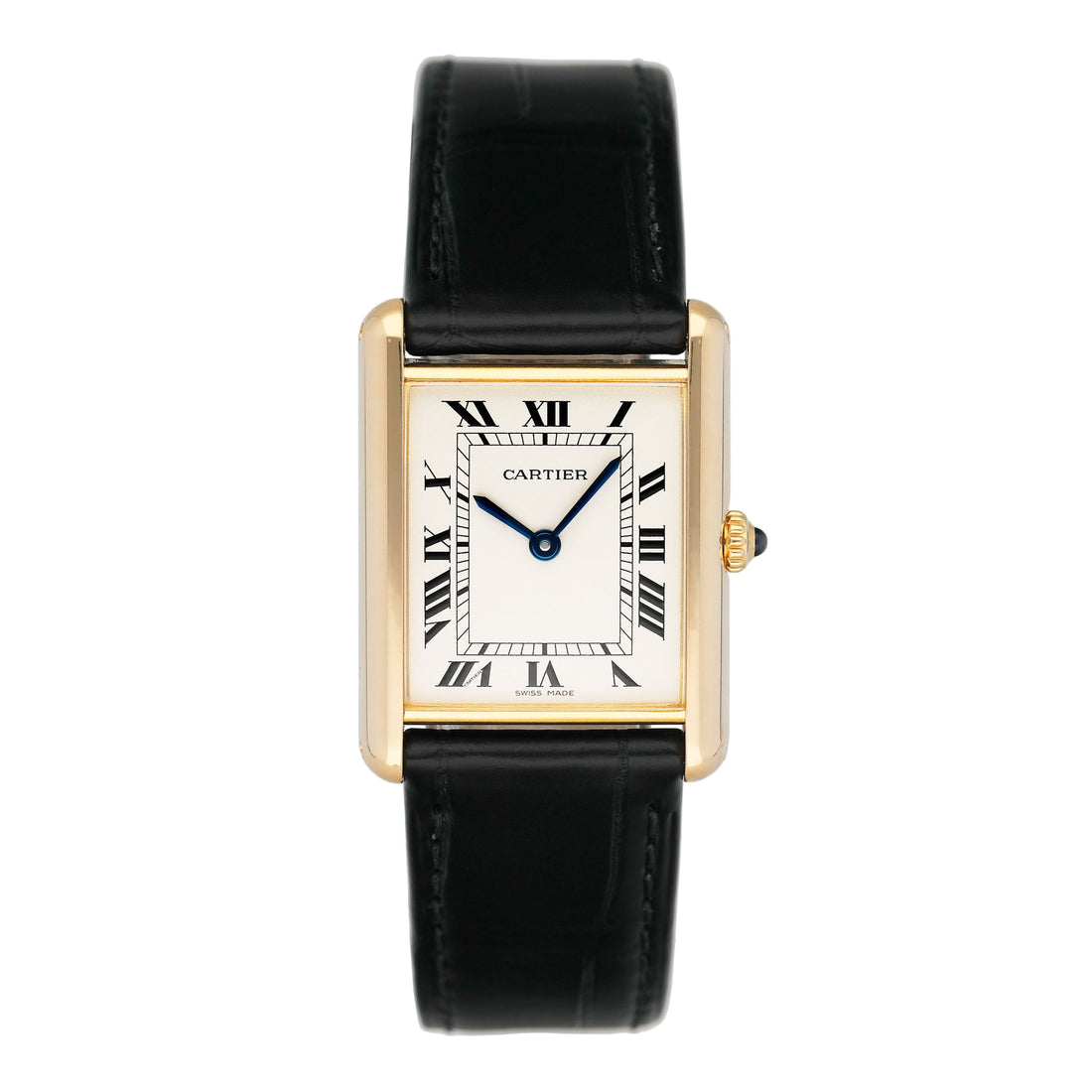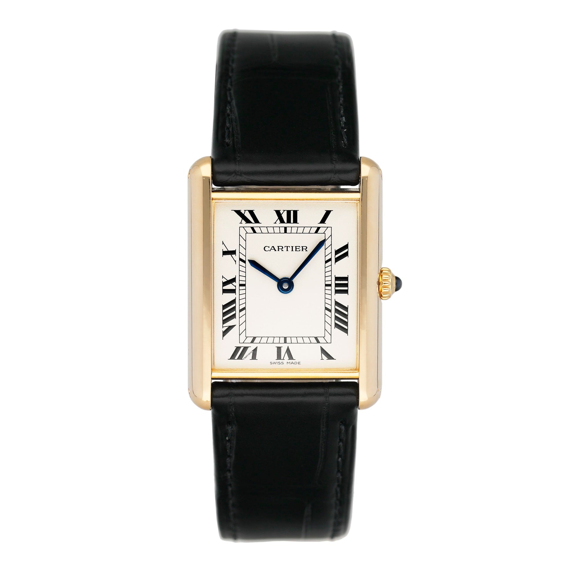 Cartier Tank Louis W1512856 Ladies Watch. 24mm 18K yellow gold case. Off-White dial with blue steel hands and Roman numeral hour markers. Minute markers on the inner dial. Black leather strap with 18K yellow gold buckle. Will fit up to a 6-Inch wrist. Sapphire crystal. 18K yellow gold case back. Quartz: Battery powered movement.
