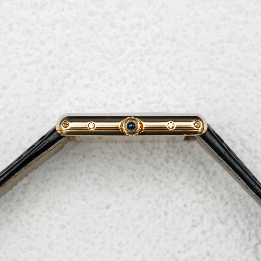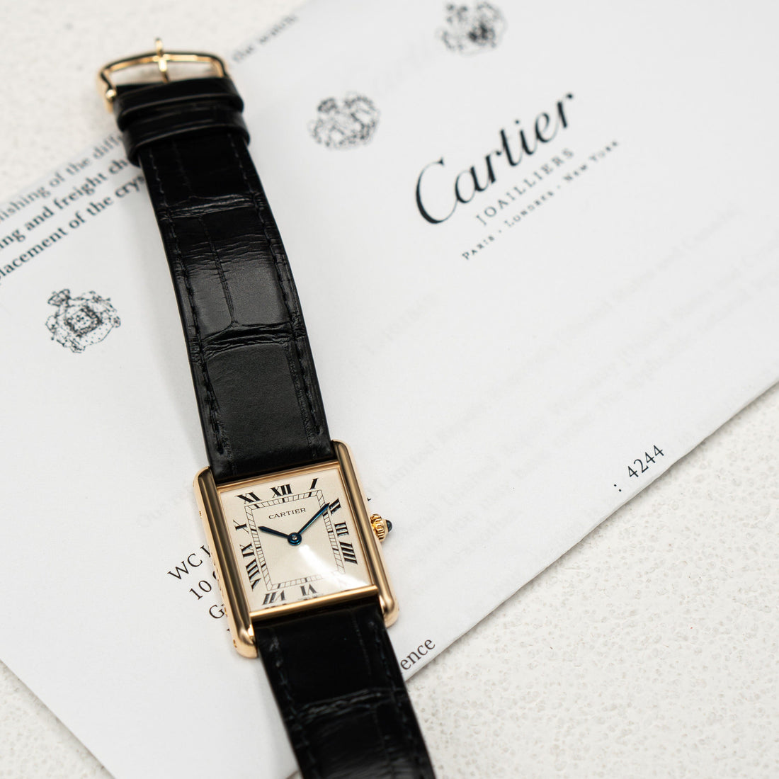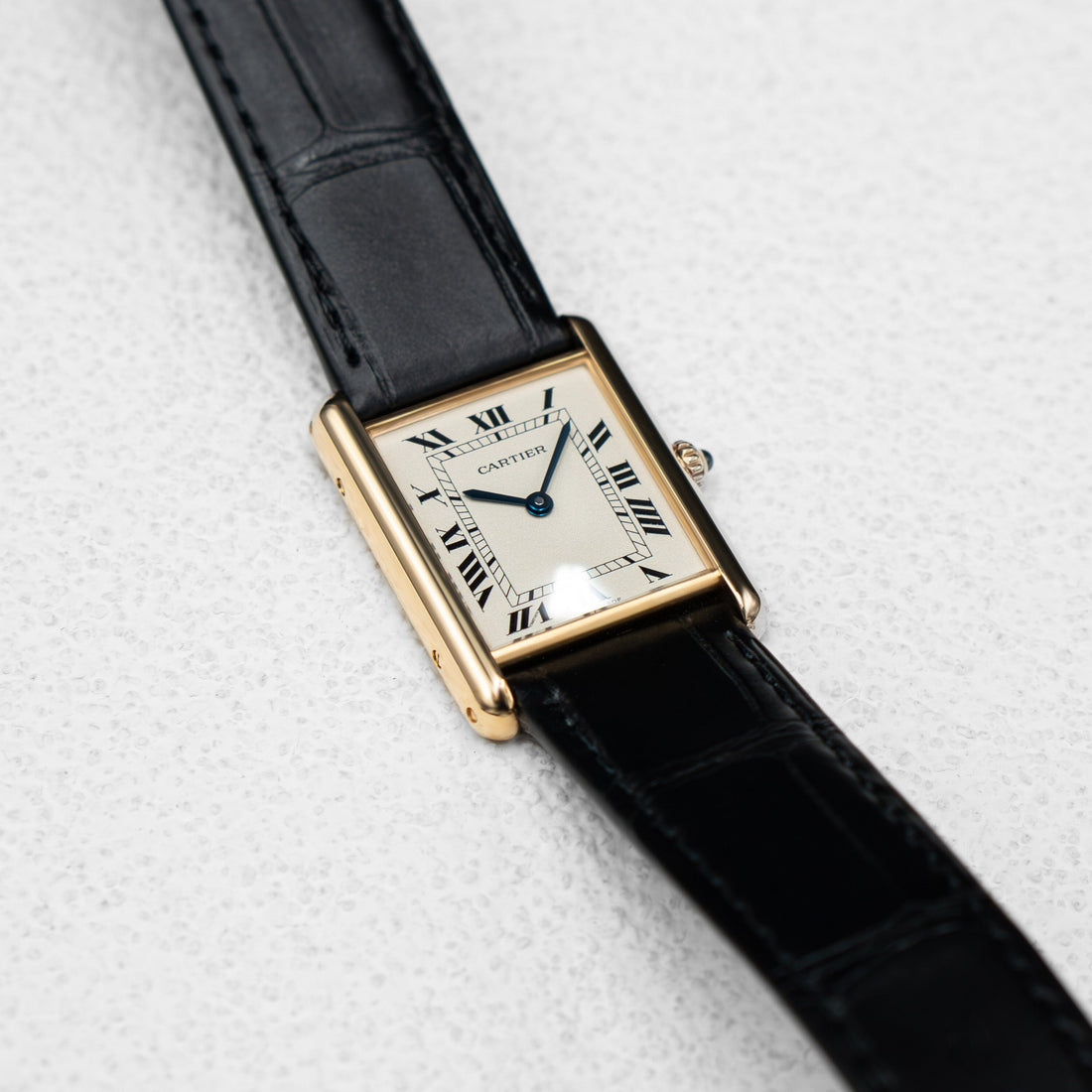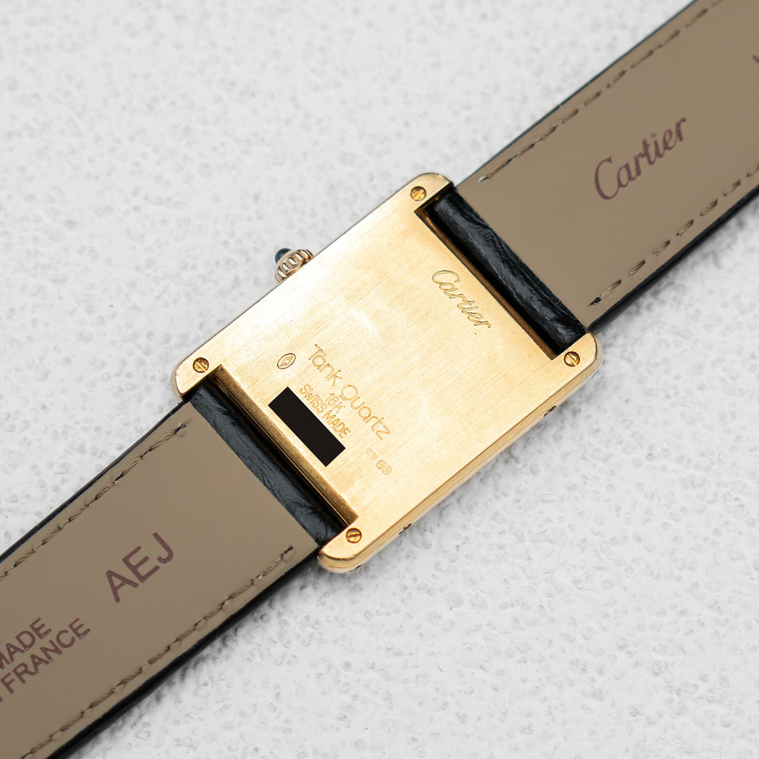 Cartier Tank Louis W1512856 Ladies Watch. 24mm 18K yellow gold case. Off-White dial with blue steel hands and Roman numeral hour markers. Minute markers on the inner dial. Black leather strap with 18K yellow gold buckle. Will fit up to a 6-Inch wrist. Sapphire crystal. 18K yellow gold case back. Quartz: Battery powered movement.