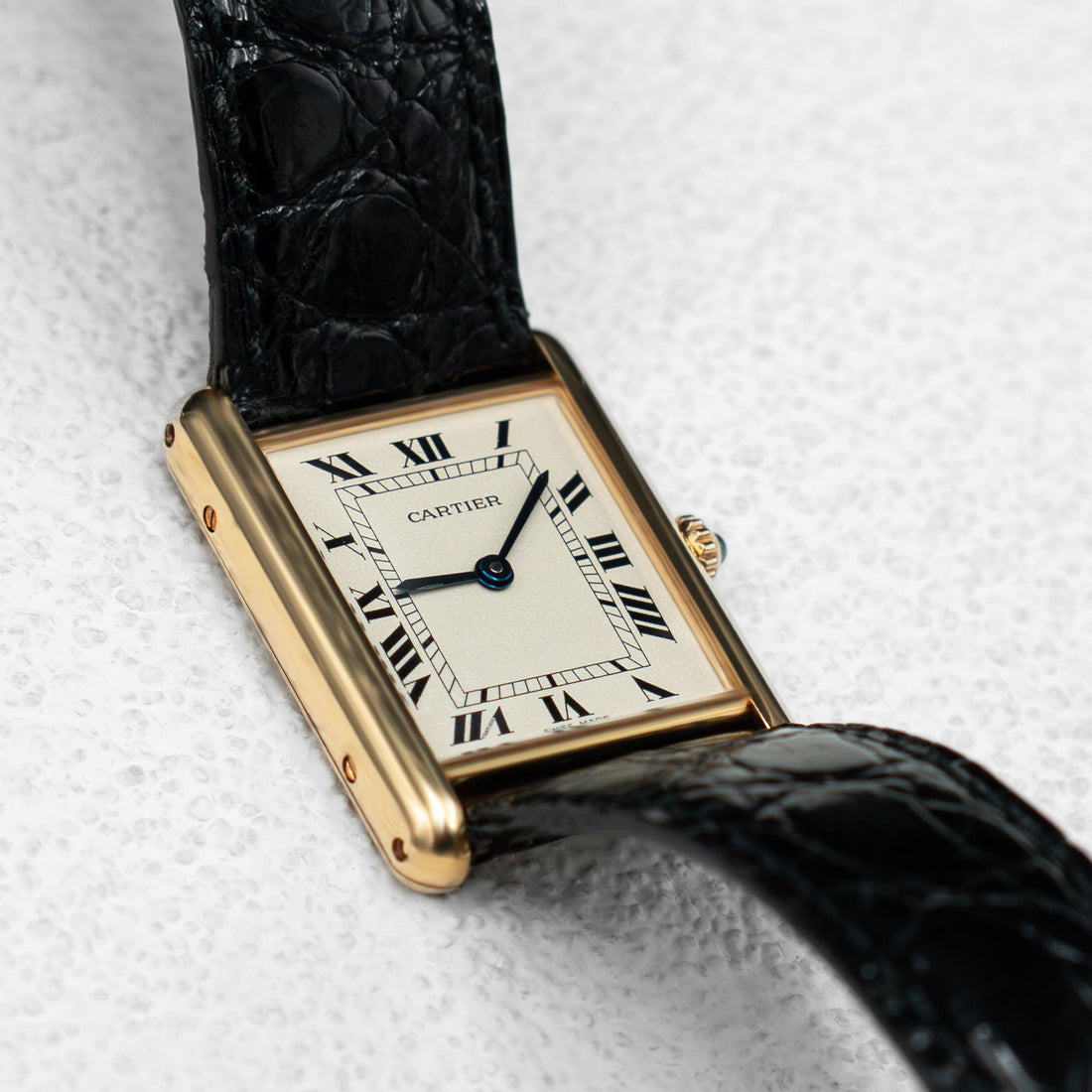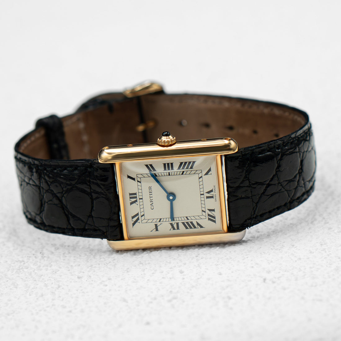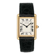Cartier Tank Louis W1512856 Ladies Watch. 24mm 18K yellow gold case. White dial with blue steel hands and Roman numeral hour markers. Minute markers on the inner dial. Black leather strap with 18K yellow gold buckle. Will fit up to a 7-Inch wrist. Sapphire crystal. 18K yellow gold case back. Quartz: Battery powered movement.