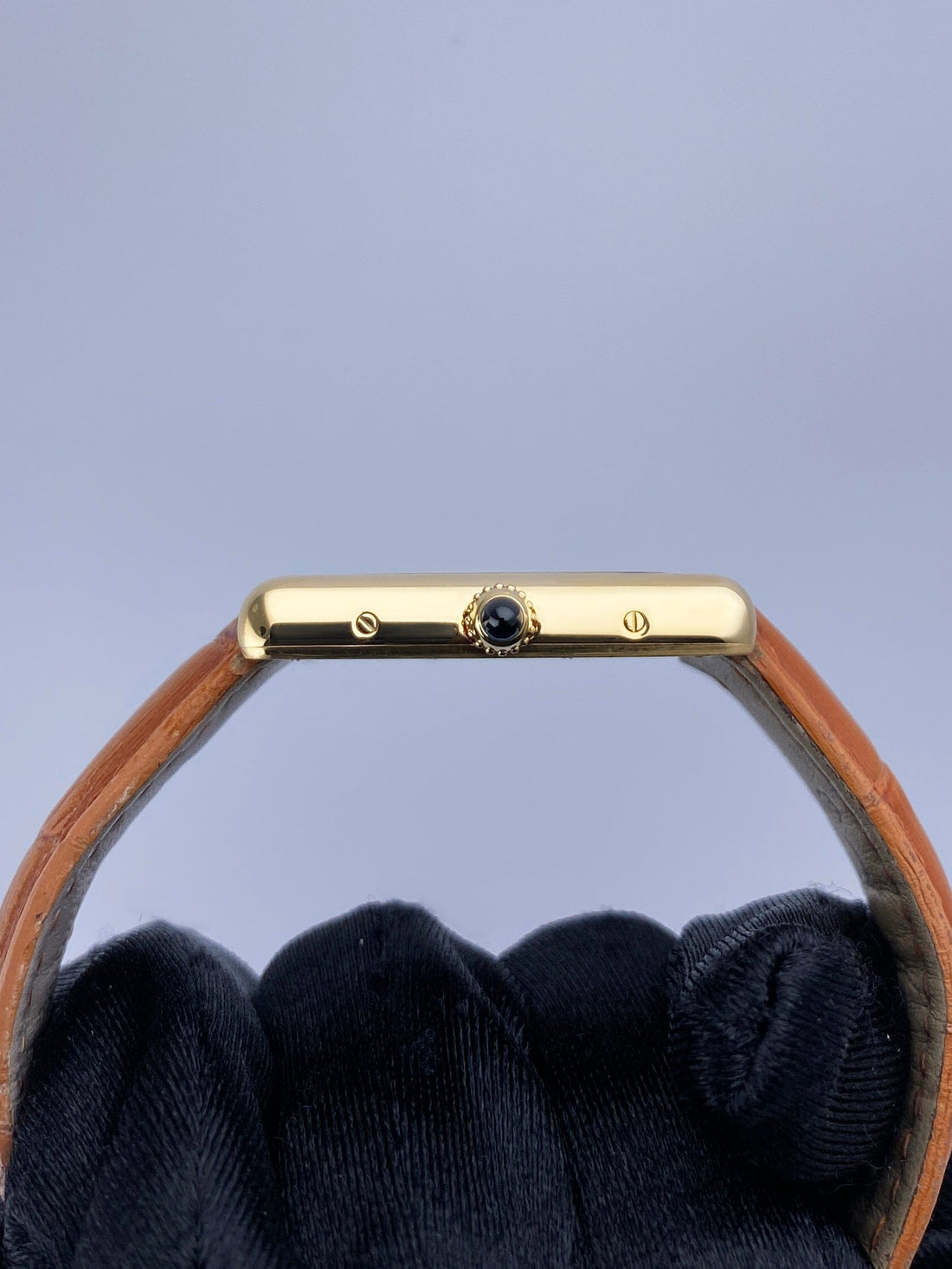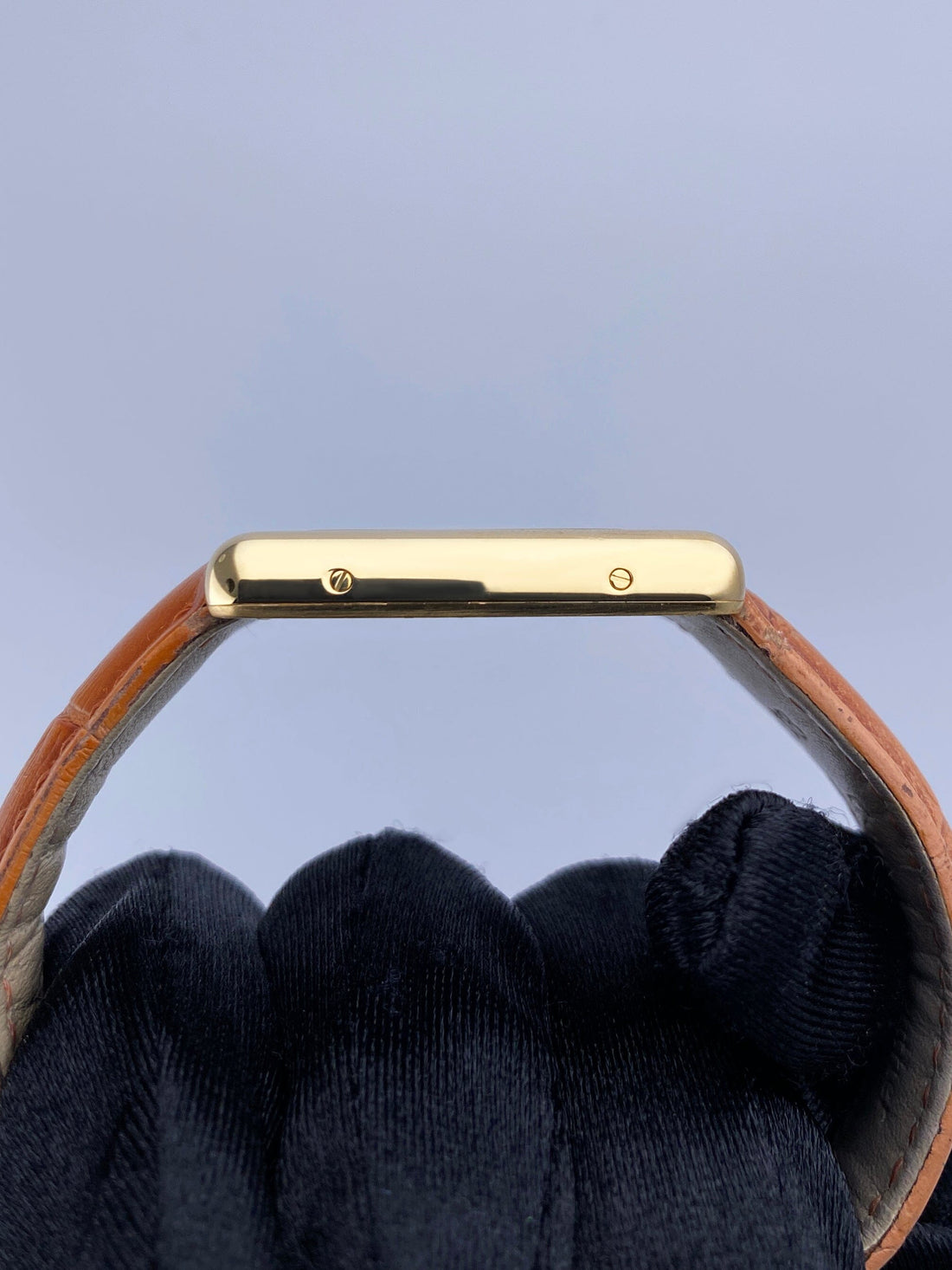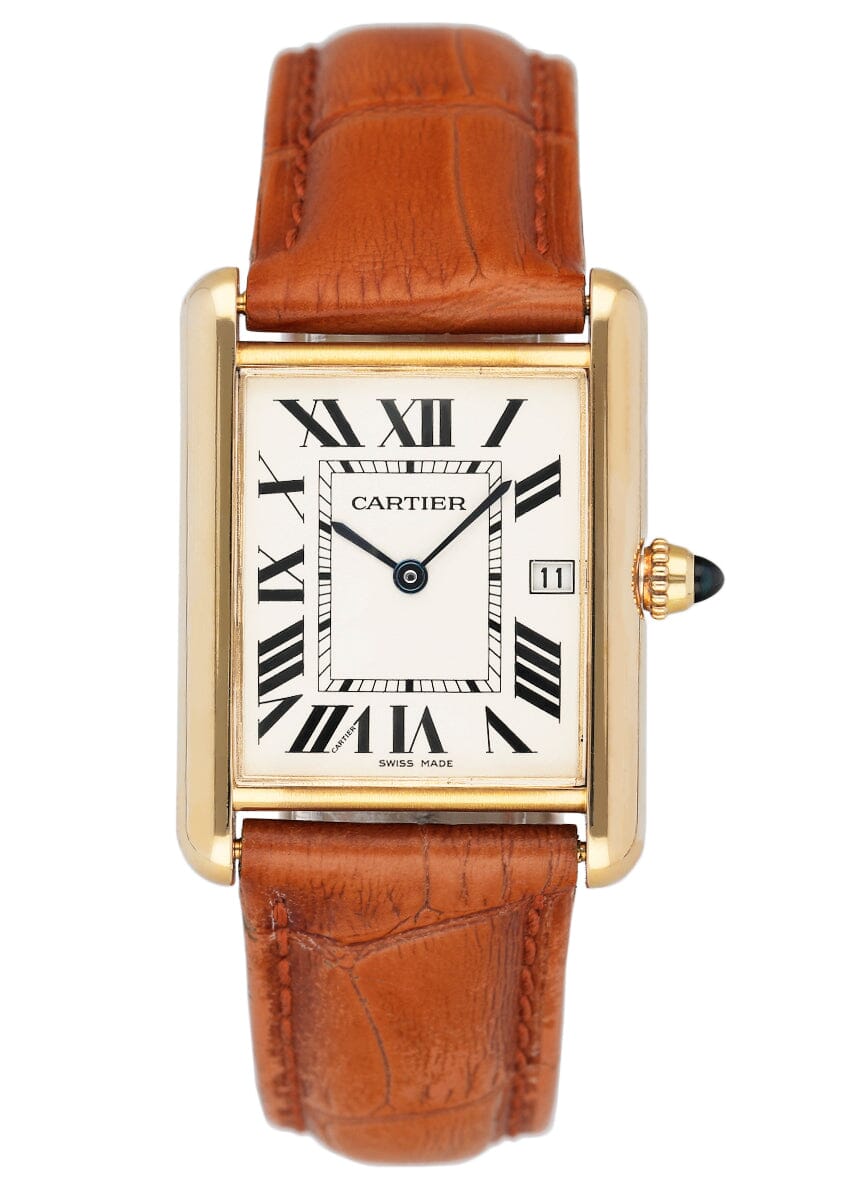 Cartier Tank Louis W1529756 / 2441 Mens Watch. 25.5mm 18K yellow gold case. Off-White dial with blue hands and black Roman numeral hour markers. Minute markers on the inner dial. Brown Aftermarket leather strap with 18K yellow gold buckle. Will fit up to a 7-Inch wrist. Sapphire crystal. 18K yellow gold case back. Quartz: Battery powered movement.