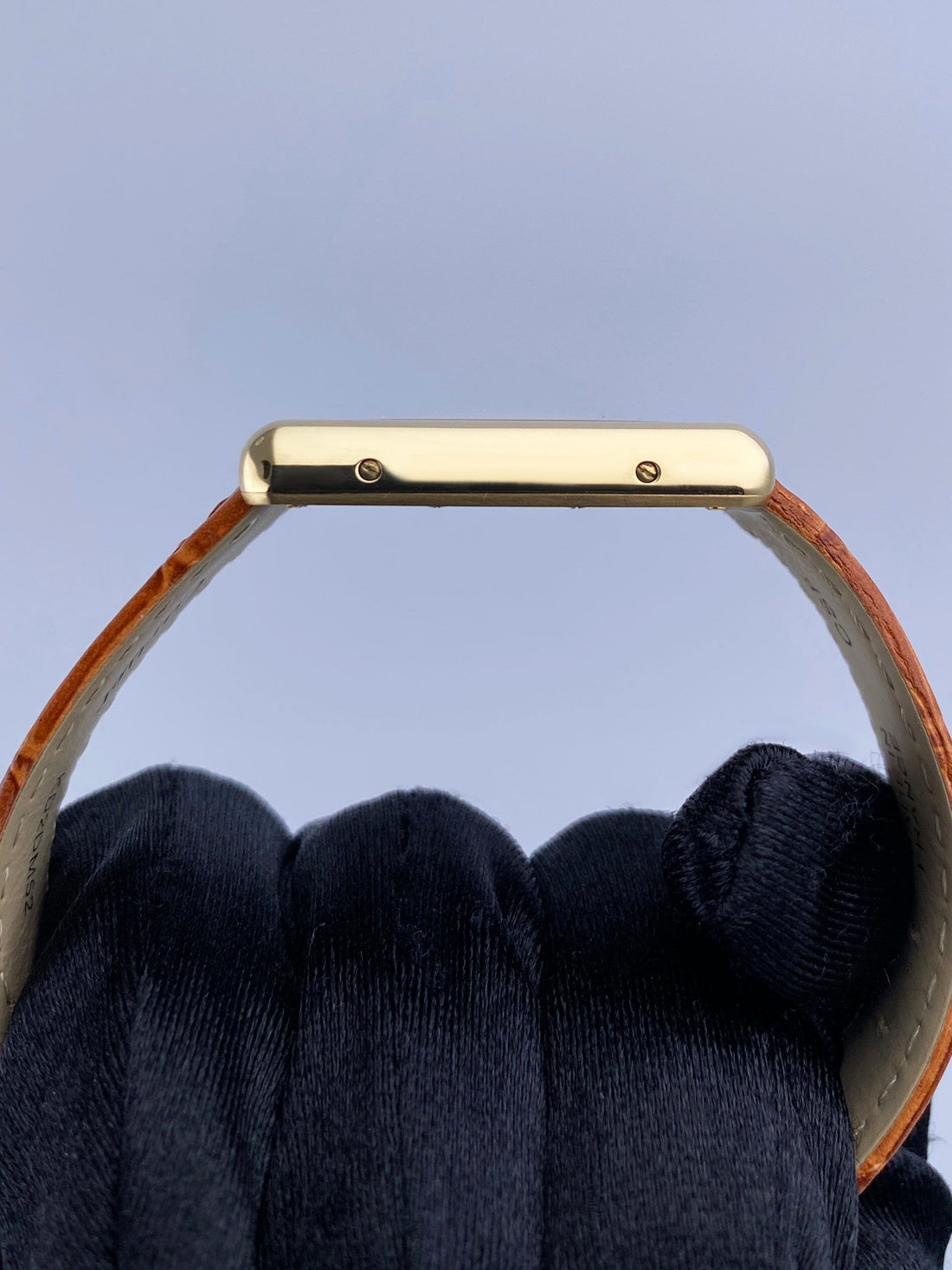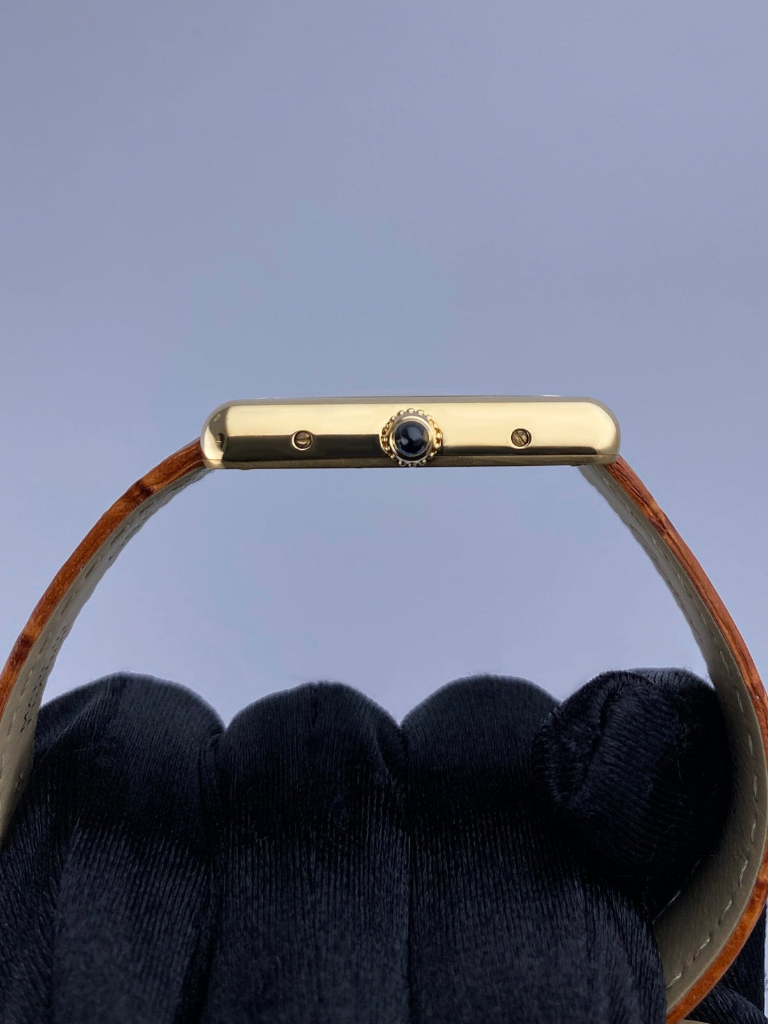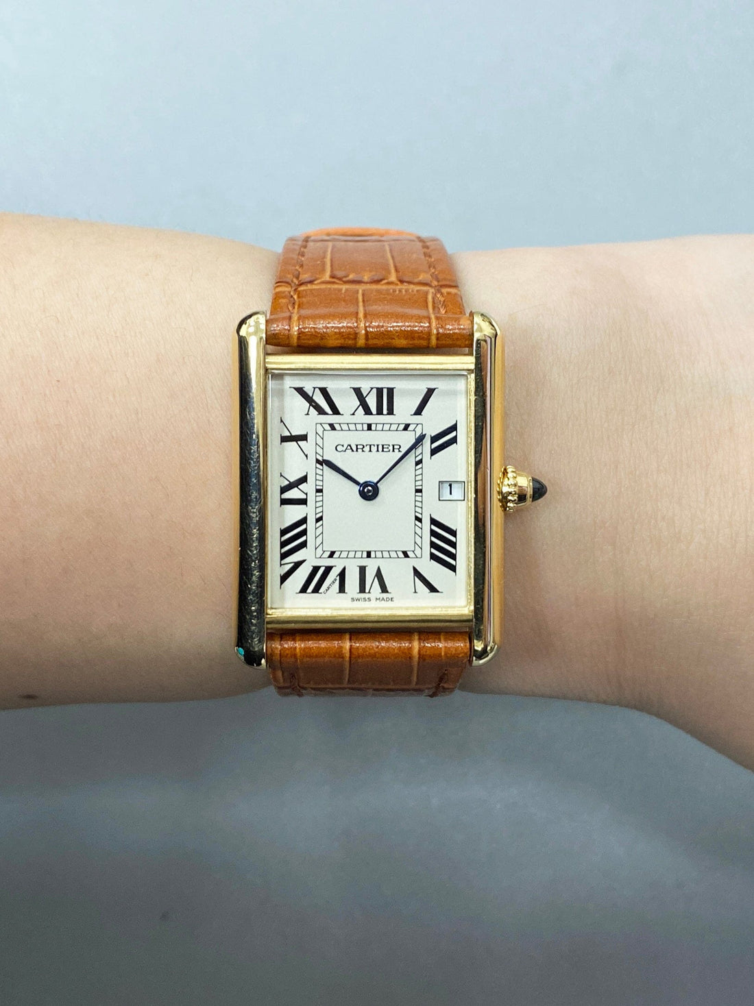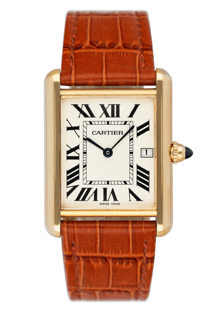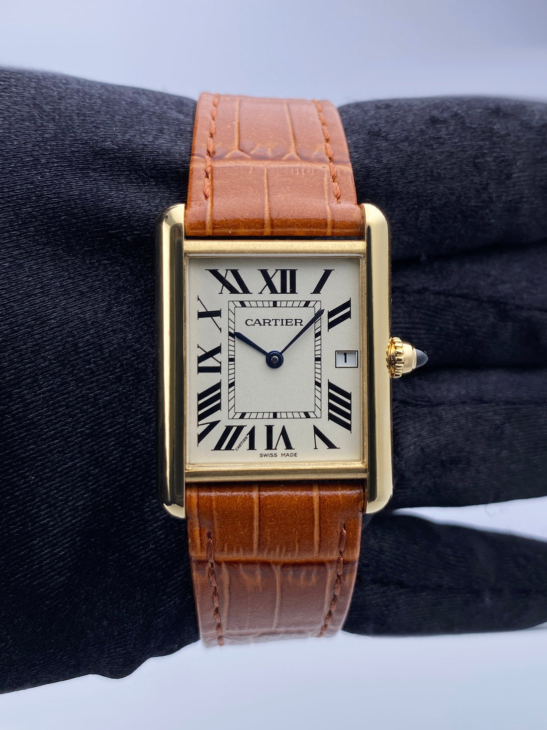 Cartier Tank Louis W1529756 / 2441 Mens Watch. 25.5mm 18K yellow gold case. Off-White dial with blue hands and black Roman numeral hour markers. Minute markers on the inner dial. Brown leather strap with 18K yellow gold buckle. Will fit up to a 7-Inch wrist. Sapphire crystal. 18K yellow gold case back. Quartz: Battery powered movement.