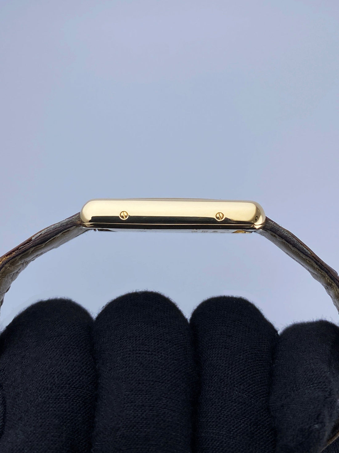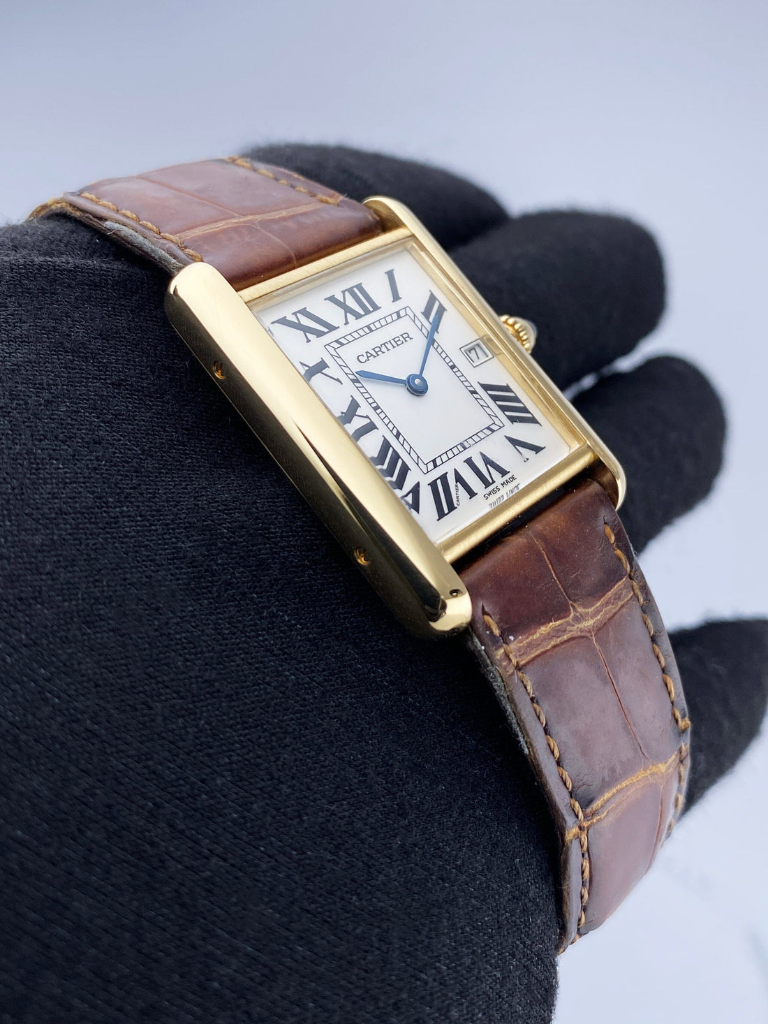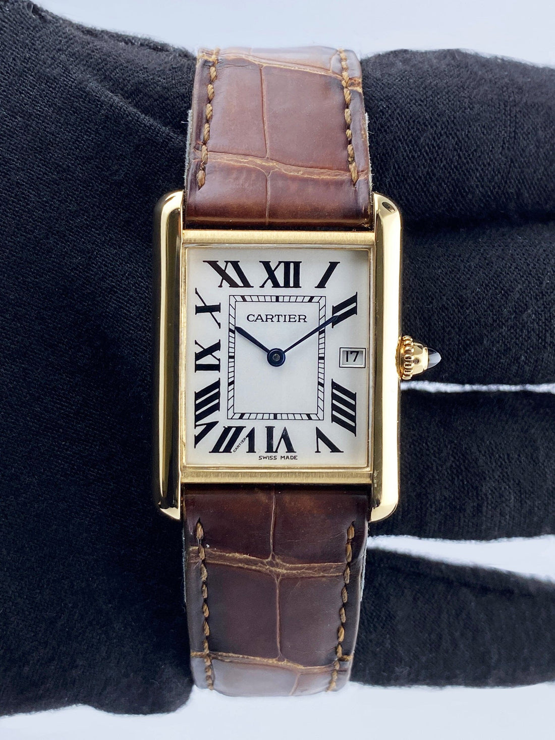 Cartier Tank Louis W1529756 / 2441 Mens Watch. 25.5mm 18K yellow gold case. Silver dial with blue hands and black Roman numeral hour markers. Minute markers on the inner dial. Brown leather strap with 18K yellow gold buckle. Will fit up to a 7.5-Inch wrist. Sapphire crystal. 18K yellow gold case back. Quartz: Battery powered movement.