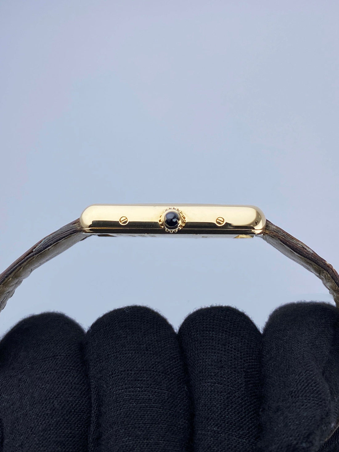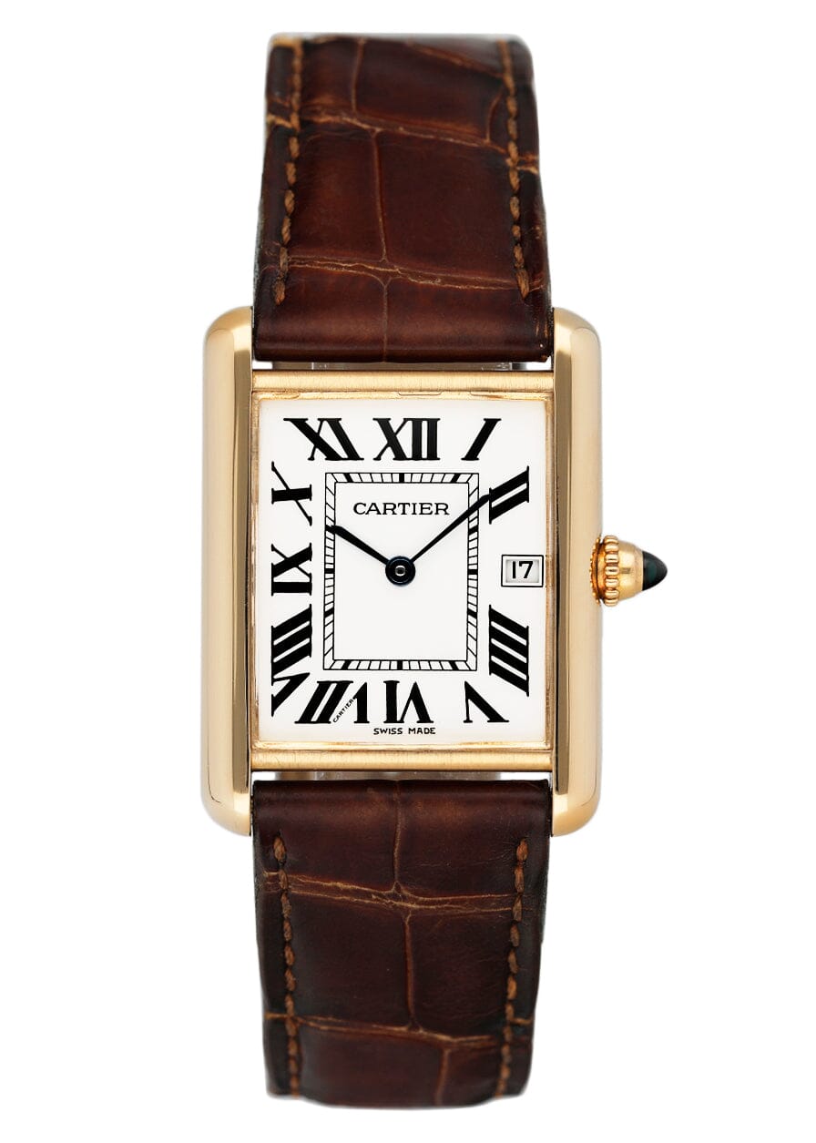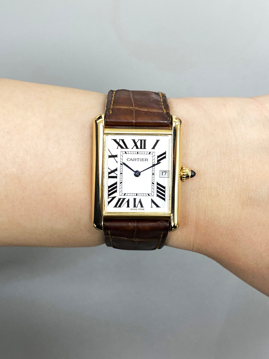 Cartier Tank Louis W1529756 / 2441 Mens Watch. 25.5mm 18K yellow gold case. Silver dial with blue hands and black Roman numeral hour markers. Minute markers on the inner dial. Brown leather strap with 18K yellow gold buckle. Will fit up to a 7.5-Inch wrist. Sapphire crystal. 18K yellow gold case back. Quartz: Battery powered movement.