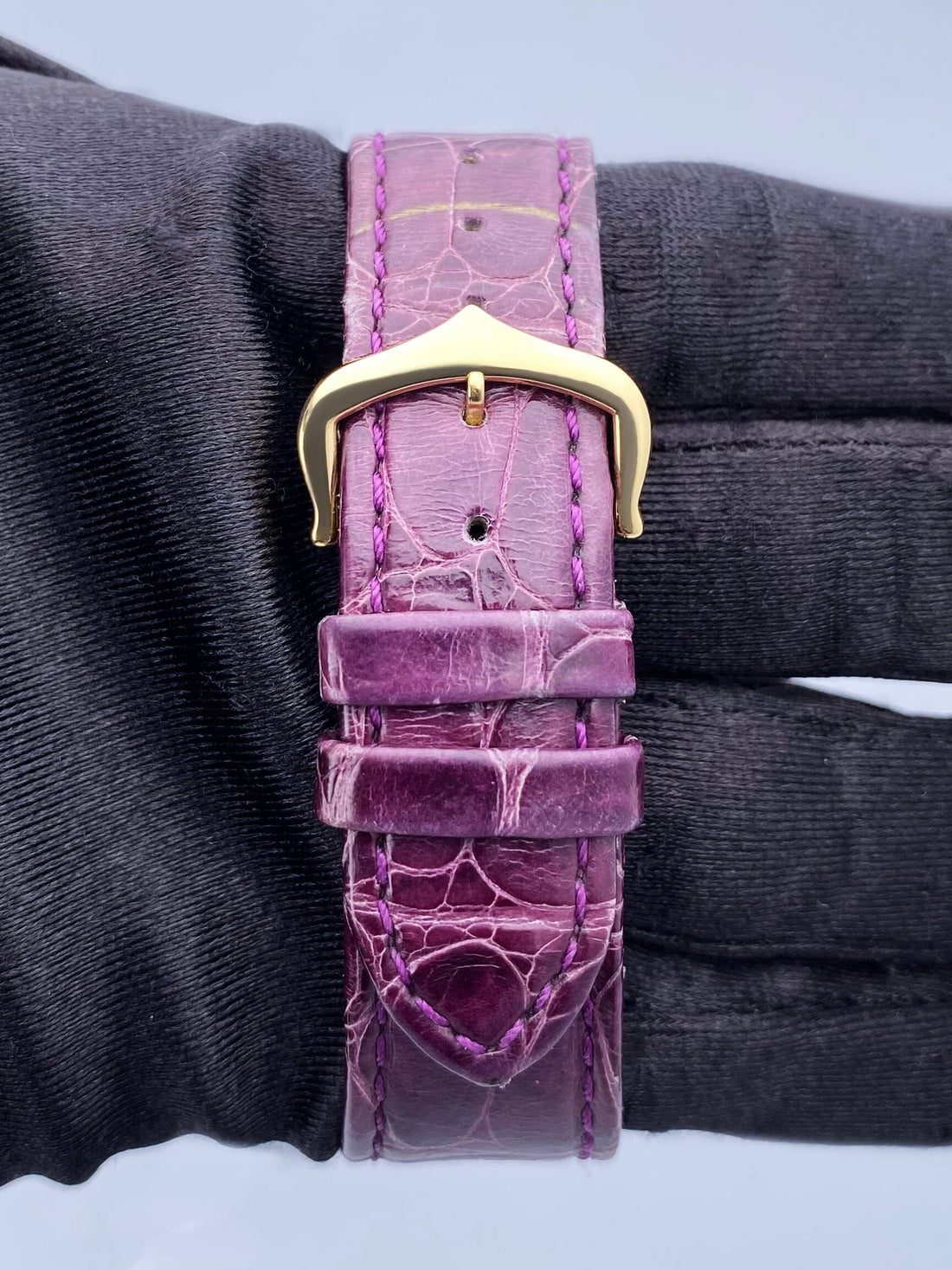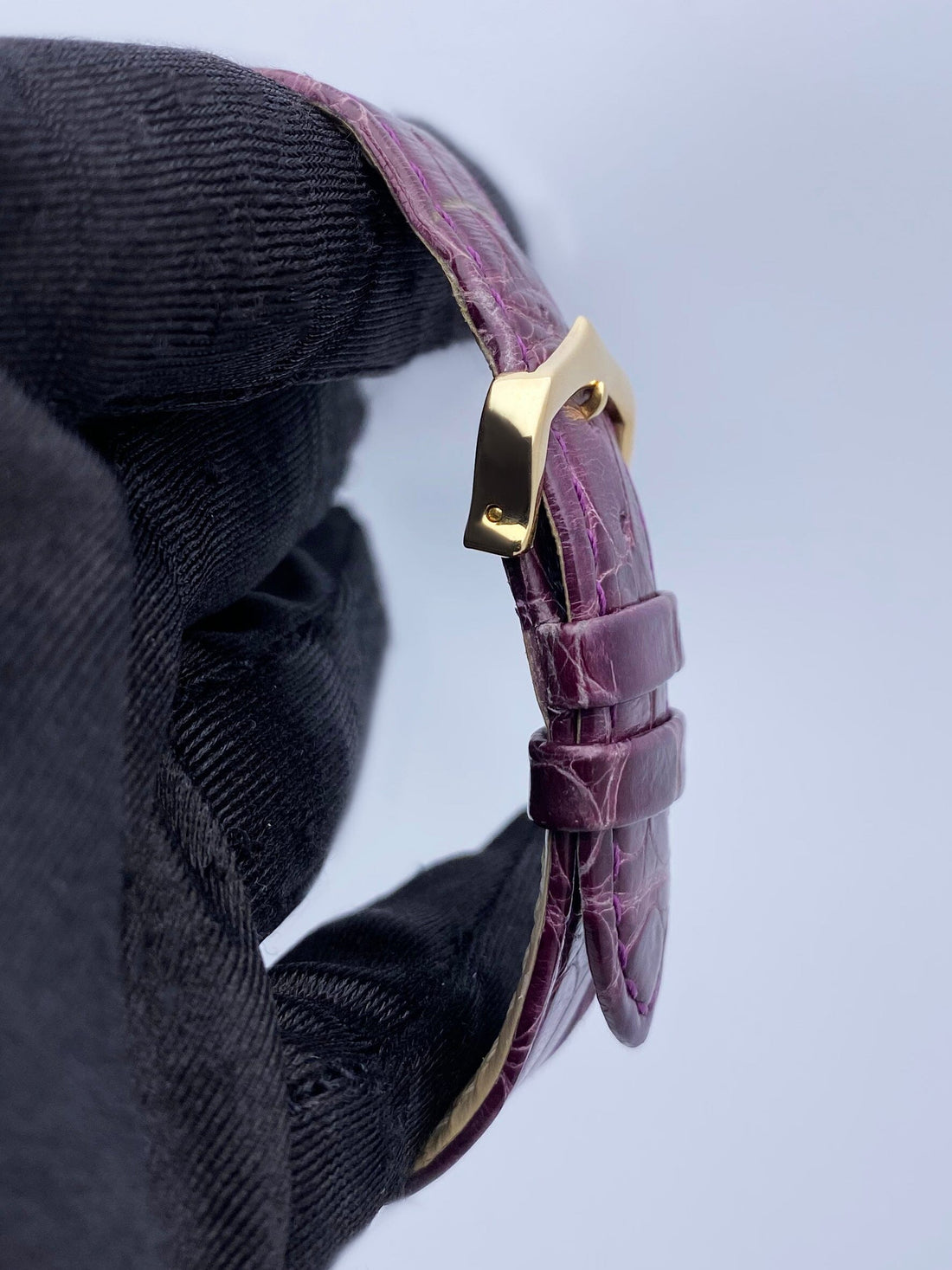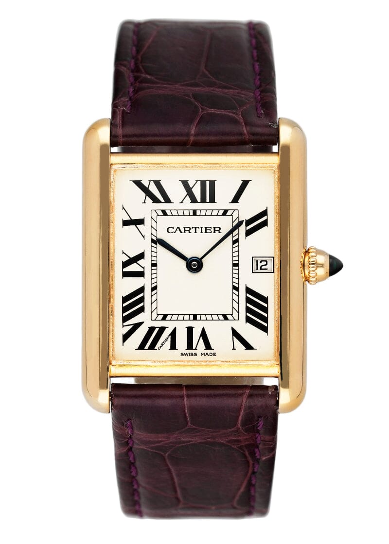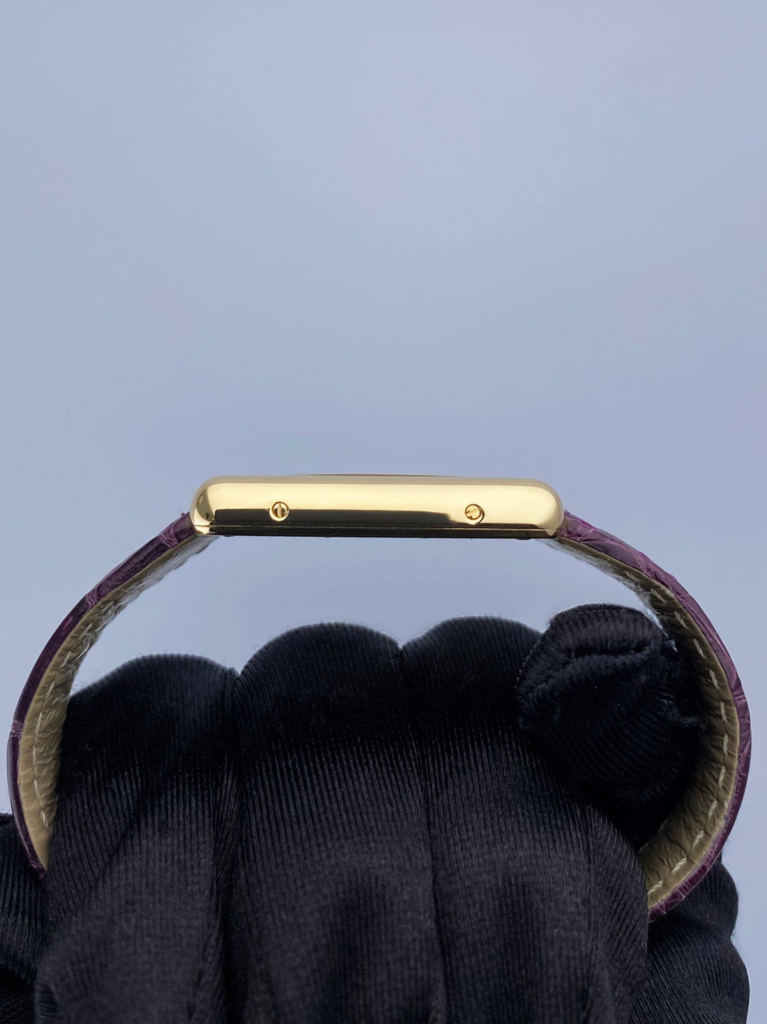 Cartier Tank Louis W1529756 / 2441 Mens Watch. 25.5mm 18K yellow gold case. Silver dial with blue hands and black Roman numeral hour markers. Minute markers on the inner dial. Purple leather strap with 18K yellow gold buckle. Will fit up to a 7-Inch wrist. Sapphire crystal. 18K yellow gold case back. Quartz: Battery powered movement.