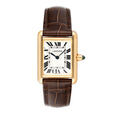 Cartier Tank Louis W1529856 / 2442 Ladies Watch. 22mm 18K yellow gold case. Off-White dial with blue hands and black Roman numeral hour markers. Minute markers on the inner dial. Brown leather strap with 18K yellow gold buckle. Will fit up to a 6.5-Inch wrist. Sapphire crystal. 18K yellow gold case back. Quartz: Battery powered movement. This watch comes with original Box and Papers.