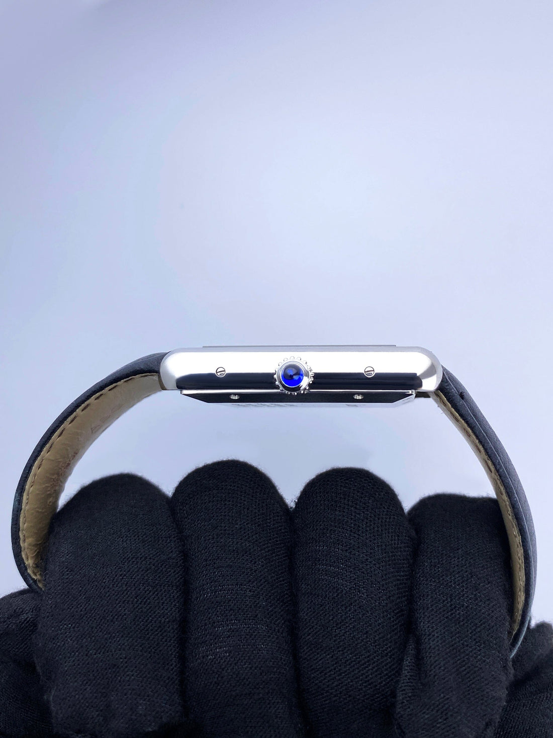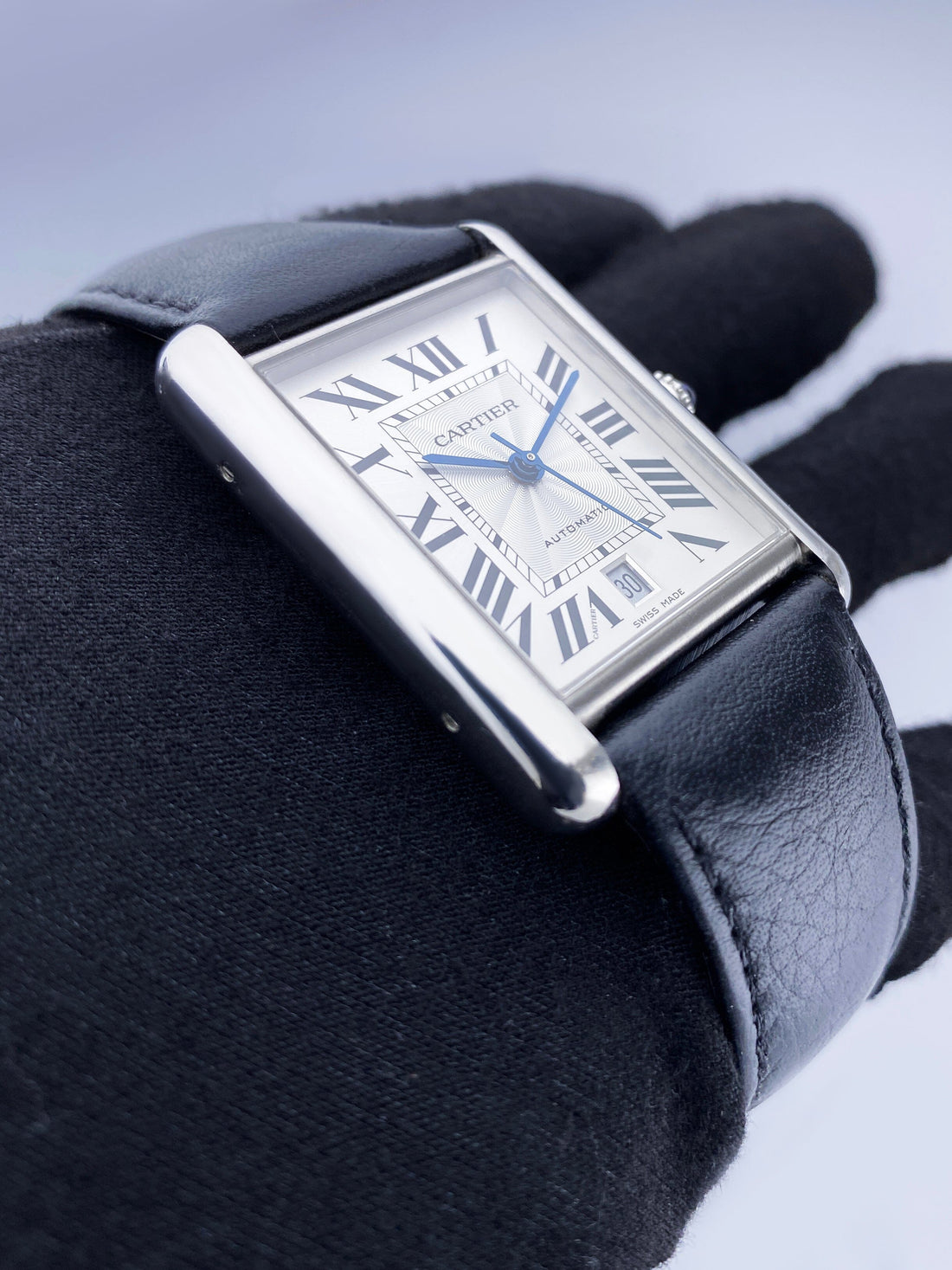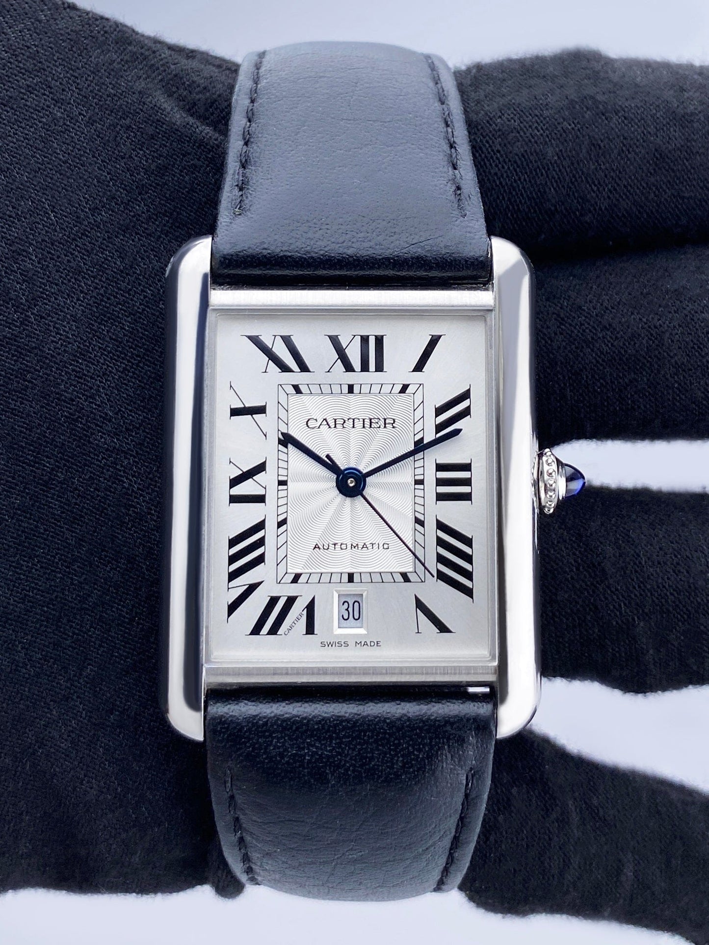 Cartier Tank Must WSTA0040 / 4324 Mens Watch. 31x41mm stainless steel case. Silver dial with blue steel hands and Roman numeral hour maker. Date is displayed at 6 o'clock postion. Black leather strap with stainless steel deployment clasp. Will fit up to a 7.5-inch wrist. Sapphire crystal. Stainless steel case back. Automatic self-winding movement. This watch comes with original Box and Papers.
