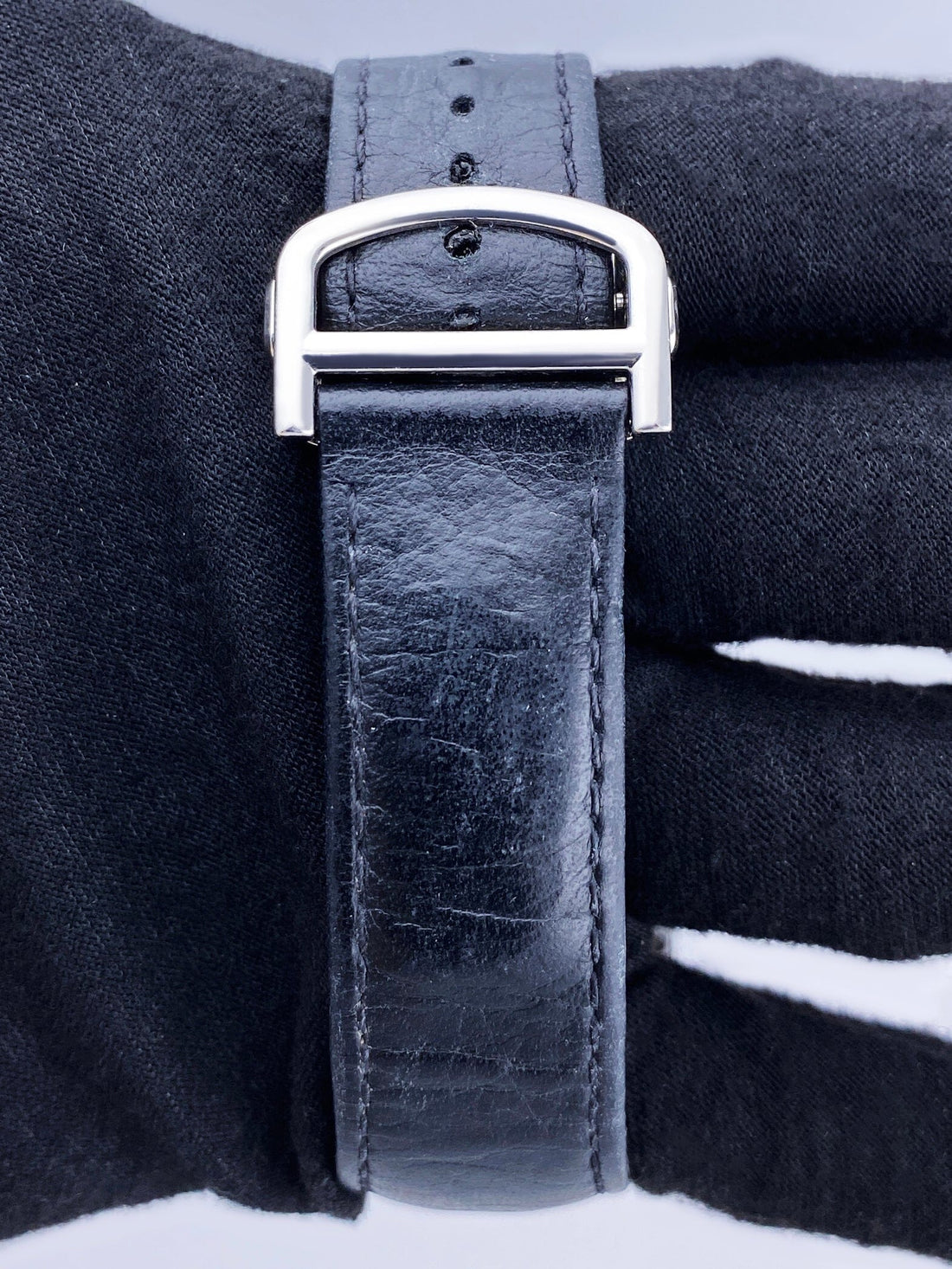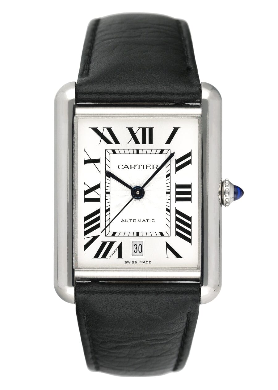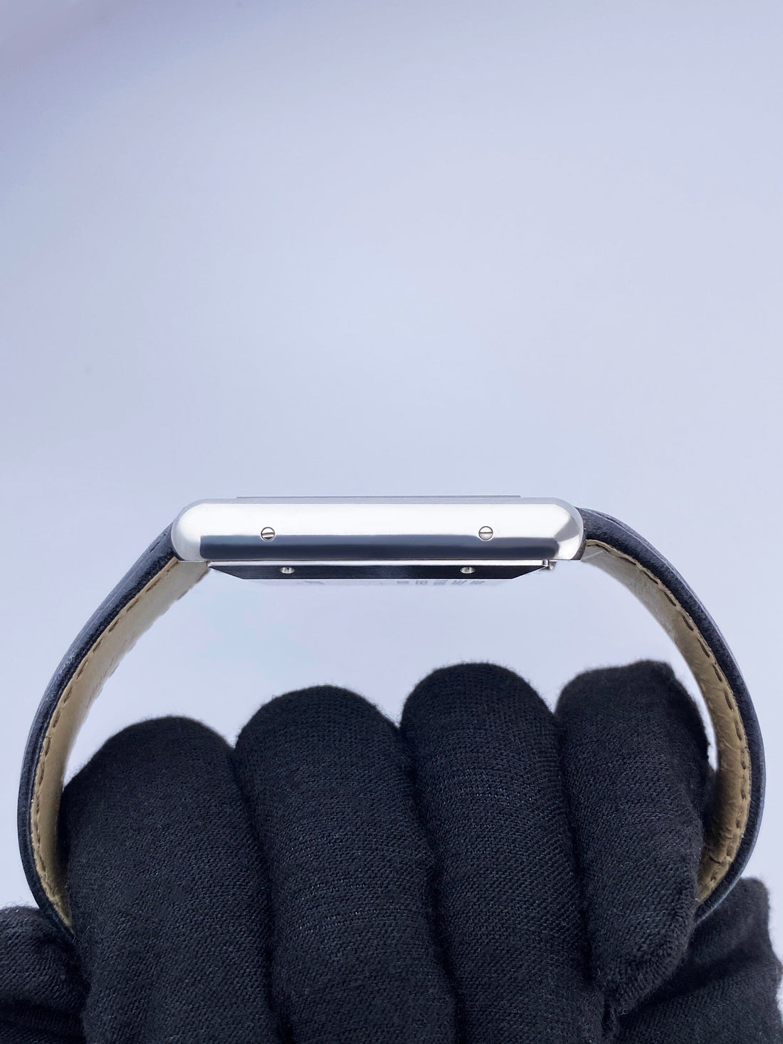 Cartier Tank Must WSTA0040 / 4324 Mens Watch. 31x41mm stainless steel case. Silver dial with blue steel hands and Roman numeral hour maker. Date is displayed at 6 o'clock postion. Black leather strap with stainless steel deployment clasp. Will fit up to a 7.5-inch wrist. Sapphire crystal. Stainless steel case back. Automatic self-winding movement. This watch comes with original Box and Papers.