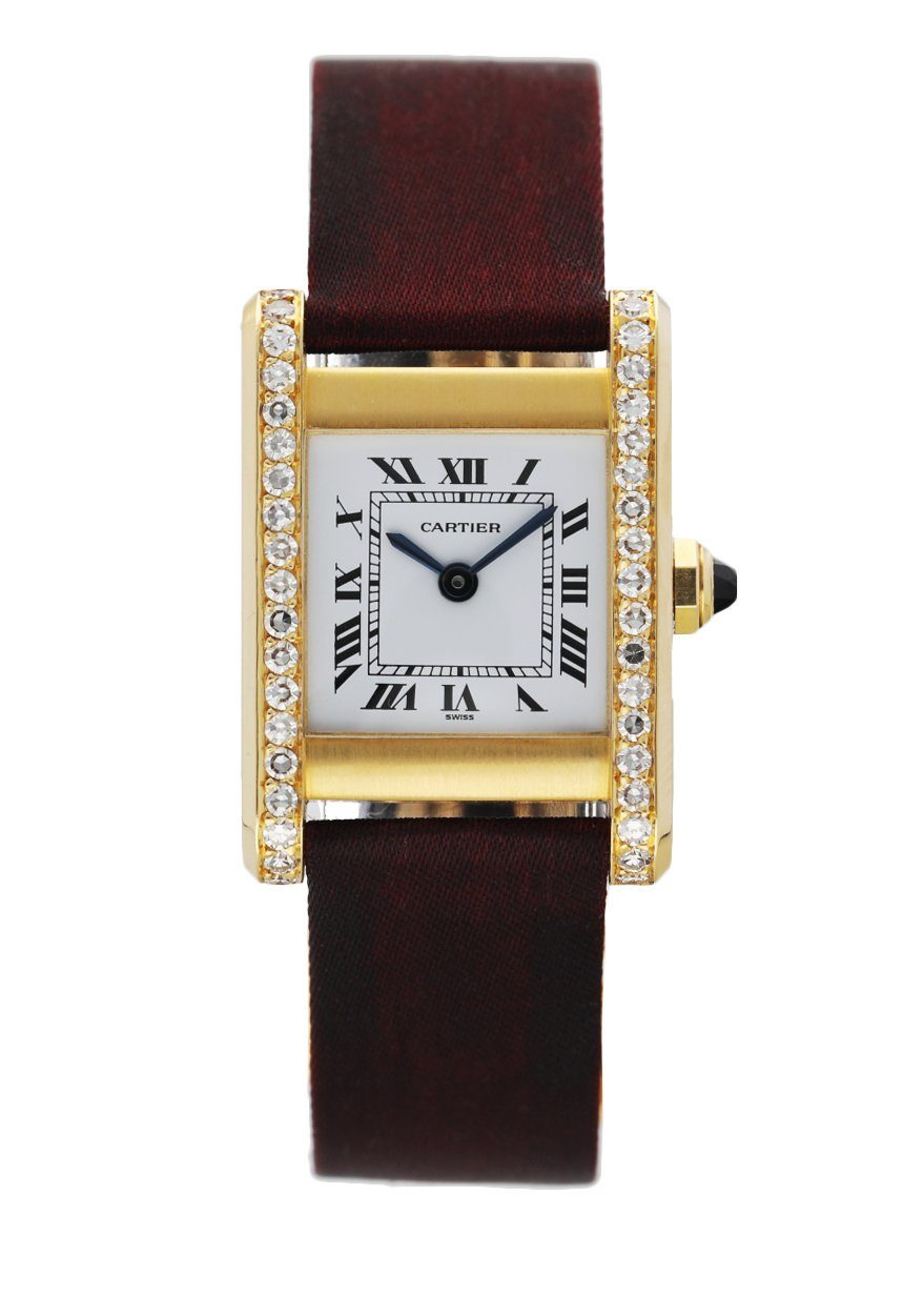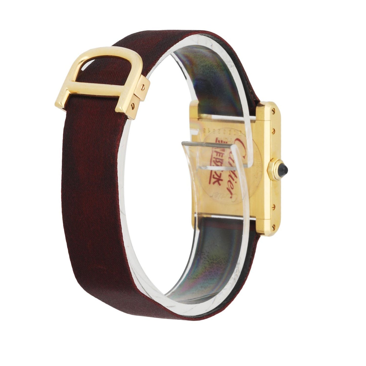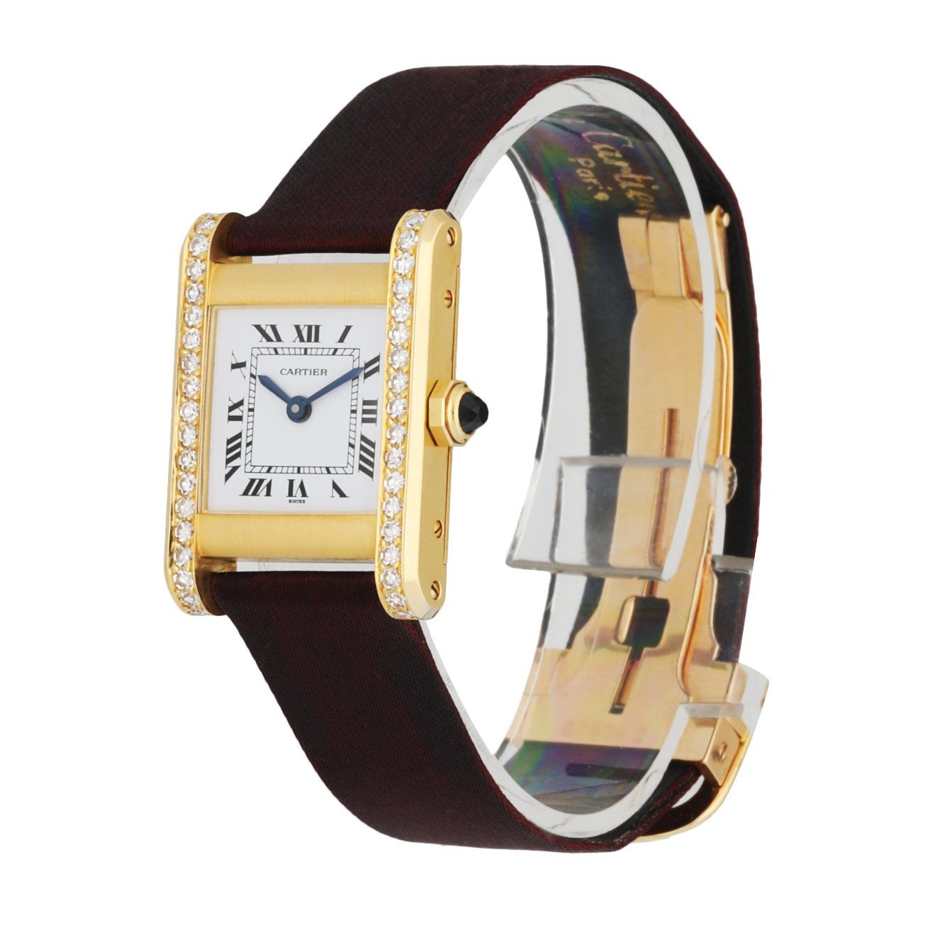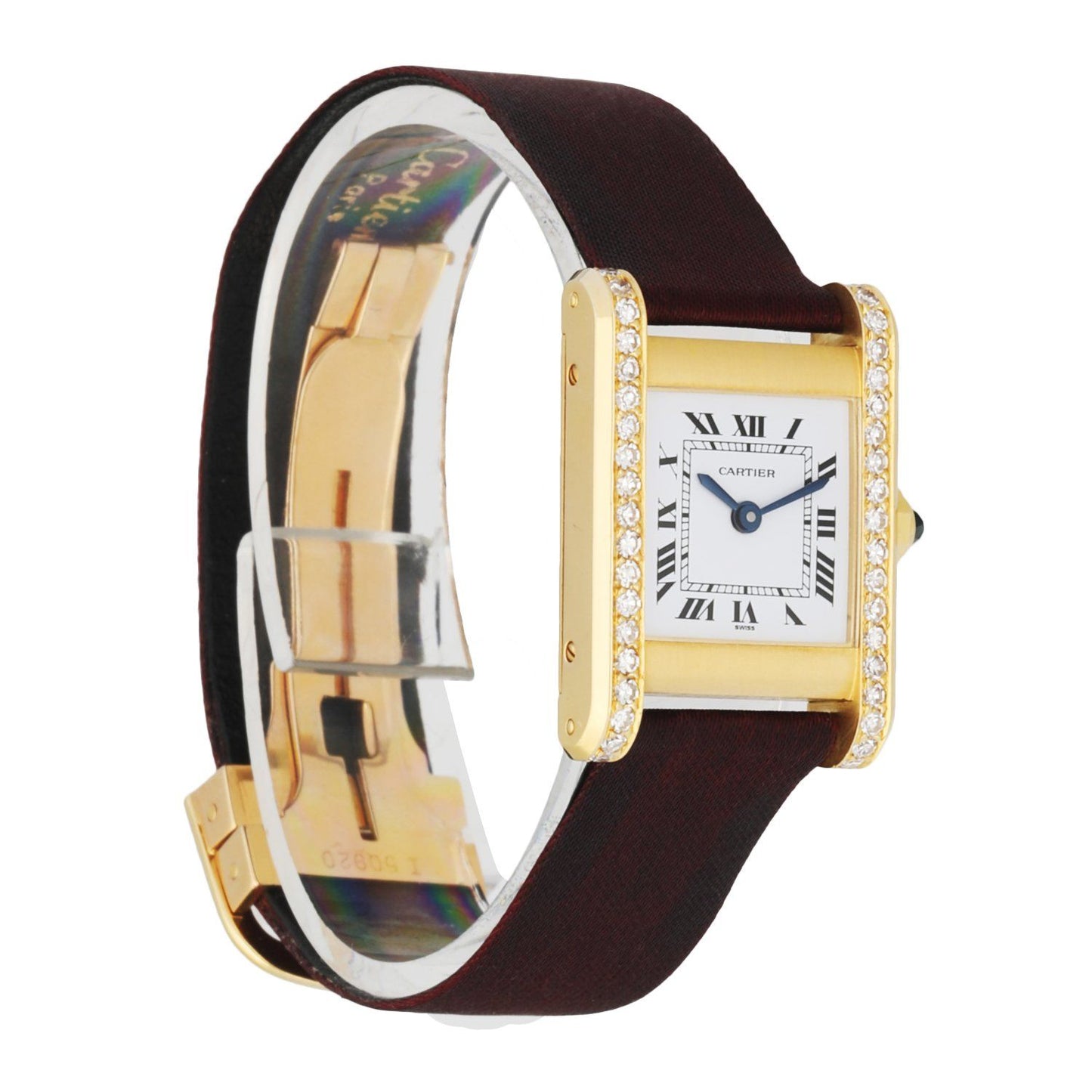 Cartier Tank Paris ladies watch. 20mm 18k Yellow gold case with factory diamonds set bezel. White dial with blue hands and Roman numeral hour marker. Burgundy leather strap with 18K yellow gold deployment Clasp. Will fit up to a 6-inch wrist. Sapphire Crystal. 18K yellow gold case back. Quartz: Battery Powered movement.