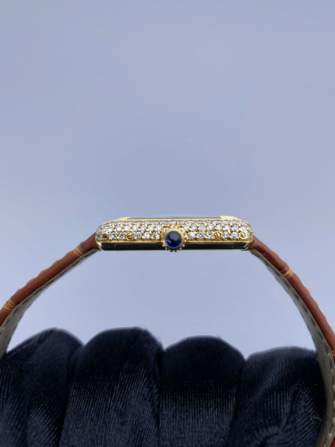Cartier Tank Paris Ladies Watch. 21mm 18K yellow gold case with factory diamond. White dial with blue hands and Roman numeral hour marker. Minute marker on the inner dial. Brown leather strap with 18K yellow gold deployment clasp. Will fit up to a 6-inch wrist. Sapphire crystal. 18K yellow gold case back. Quartz: Battery power movement.