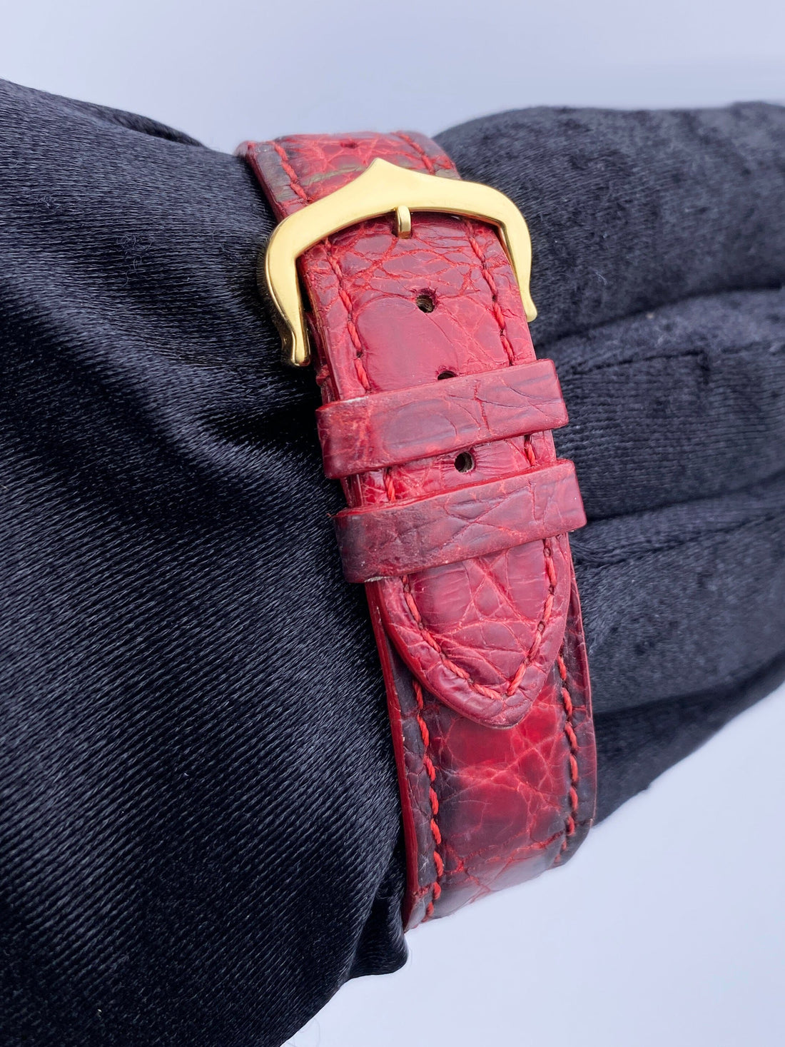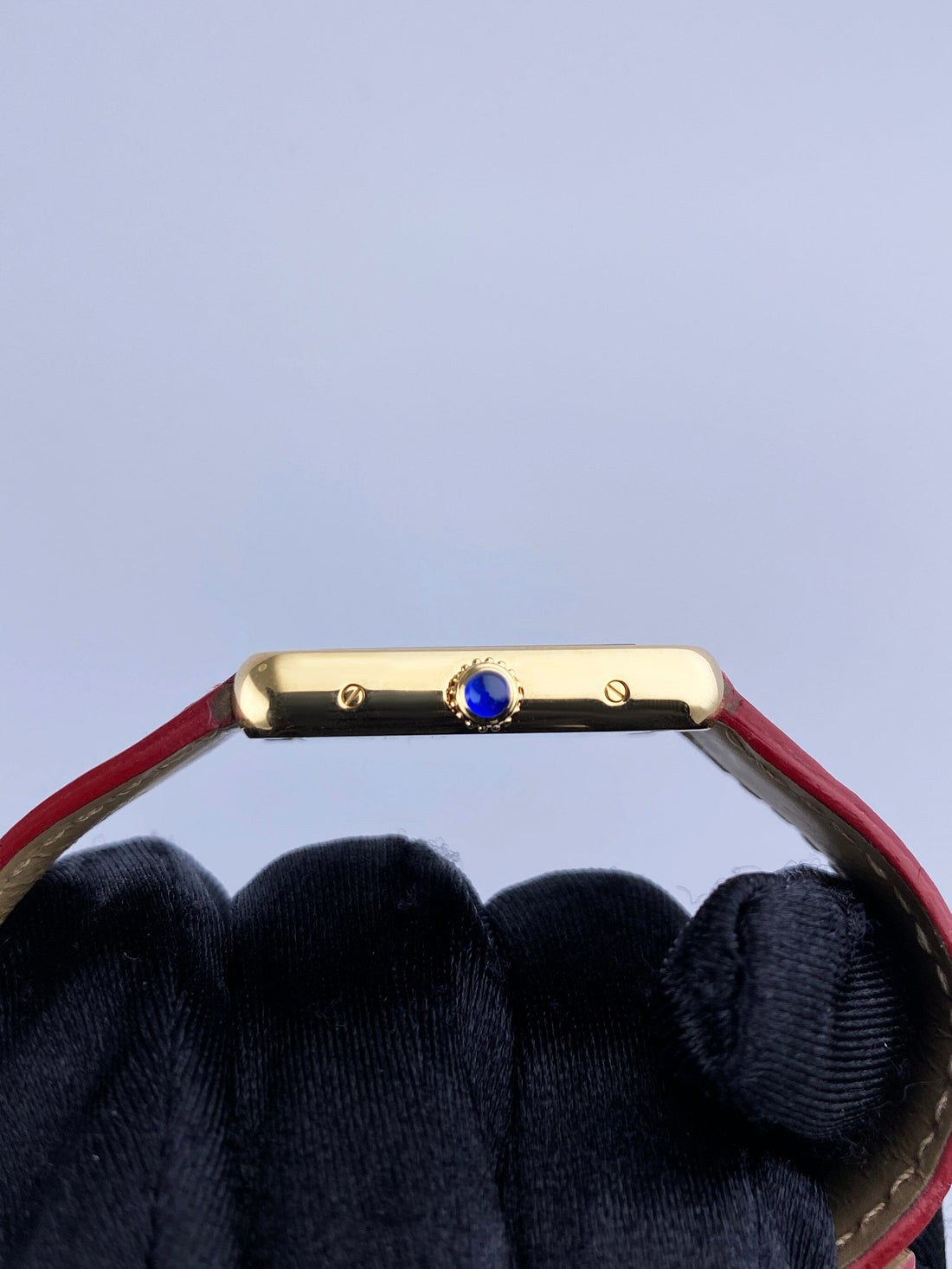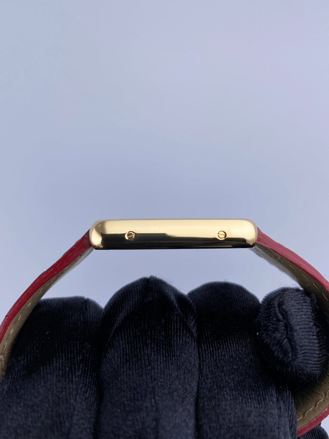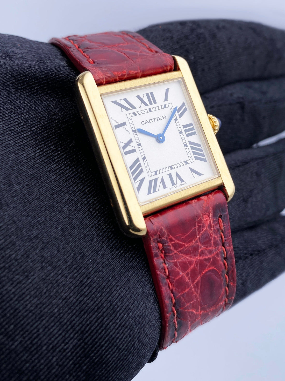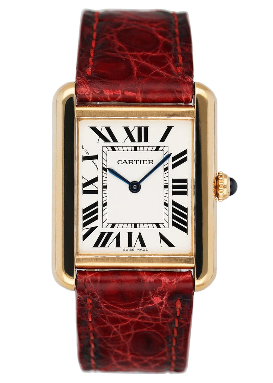 Cartier Tank Solo W1018755 / 2743 Ladies Watch. 24mm 18K yellow gold case. Sliver dial with blue steel hands and Roman numeral hour markers. Minute markers on the inner dial. Burgundy leather strap with 18K yellow gold buckle. Will fit up to a 6-inch wrist. Sapphire crystal. Stainless steel case back. Quartz: Battery powered movement.