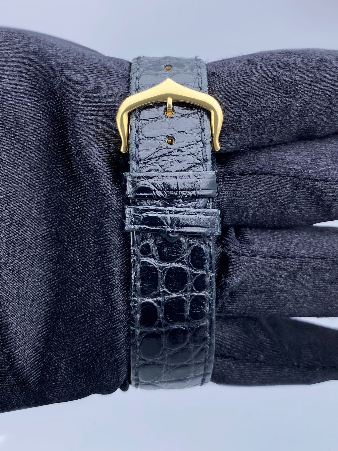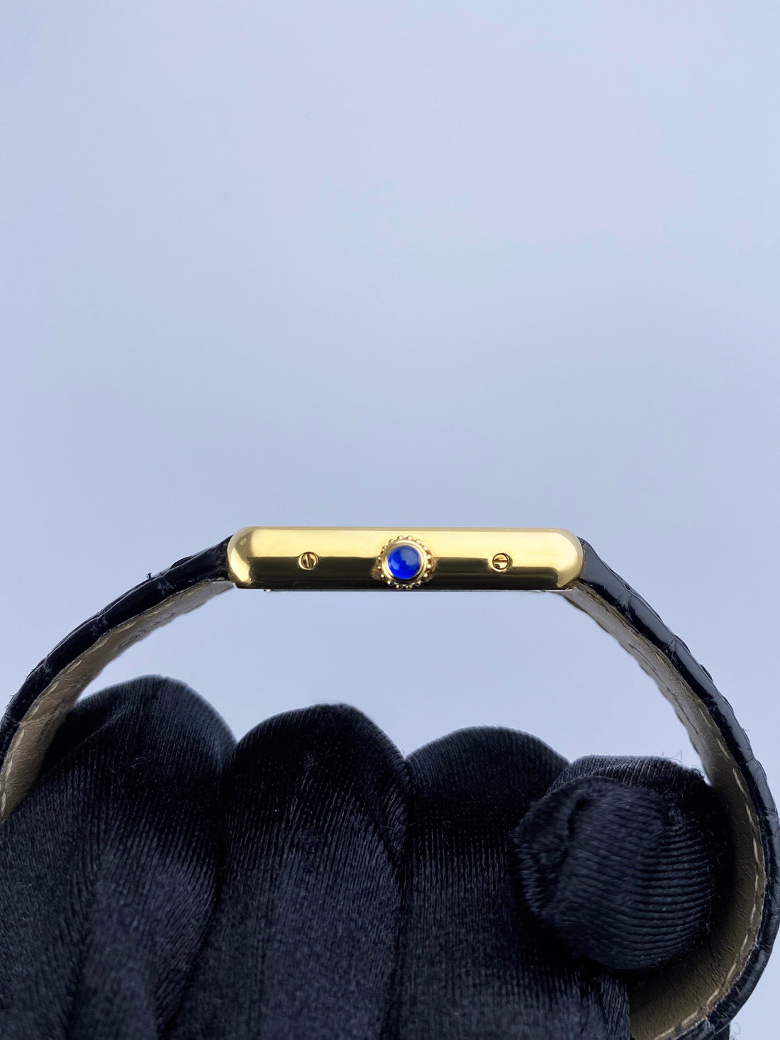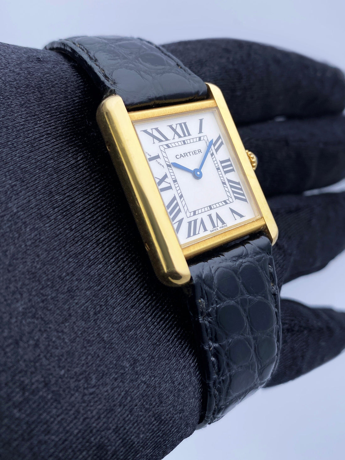 Cartier Tank Solo W1018755 / 2743 Ladies Watch. 24mm 18K yellow gold case. Sliver dial with blue steel hands and Roman numeral hour markers. Minute markers on the inner dial. Black leather strap with 18K yellow gold buckle. Will fit up to a 6.5-inch wrist. Sapphire crystal. Stainless steel case back. Quartz: Battery powered movement.