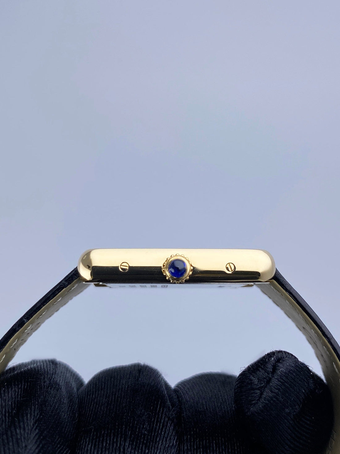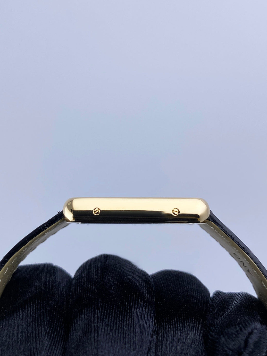 Cartier Tank Solo W5200002 / 3168 Ladies Watch. 24mm 18K yellow gold case. Sliver dial with blue steel hands and Roman numeral hour markers. Minute markers on the inner dial. Black leather strap with 18K yellow gold buckle. Will fit up to a 6.5-inch wrist. Sapphire crystal. Stainless steel case back. Quartz: Battery powered movement.
