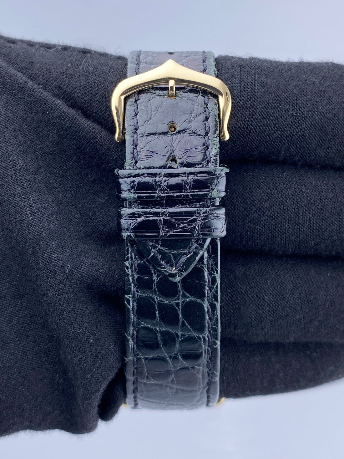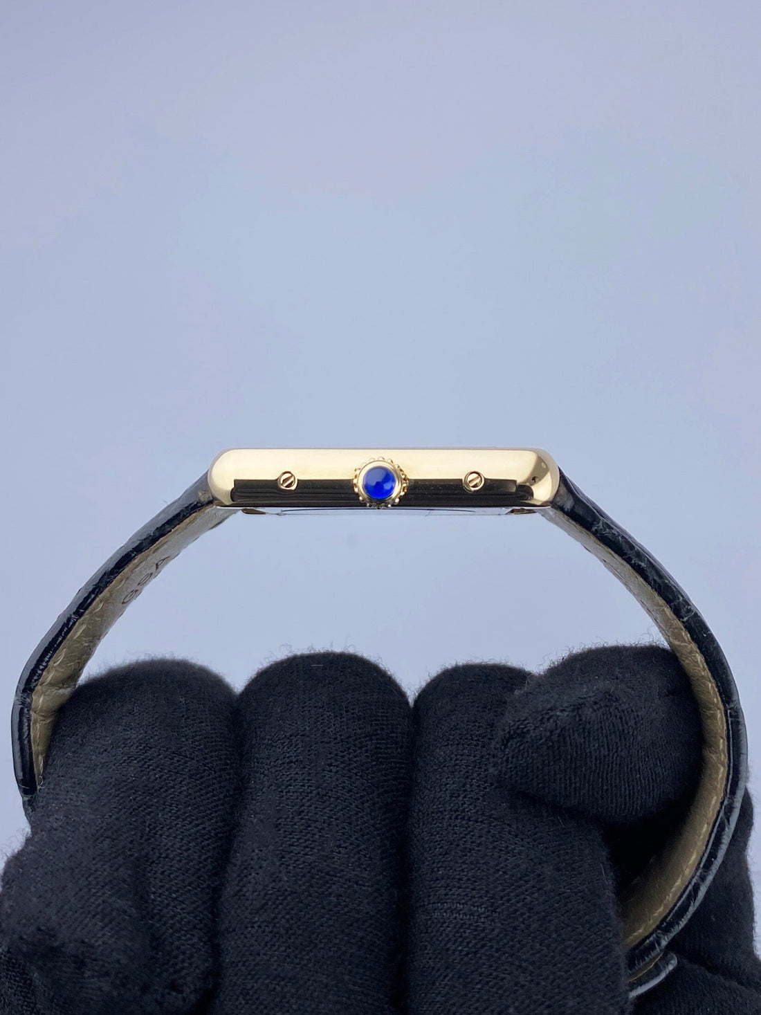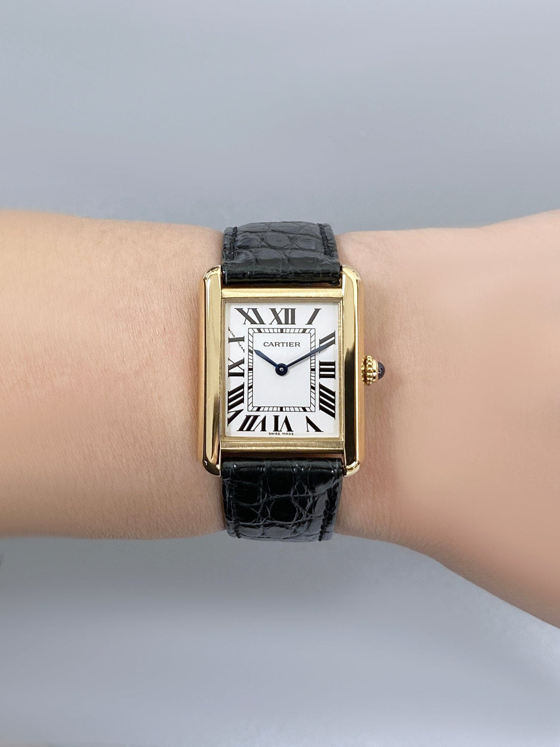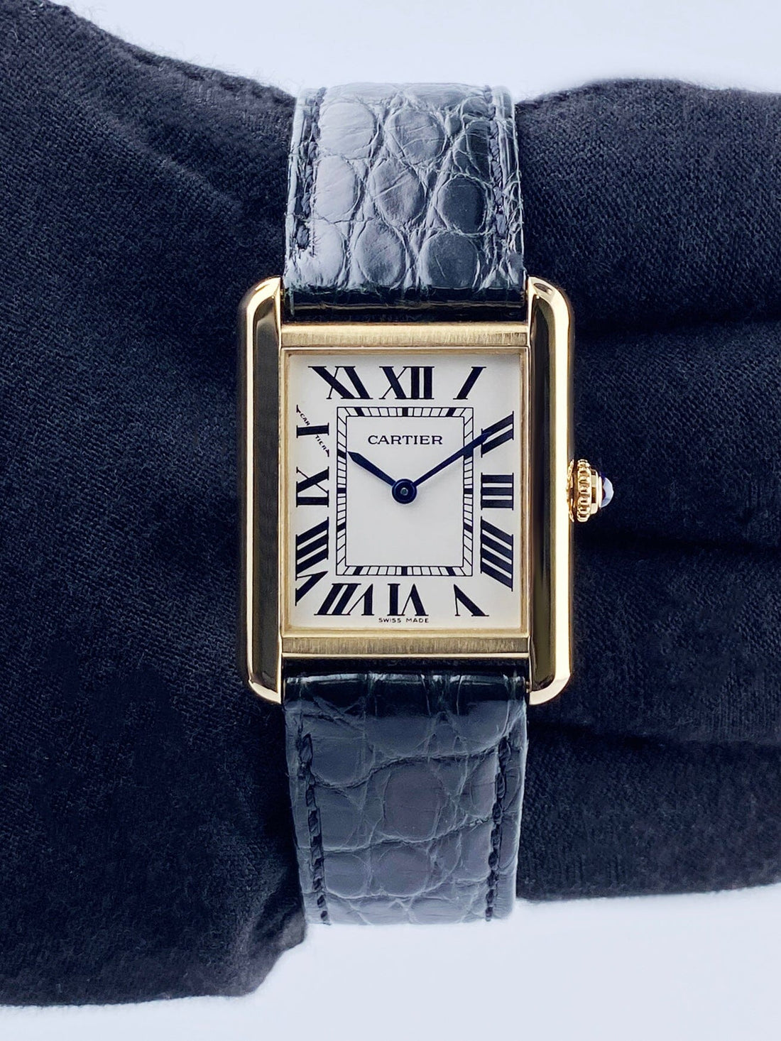 Cartier Tank Solo W5200002 / 3168 Ladies Watch. 24mm 18K yellow gold case. Sliver dial with blue steel hands and Roman numeral hour markers. Minute markers on the inner dial. Black leather strap with 18K yellow gold buckle. Will fit up to a 6.75-inch wrist. Sapphire crystal. Stainless steel case back. Quartz: Battery powered movement.