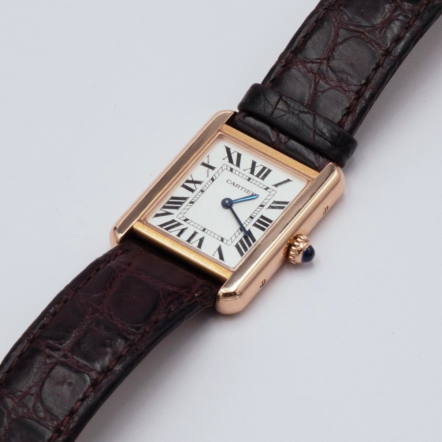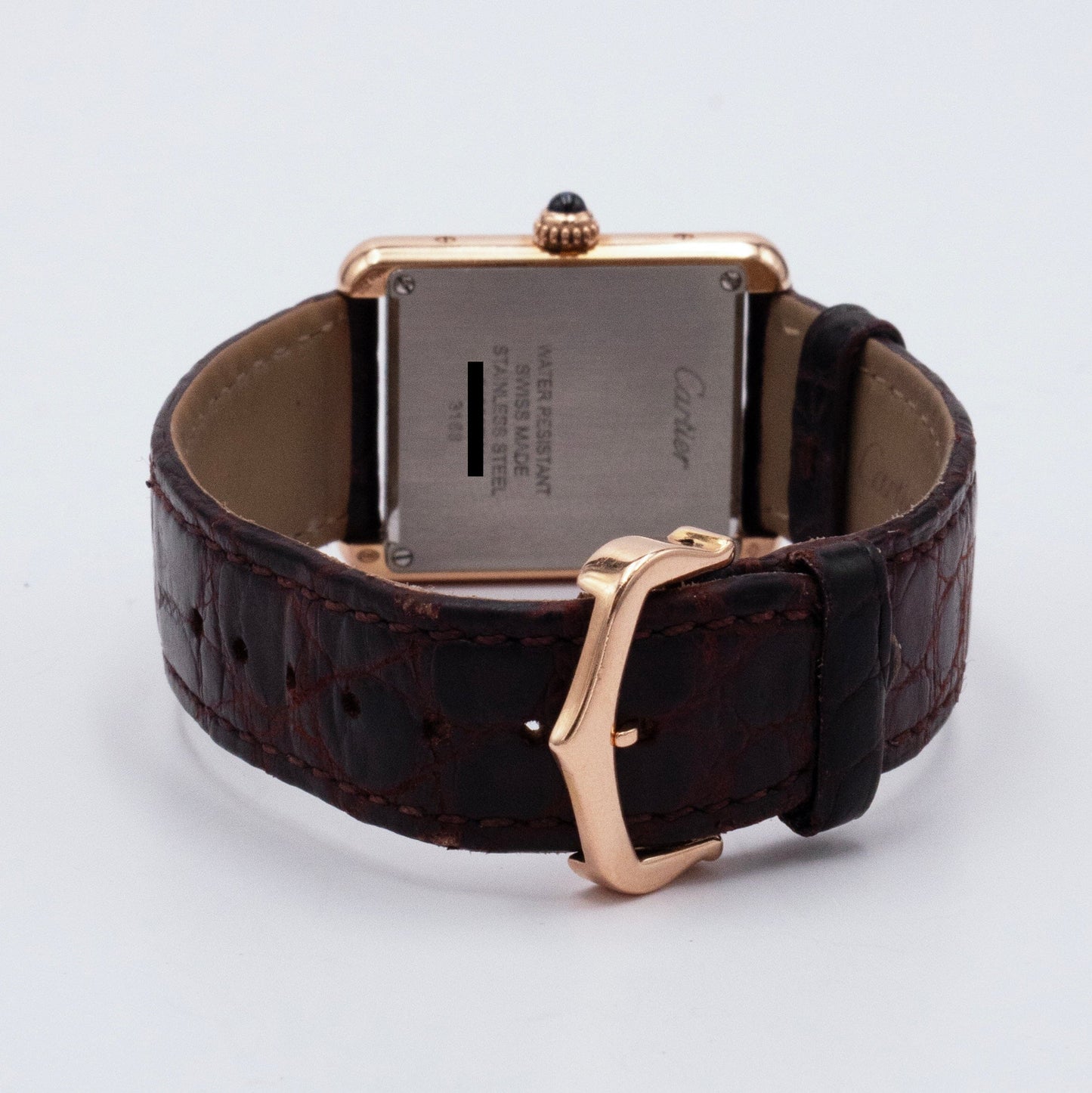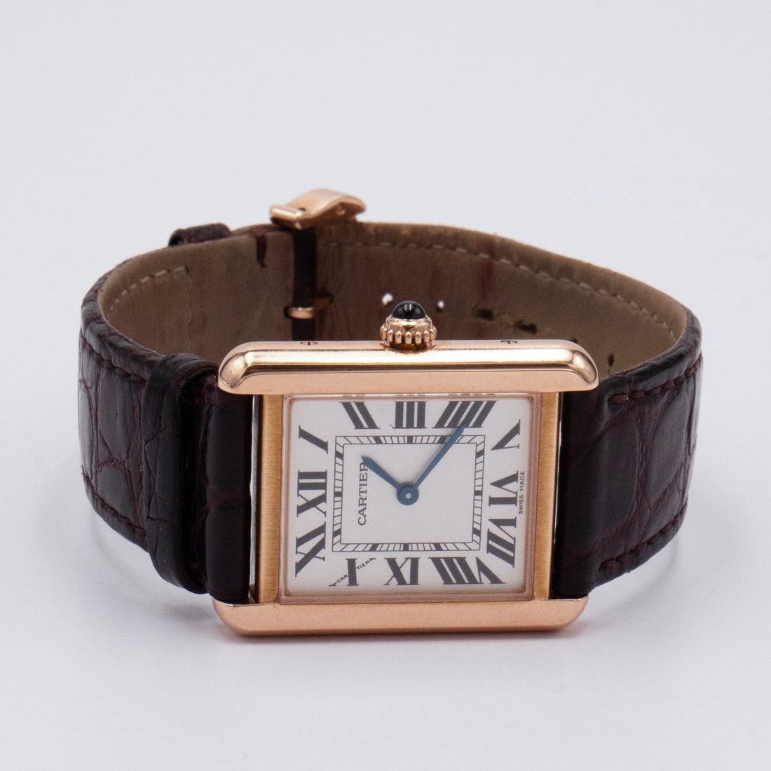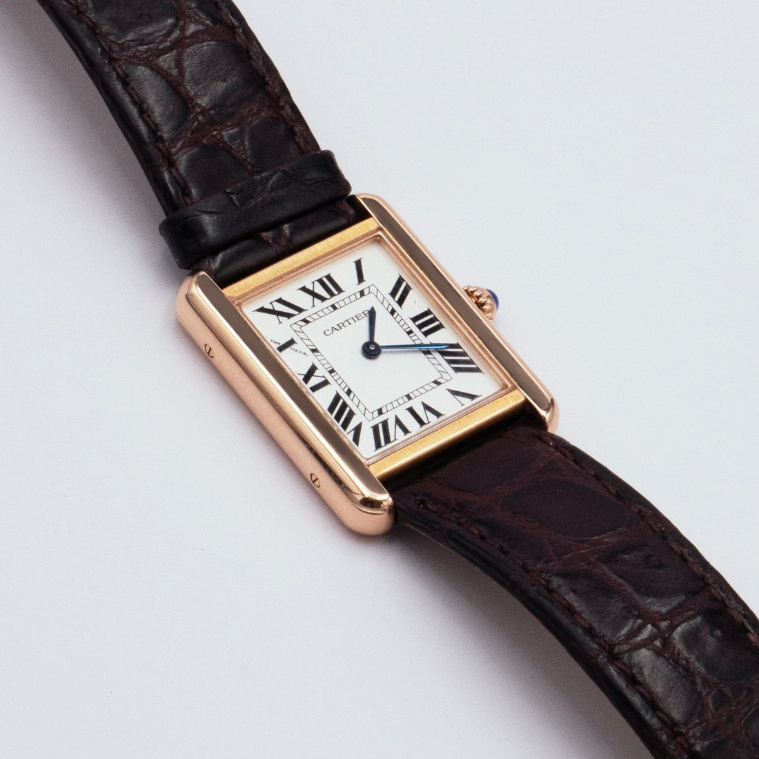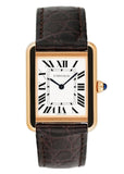Cartier Tank Solo W5200024 / 3168 Ladies Watch. 24mm 18K rose gold case. Sliver dial with blue steel hands and Roman numeral hour markers. Minute markers on the inner dial. Brown leather strap with 18K rose gold buckle. Will fit up to a 7-inch wrist. Sapphire crystal. Stainless steel case back. Quartz: Battery powered movement.