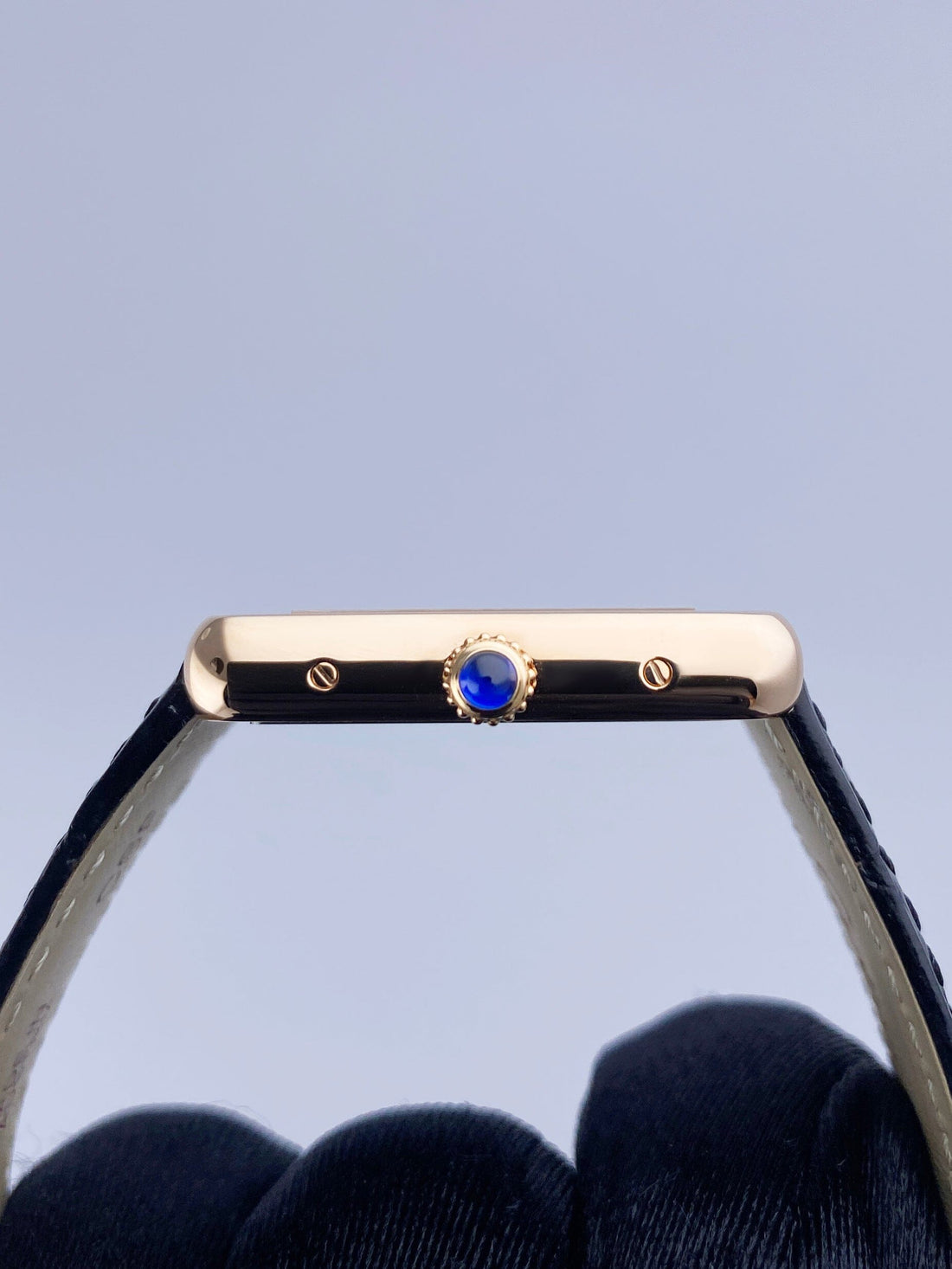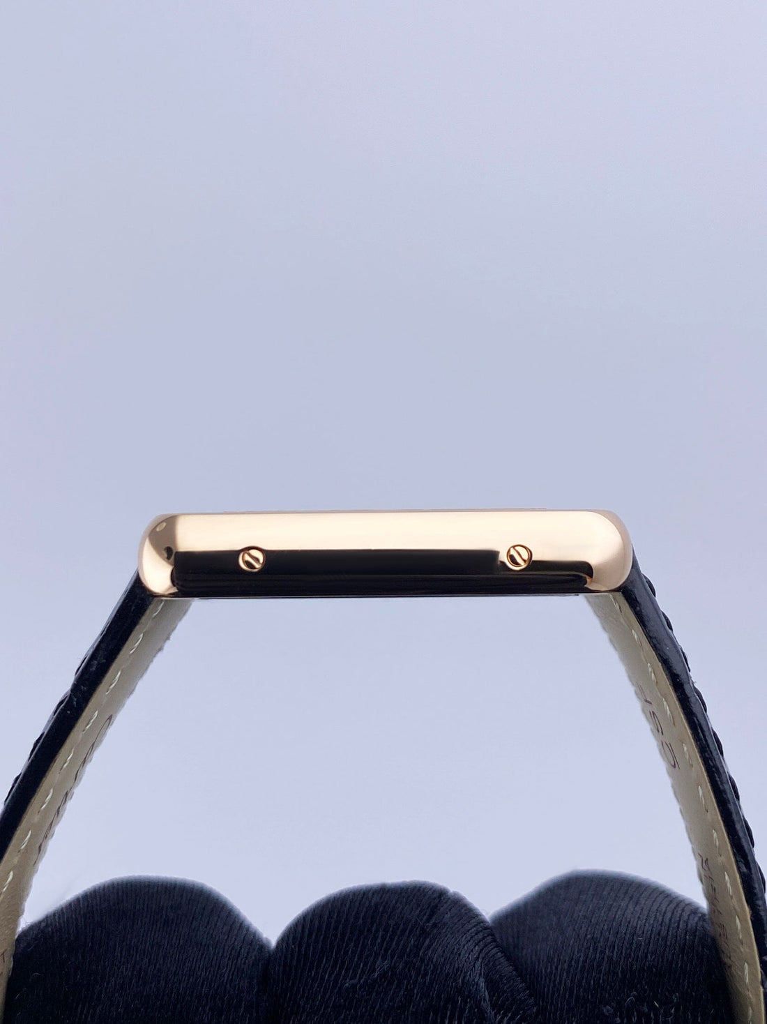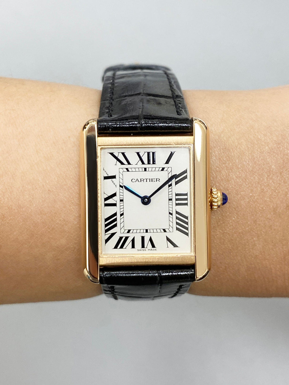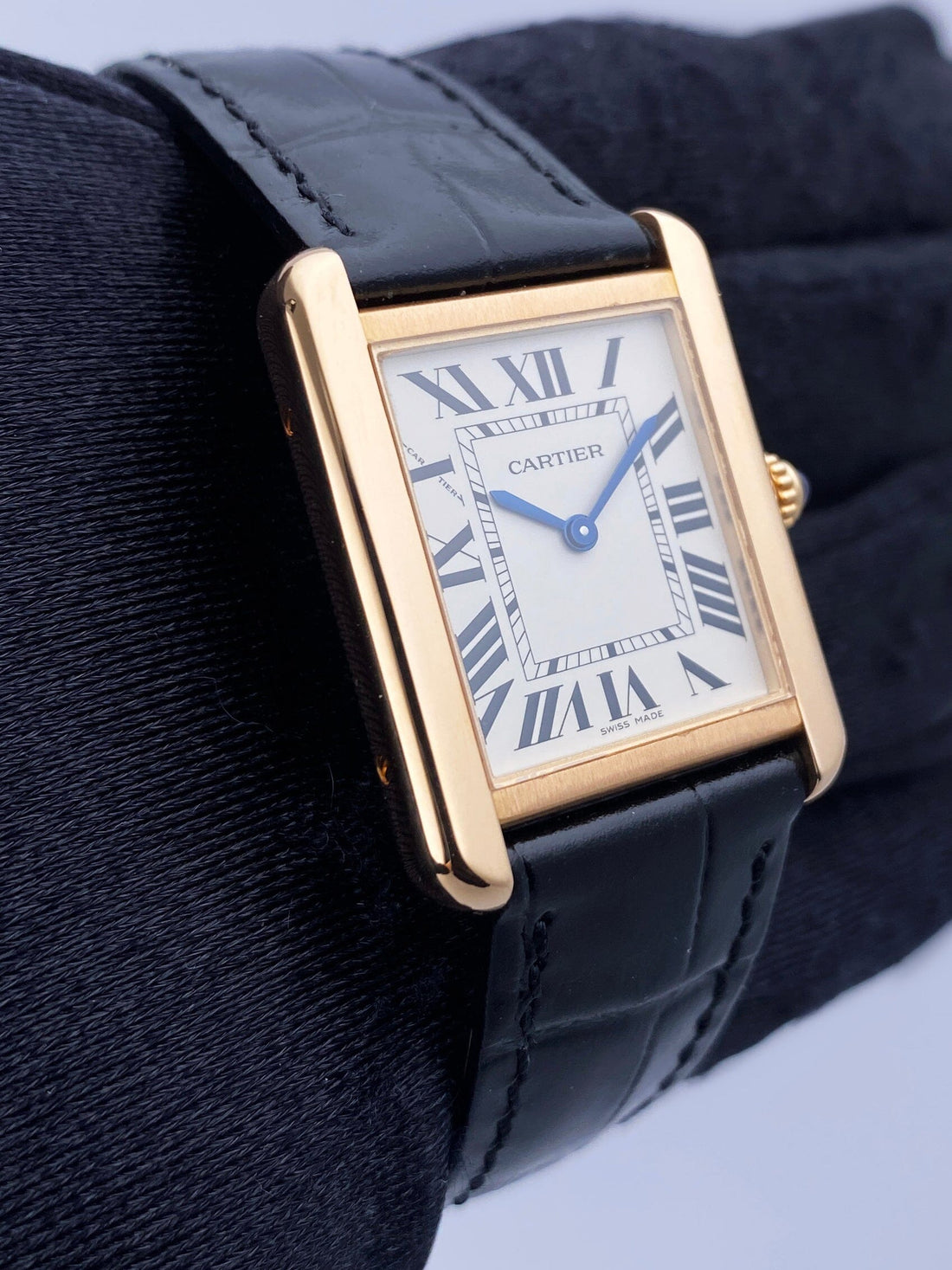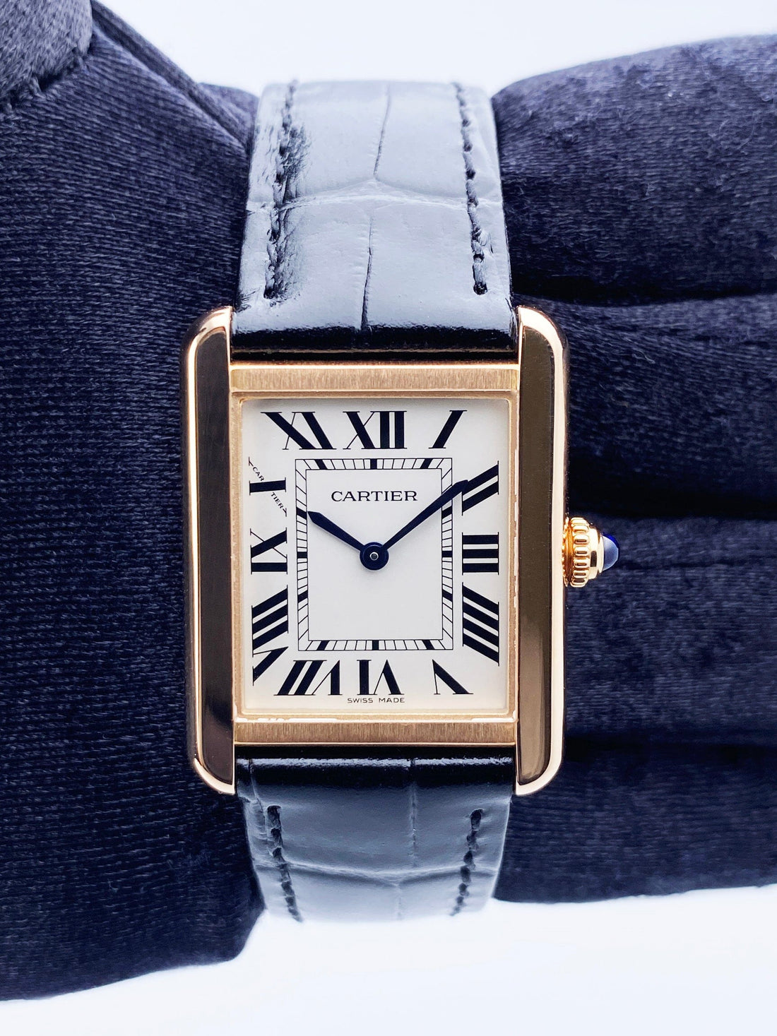 Cartier Tank Solo W5200024 Watch. 24mm 18K rose gold case. Sliver dial with blue steel hands and Roman numeral hour markers. Minute markers on the inner dial. Black leather strap with 18K rose gold buckle. Will fit up to a 7-inch wrist. Sapphire crystal. Stainless steel case back. Quartz: Battery powered movement. This watch comes with original Box and Papers.