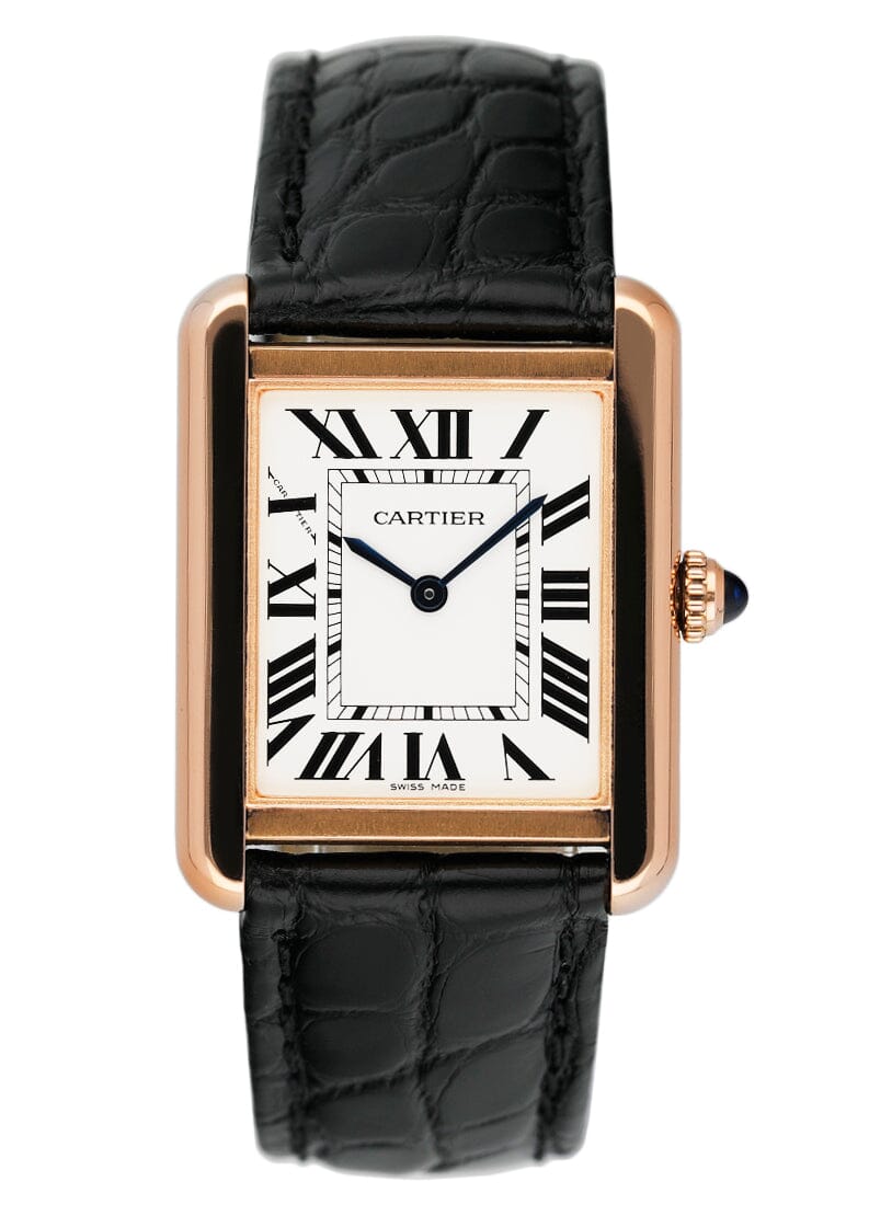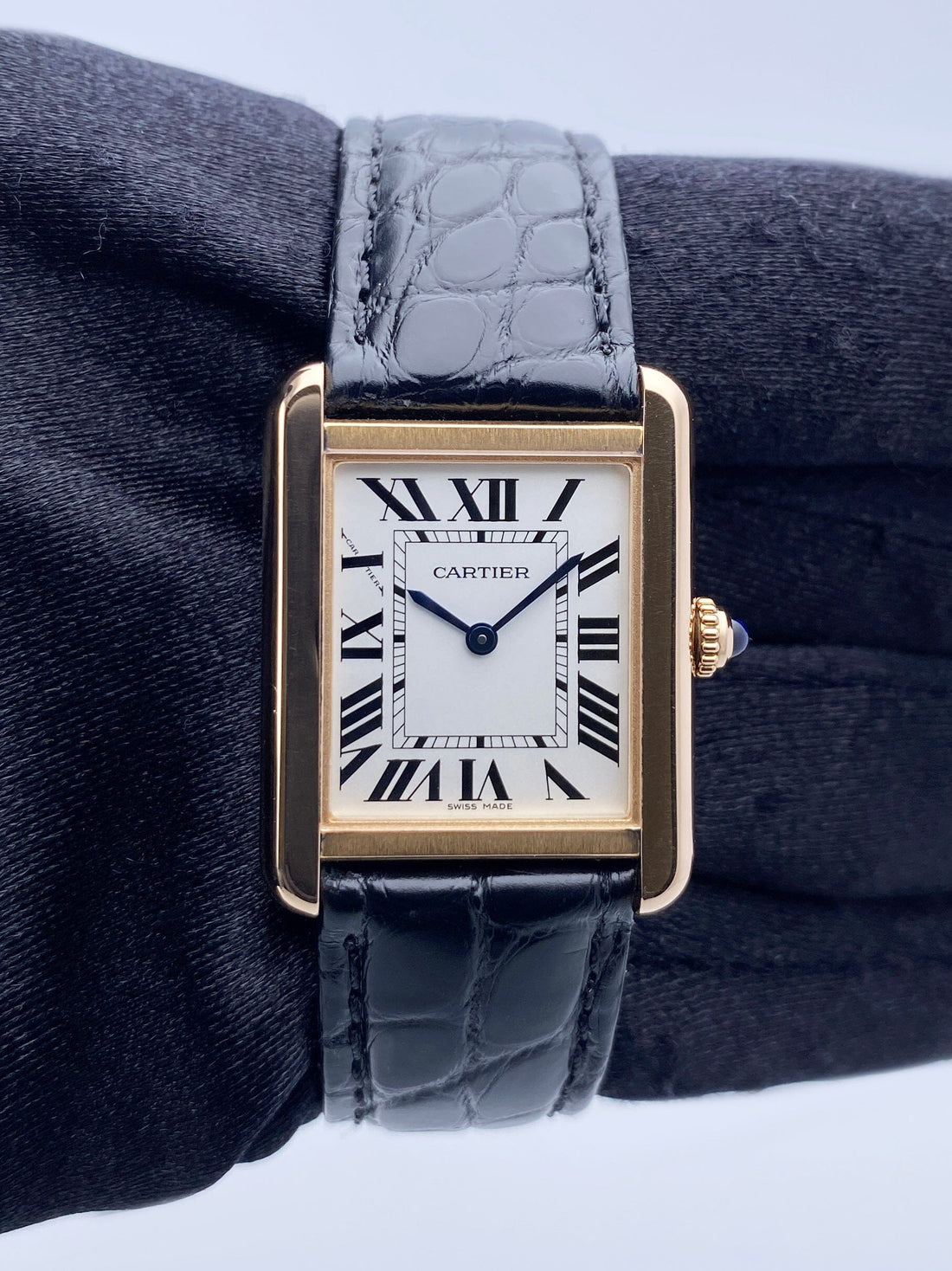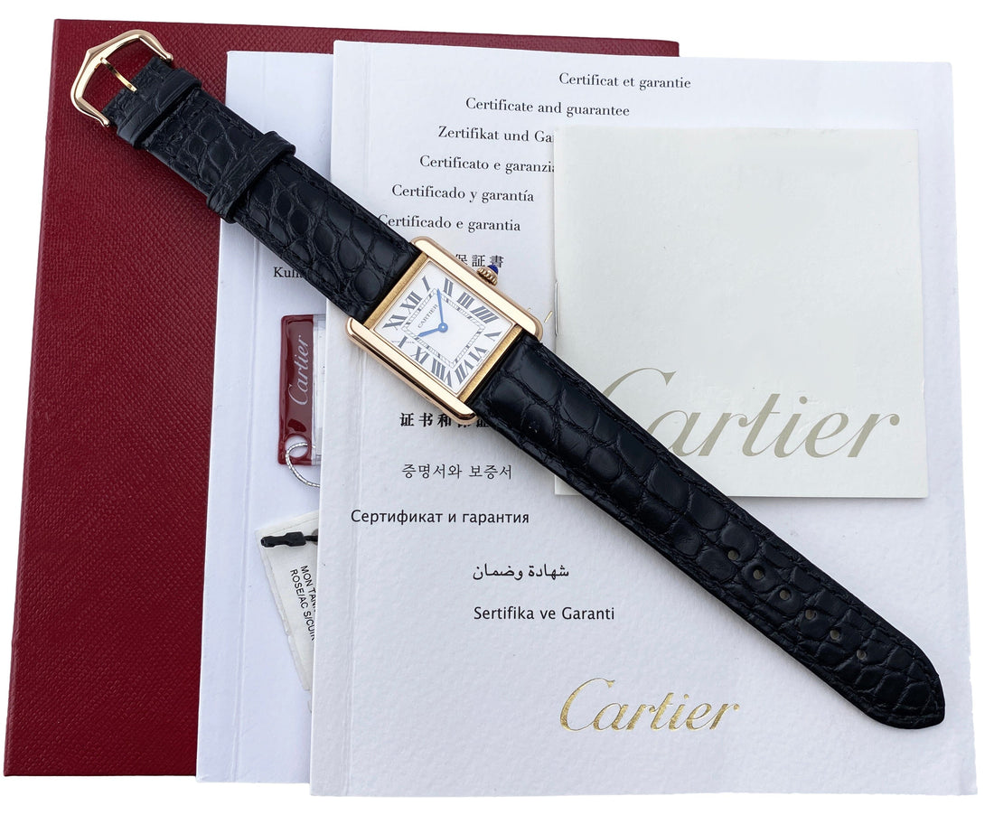 Cartier Tank Solo W5200024 / 3168 Watch. 24mm 18K rose gold case. Sliver dial with blue steel hands and Roman numeral hour markers. Minute markers on the inner dial. Black leather strap with 18K rose gold buckle. Will fit up to a 7-inch wrist. Sapphire crystal. Stainless steel case back. Quartz: Battery powered movement. This watch comes with original Box and Papers.