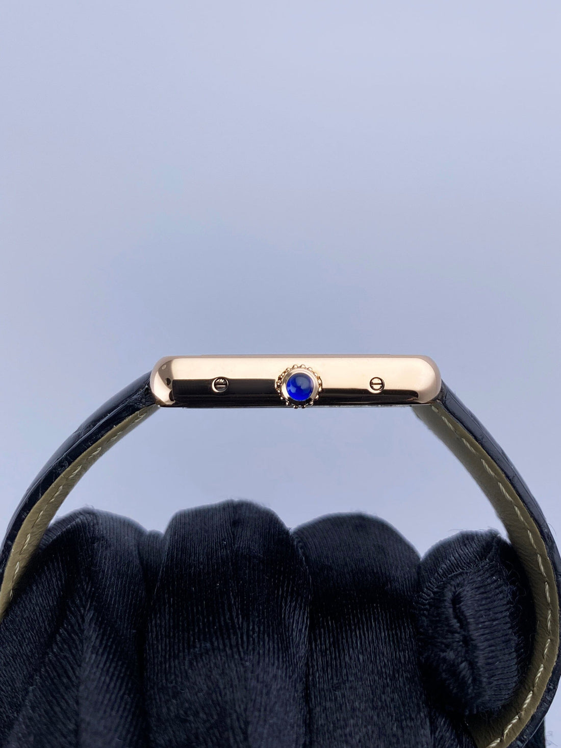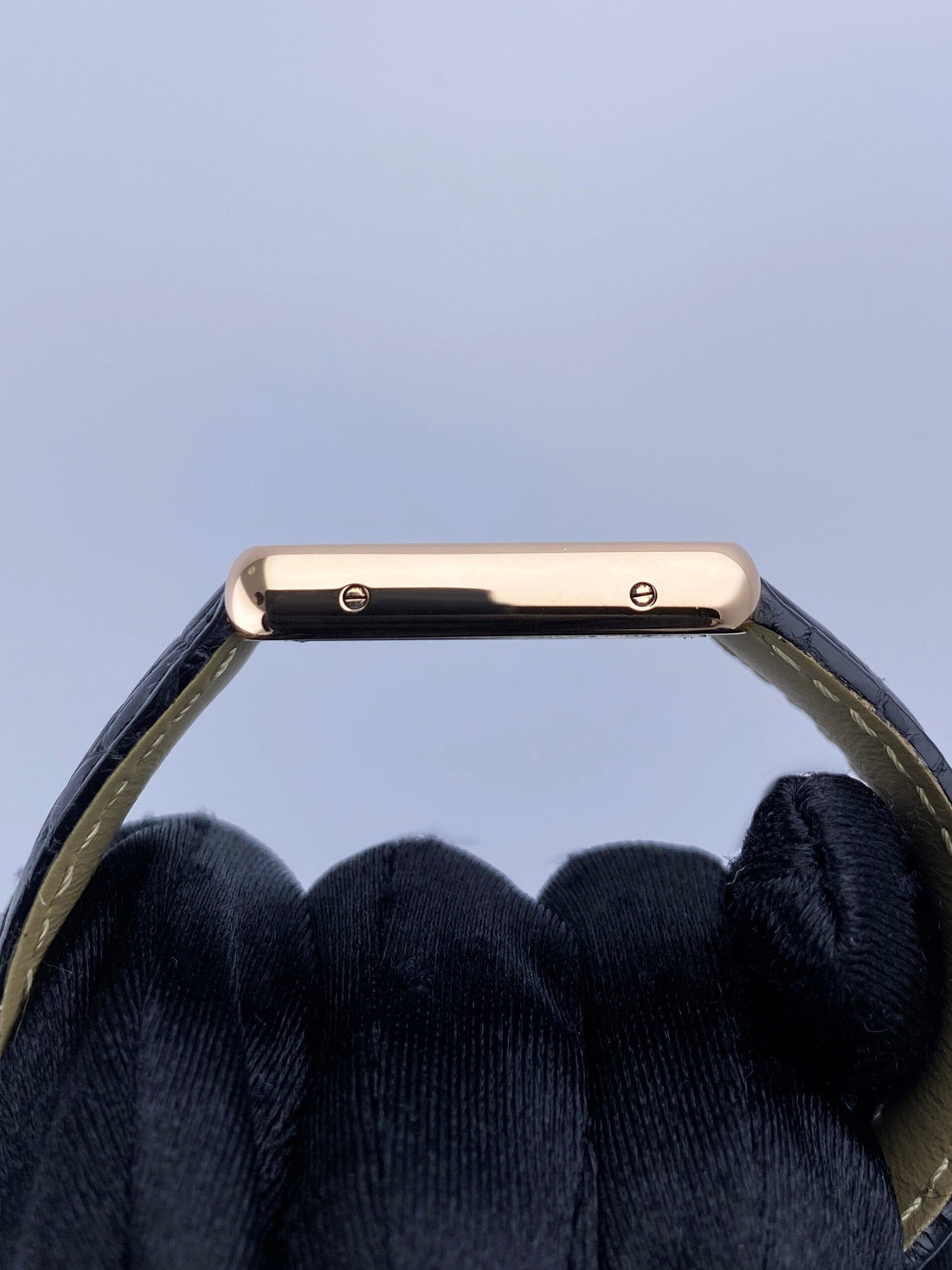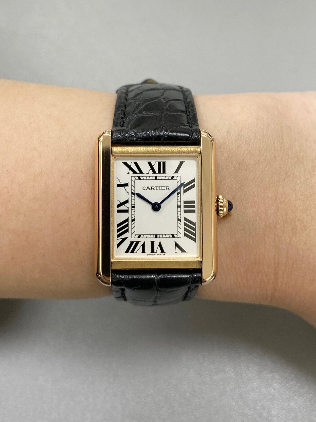 Cartier Tank Solo W5200024 / 3168 Watch. 24mm 18K rose gold case. Sliver dial with blue steel hands and Roman numeral hour markers. Minute markers on the inner dial. Black leather strap with 18K rose gold buckle. Will fit up to a 7-inch wrist. Sapphire crystal. Stainless steel case back. Quartz: Battery powered movement. This watch comes with original Box and Papers.