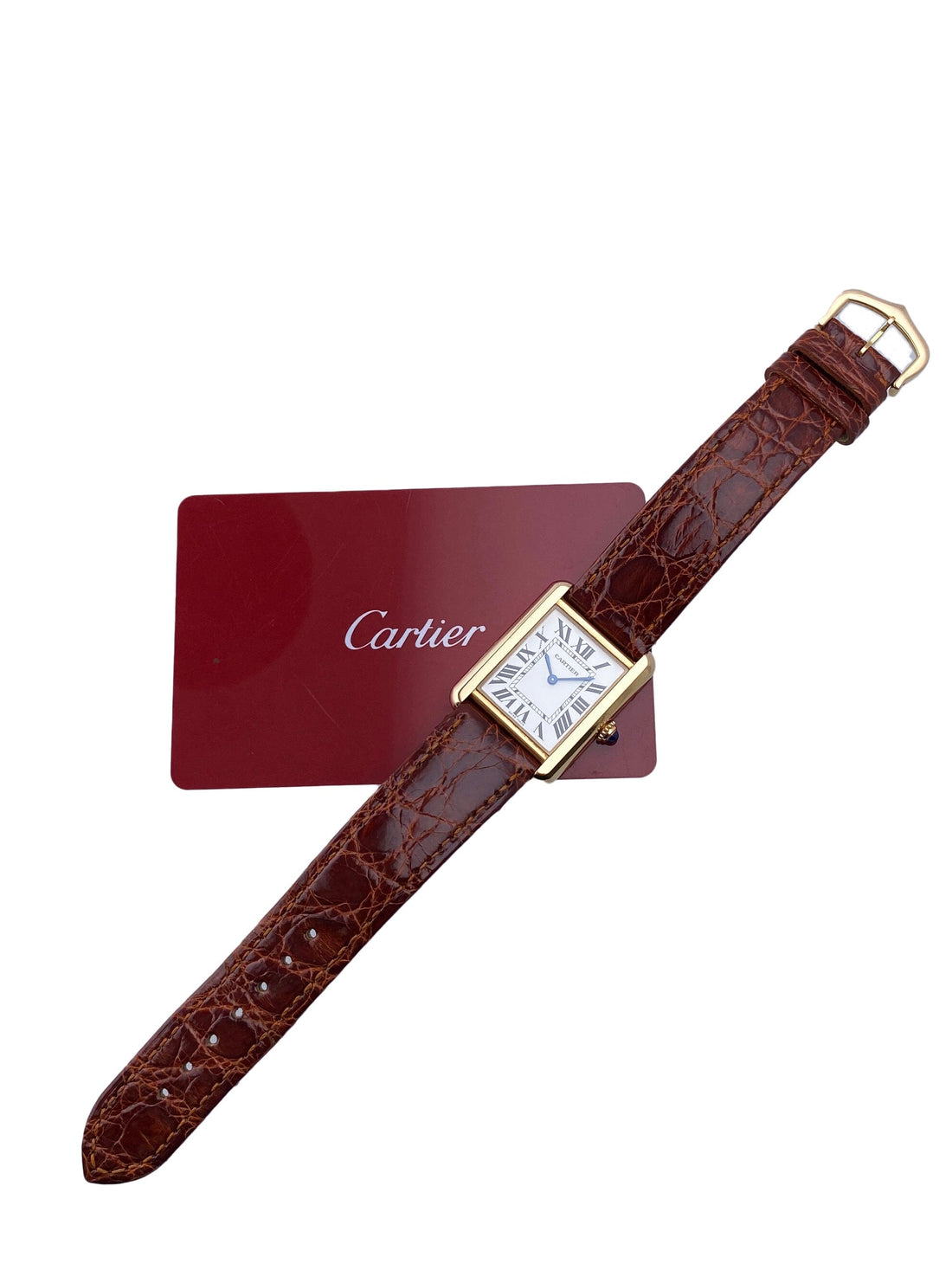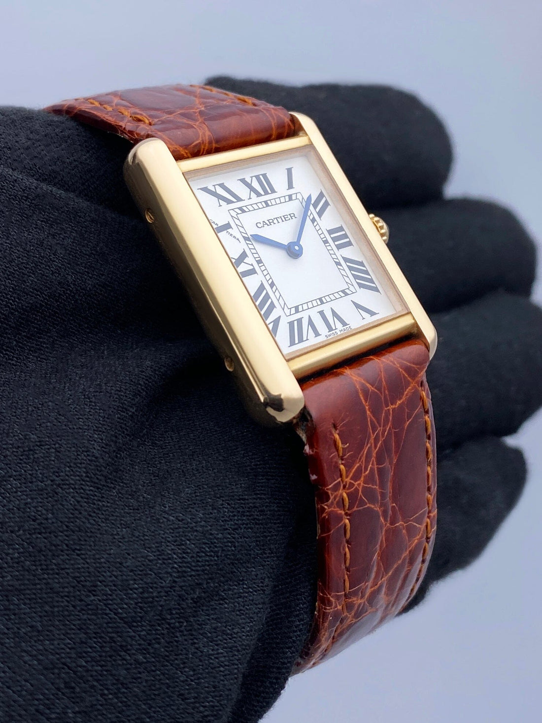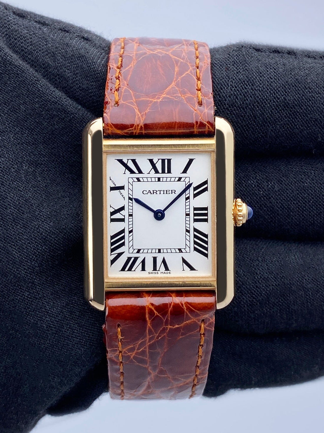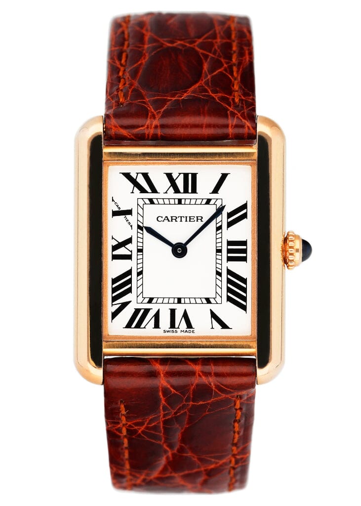 Cartier Tank Solo W5200024 / 3168 Ladies Watch. 24mm 18K rose gold case. Sliver dial with blue steel hands and Roman numeral hour markers. Minute markers on the inner dial. Brown leather strap with 18K rose gold buckle. Will fit up to a 7-inch wrist. Sapphire crystal. Stainless steel case back. Quartz: Battery powered movement. This watch comes with original Box and Papers.