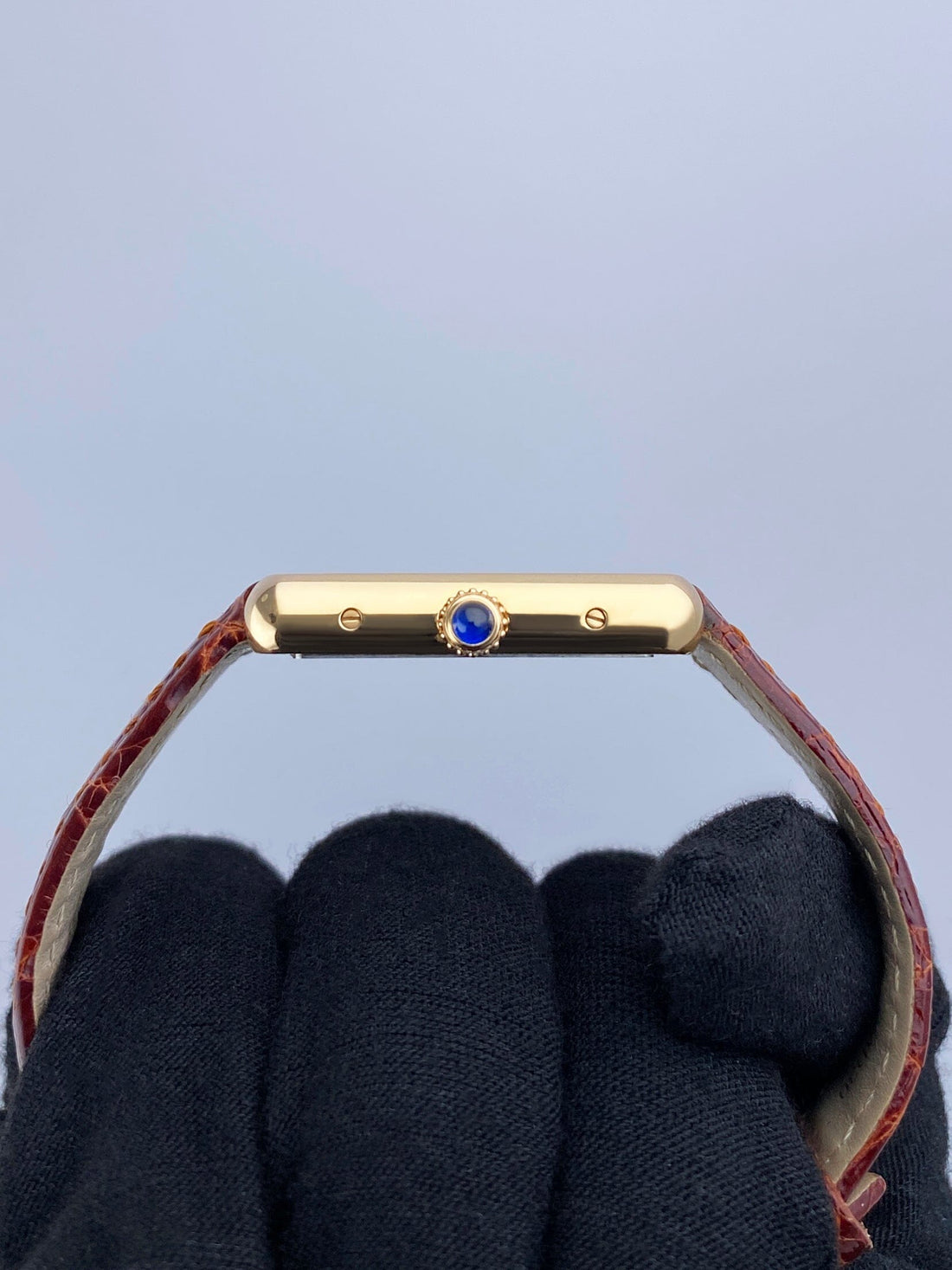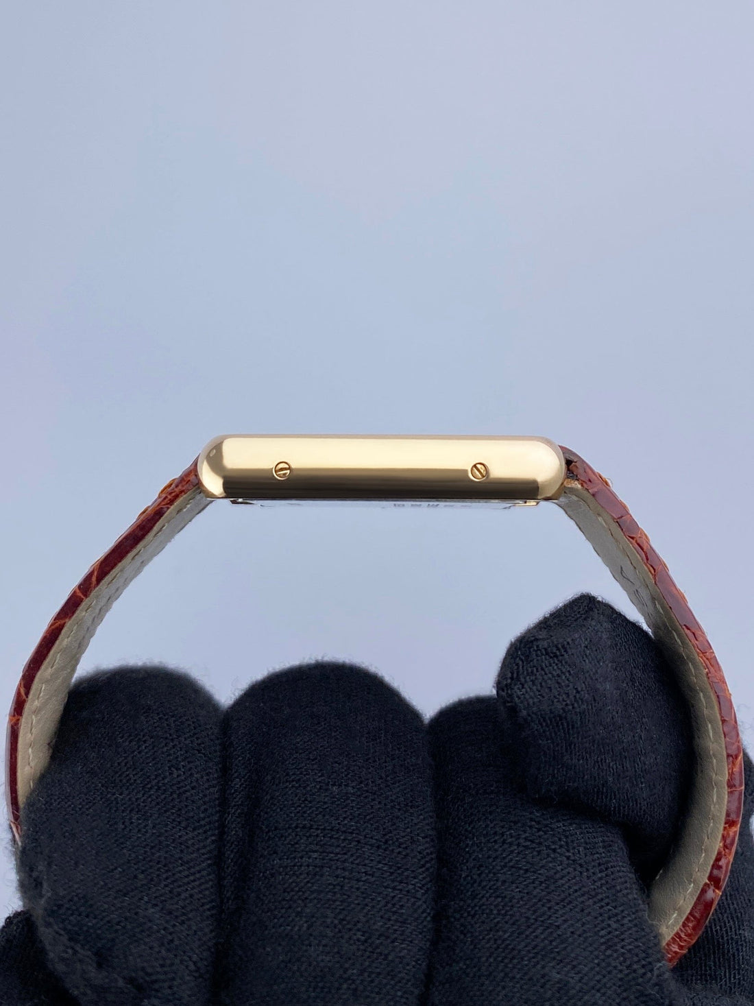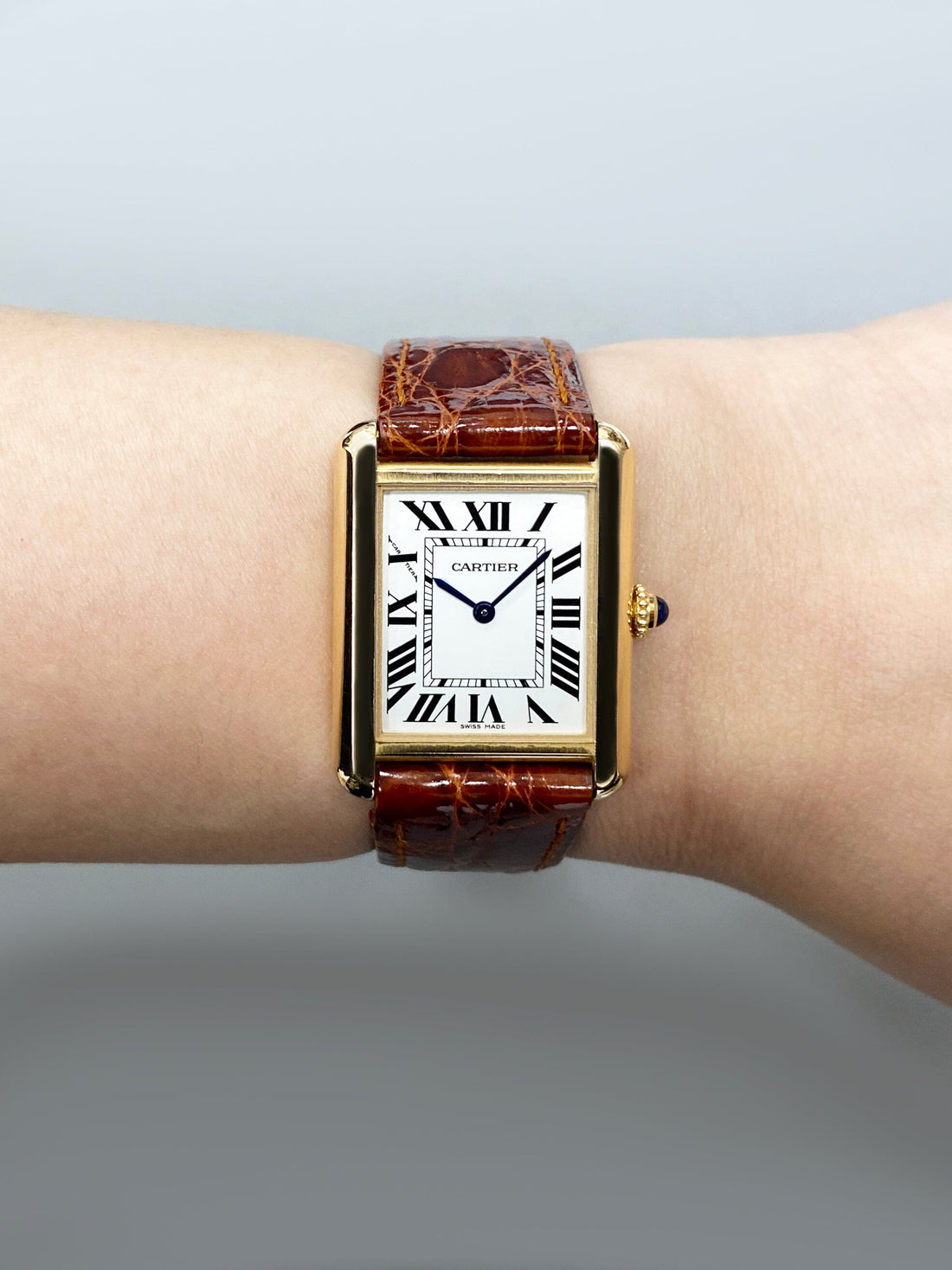 Cartier Tank Solo W5200024 / 3168 Ladies Watch. 24mm 18K rose gold case. Sliver dial with blue steel hands and Roman numeral hour markers. Minute markers on the inner dial. Brown leather strap with 18K rose gold buckle. Will fit up to a 7-inch wrist. Sapphire crystal. Stainless steel case back. Quartz: Battery powered movement. This watch comes with original Box and Papers.