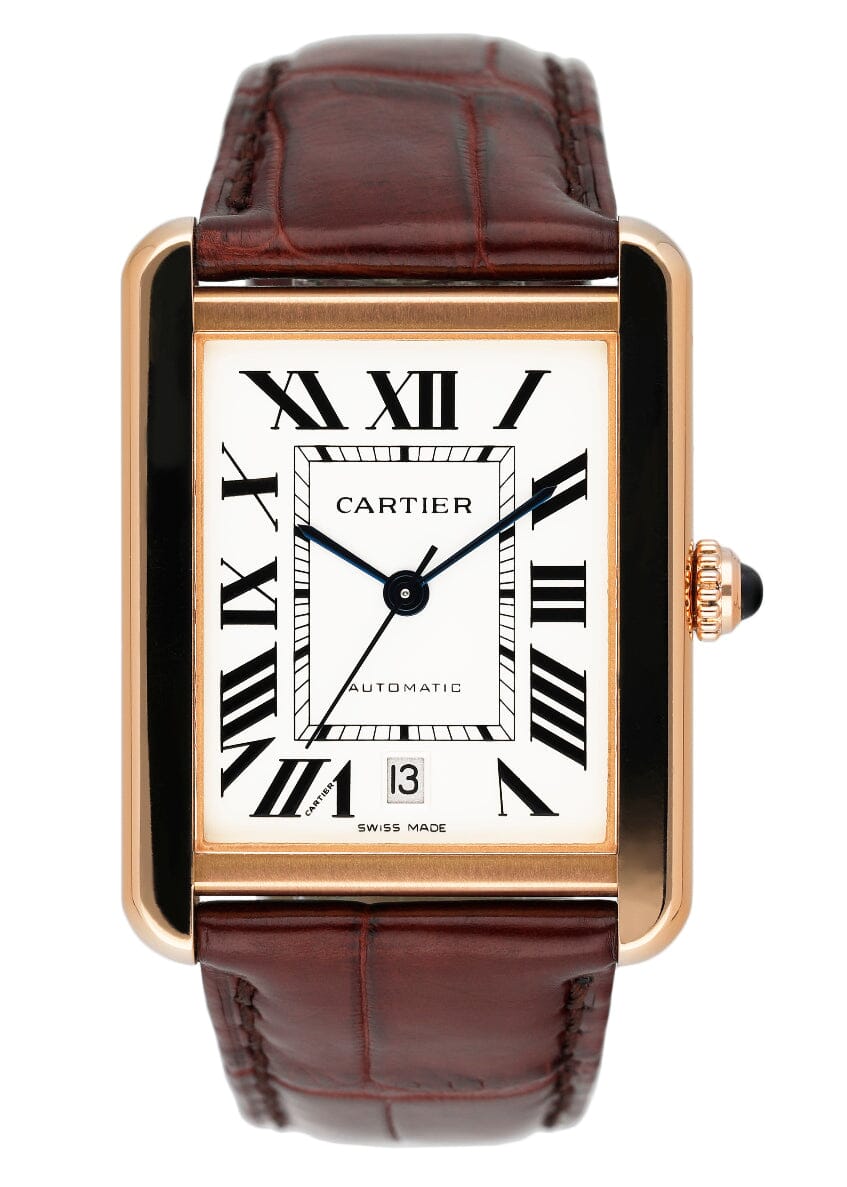 Cartier Tank Solo XL W5200026 / 3514 Mens Watch. 31mm 18K rose gold case. Silver dial with blue steel hands and Roman numeral hour markers. Minute markers around an inner dial. The date is displayed at the 6 o'clock position. Brown leather strap with 18K rose gold buckle. Will fit up to a 7.5-inch wrist. Sapphire crystal. Stainless steel case back. Automatic self-winding movement.