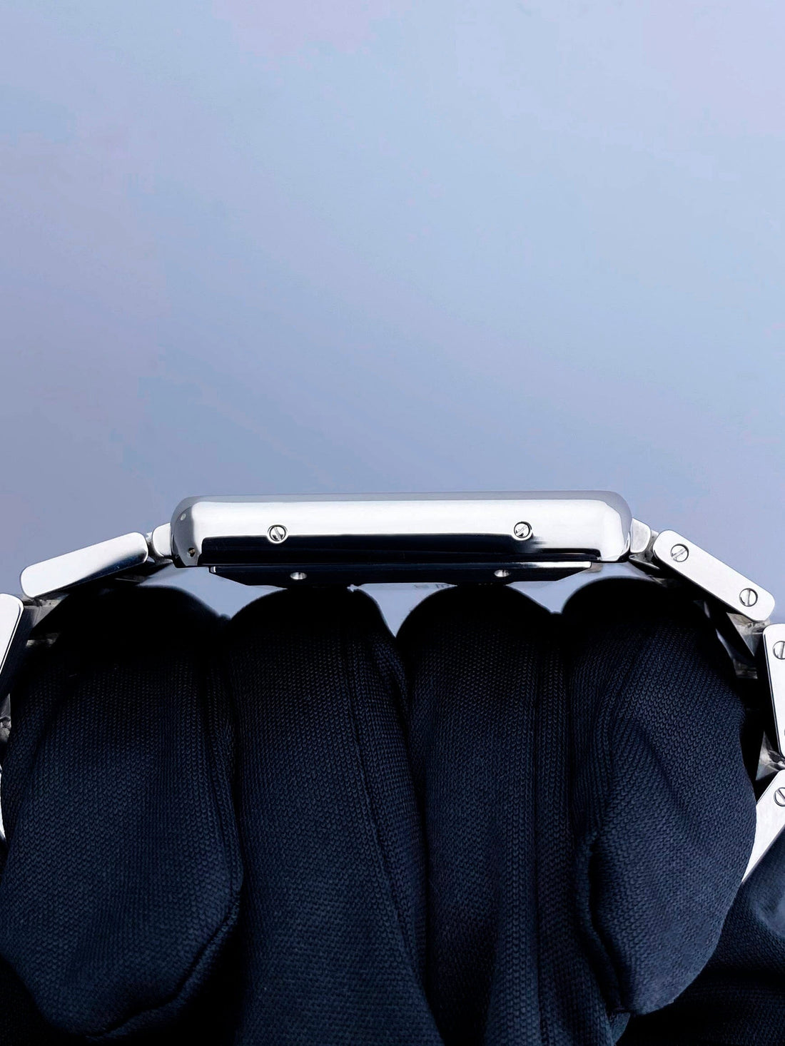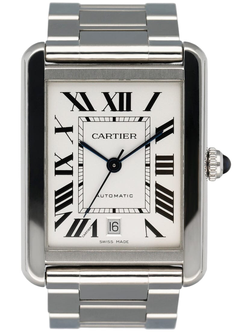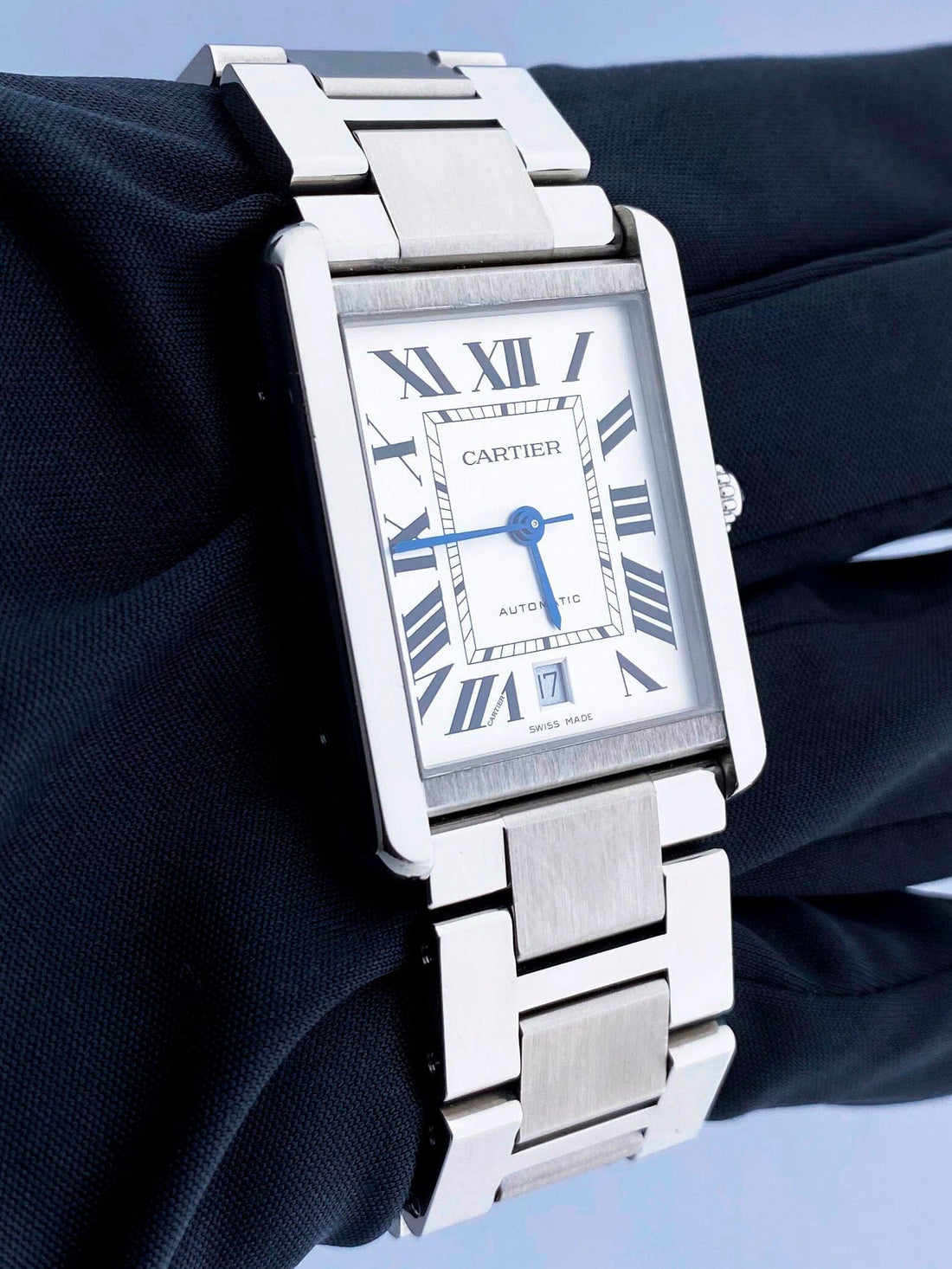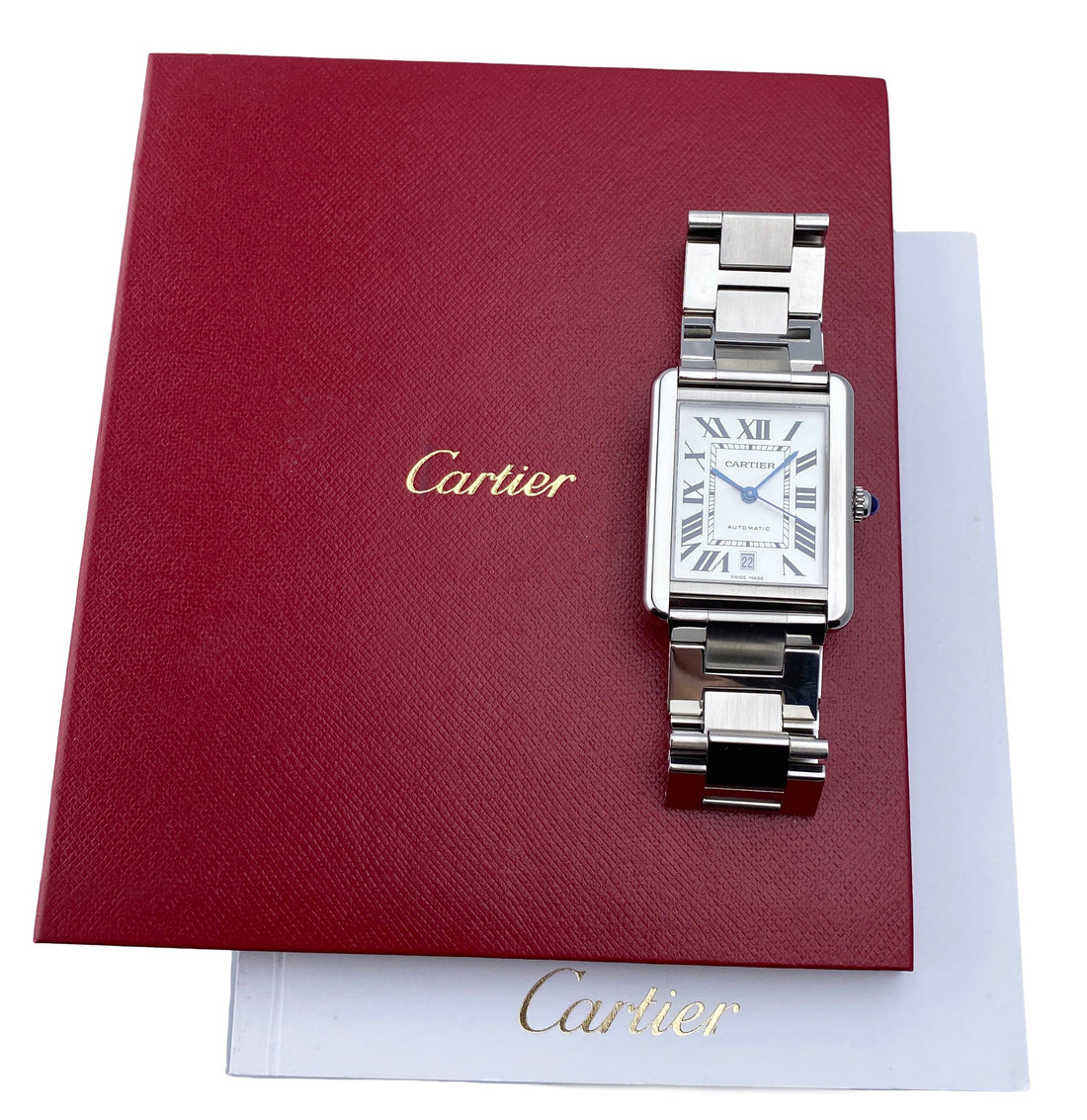 Cartier Tank Solo XL W5200028 / 3800 Mens Watch. 31mm stainless steel case. Silvered opaline dial with blue steel hands and Roman numeral hour markers. Minute markers around an inner ring. Date display at the 6 o'clock position. Stainless steel bracelet with hidden butterfly clasp. Will fit up to a 7-inch wrist. Sapphire crystal. Automatic self-winding movement. This watch comes with original Box and Papers.