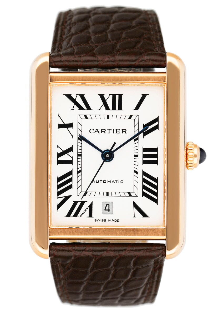Cartier Tank Solo XL W5200026 Mens Watch. 31mm 18K rose gold case with smoothed 18K rose gold bezel. Silver dial with blue steel hands and Roman numeral hour markers. Minute markers around an inner dial. Date display at the 6 o'clock position. Brown leather strap with 18K rose gold buckle. Will fit up to a 7.5-inch wrist. Sapphire crystal. Stainless steel case back. Automatic self-winding movement. This watch comes with original Box and Papers.